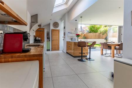 Kitchen Diner Family Area - This is an impressive and practical area. Folding doors from the hallway lead to an area which could be used as your dining space, featuring a high level double glazed window to the front and evenly spaced sky lights. To rear of the space is a modern contemporary kitchen with a range of base units with wooden work tops, an inset sink and a dark tiled splash back. Above is a further sky light providing natural light. There is a range of built in appliances including a Miele oven, electric four zone hob, a single gas burner hob, and a designer cooker hood. Space is provided for an American style fridge freezer. A useful cupboard to the rear serves as a pantry space. A double glazed door leads to the garden. A very useful peninsula with deep storage drawers underneath and a white quartz worktop provides further working space and a breakfast bar, with two modern pendant lights above. Beyond this is open to a wonderful further family space with impressive double glazed bi fold doors across the back of the room leading out to the garden. The flow from one area to the next is seamless making this an amazing social space.