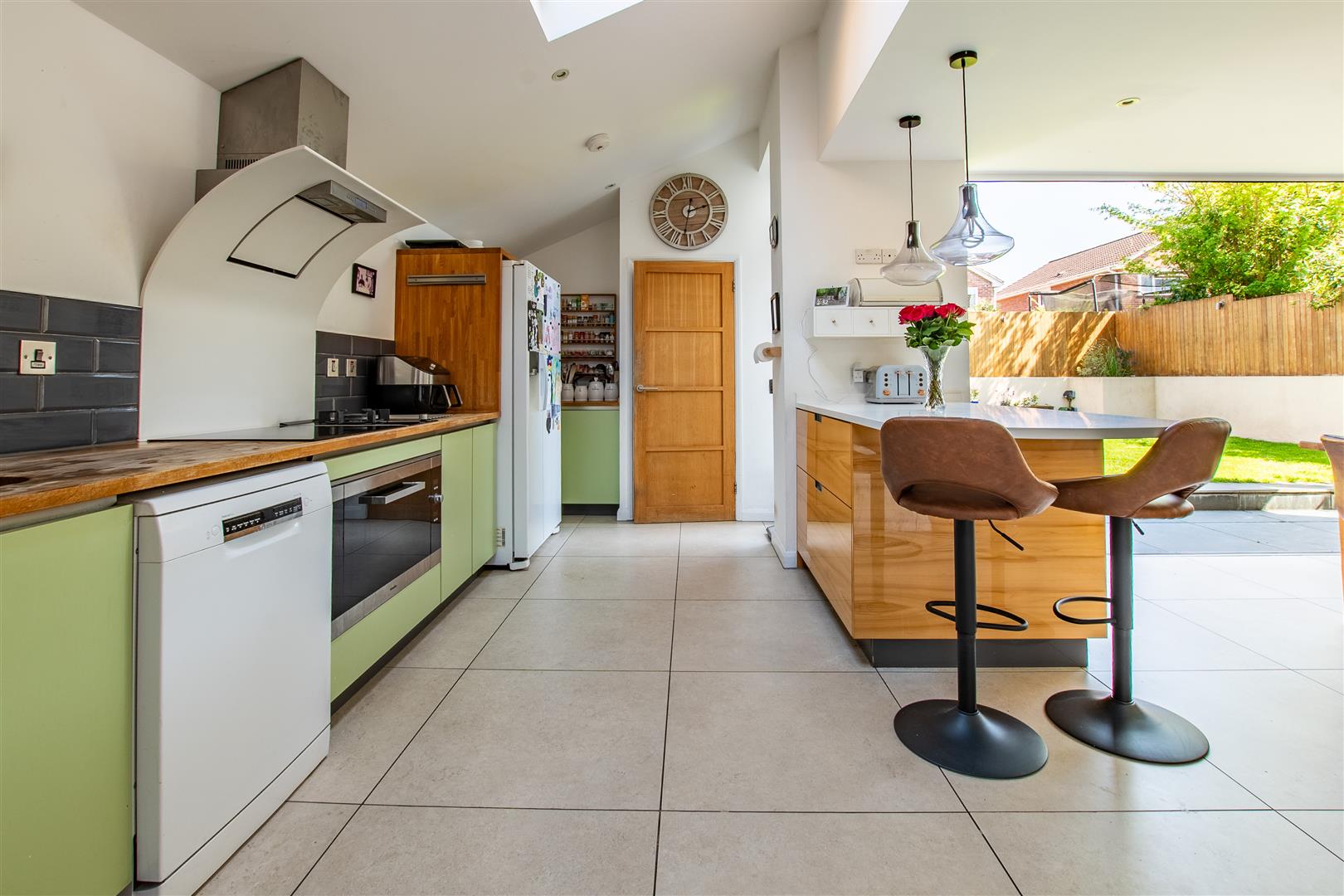 The bi-fold doors open up to a beautifully maintained garden, allowing for a seamless transition between indoor and outdoor living. This feature not only enhances the natural light within the home but also creates an ideal setting for summer gatherings or quiet evenings.