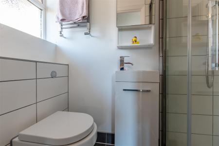 Ensuite - Entry into the bedroom takes you to the open plan ensuite area which has a row of full height wardrobes. The ensuite has a glass shower cubicle with a folding door and a rainfall shower , Vanity basin with a mixer tap and an enclosed coupled toilet. Part tiled walls. Skylight.