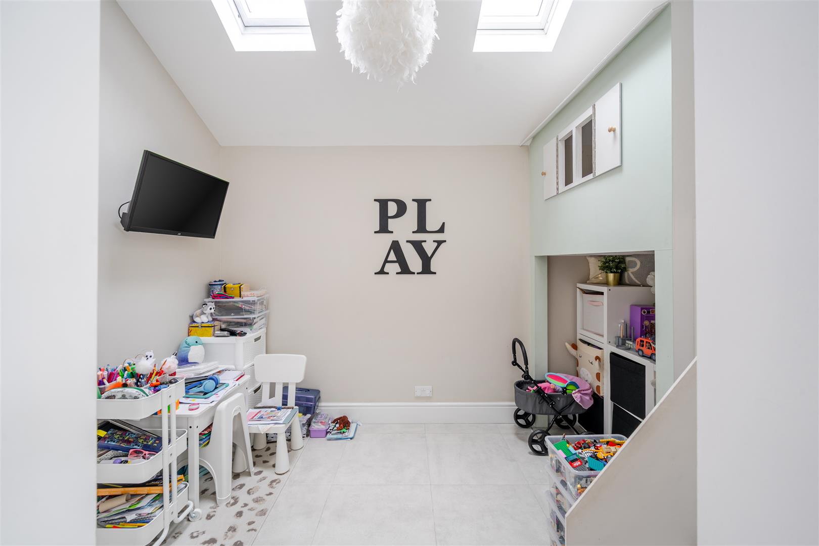 Playroom/Study - 5.1m x 2.2m (16'8" x 7'2" ) - to maximum points. Electric velux windows, doors to utility room and WC. Built in play equipment, spotlight lighting, tiled flooring, underfloor heating, and power points.