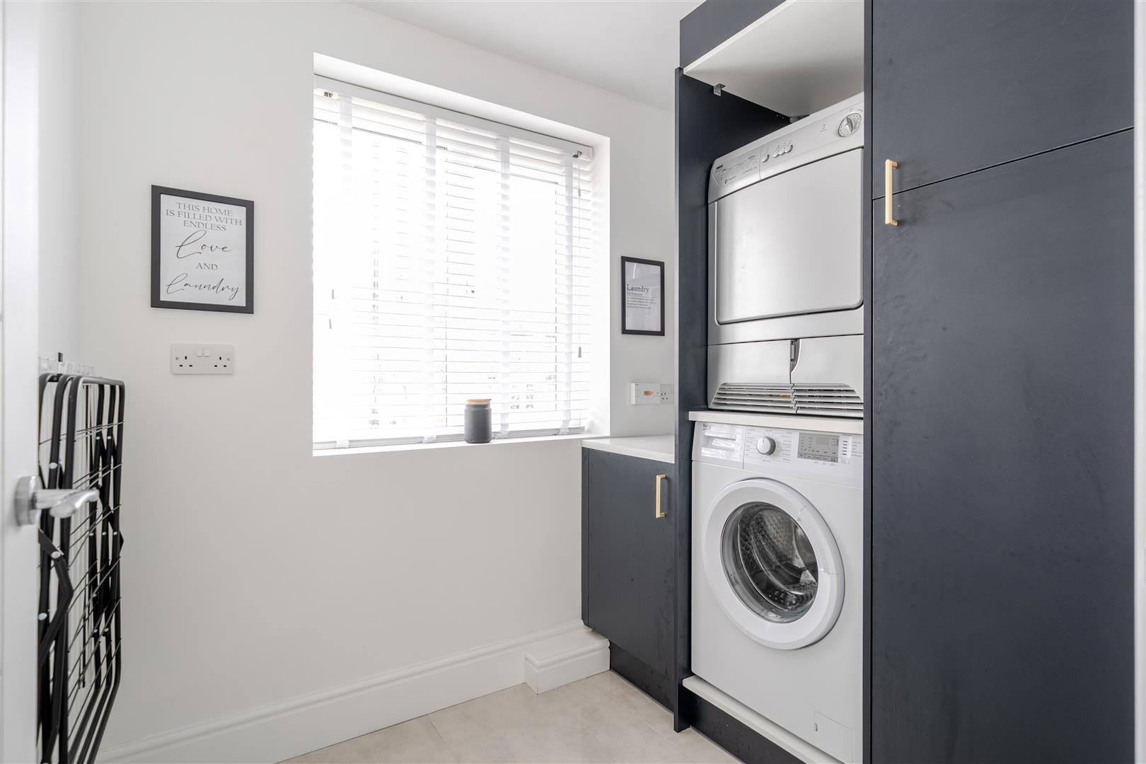 Utility Room - 2.2m x 1.8m (7'2" x 5'10" ) - Double glazed window to front aspect, matching fitted units with spaces and plumbing for washing machine and tumble dryer. Extractor fan, spotlight lighting, tiled flooring, underfloor heating, and power points.