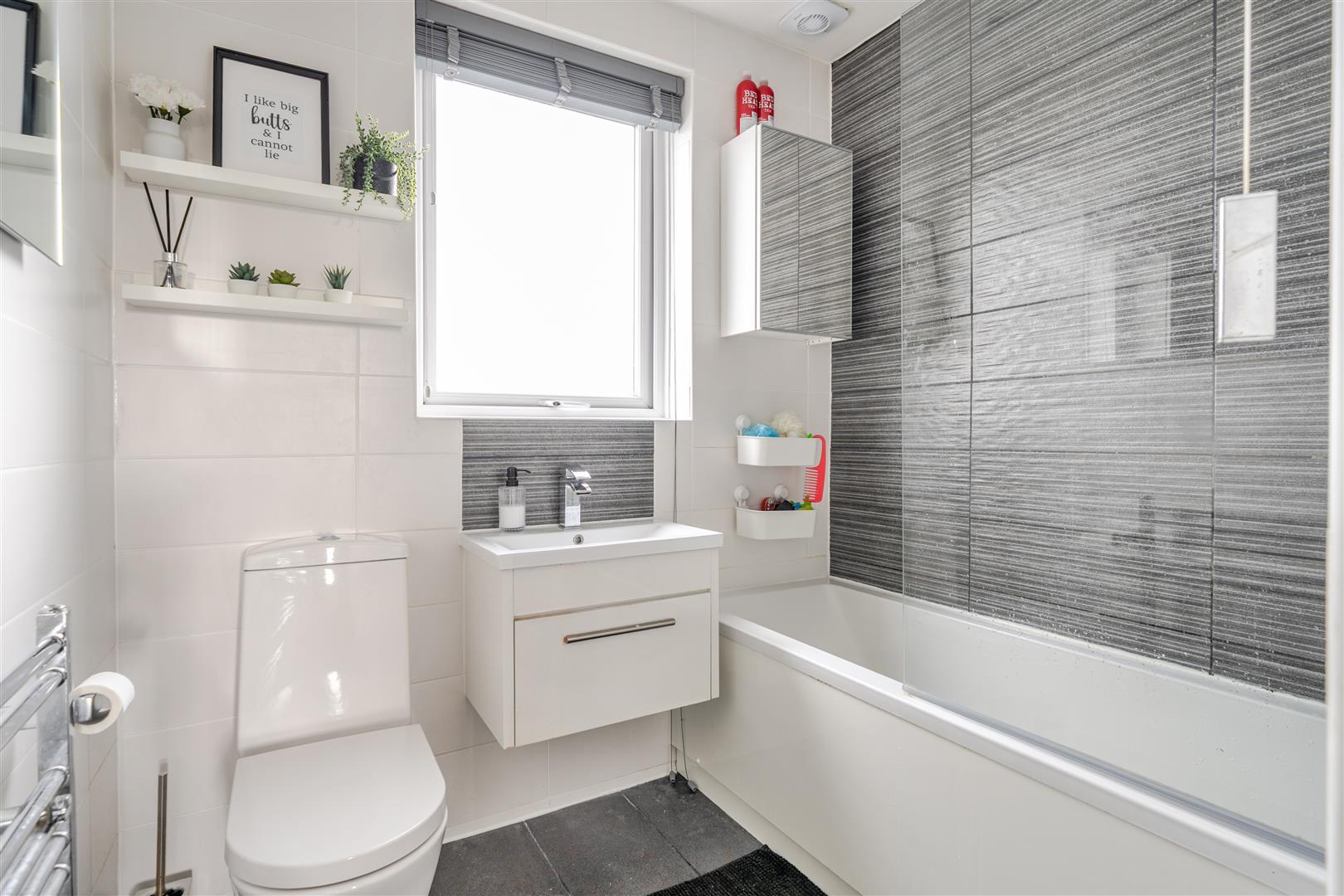 Bathroom - 2.1m x 1.7m (6'10" x 5'6" ) - Double glazed obscured window to rear aspect, panelled bath with mixer tap and shower off mains over and a glass shower panel. Wash hand basin with drawer below and a mixer tap over, low level WC, fully tiled walls and flooring. Light up mirror, spotlight lighting and a heated towel rail.