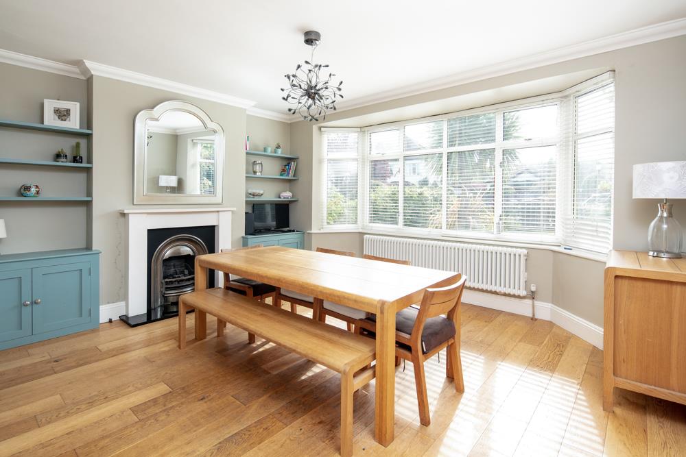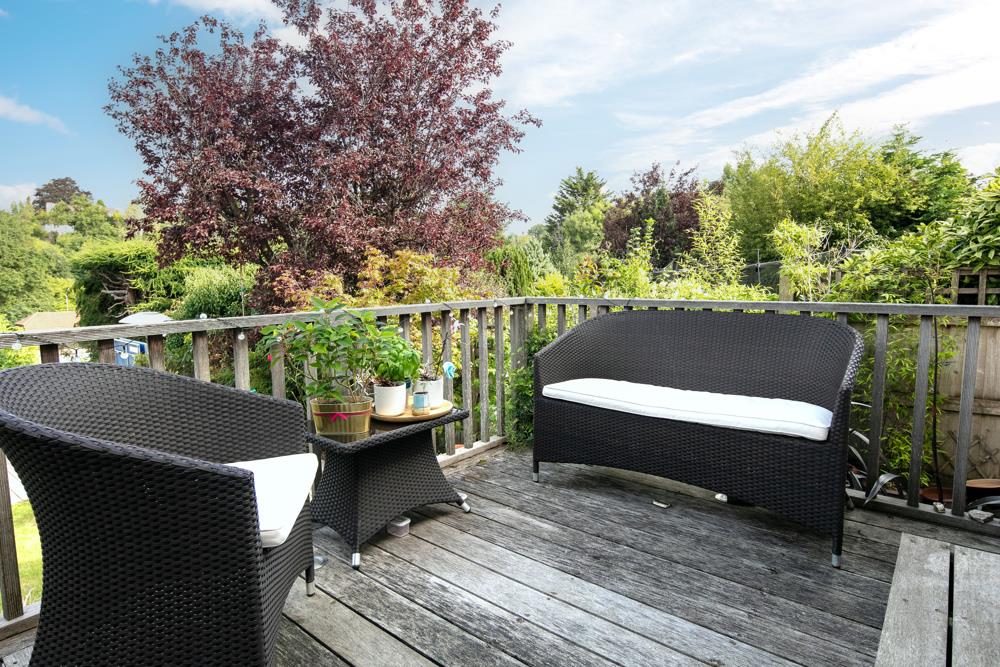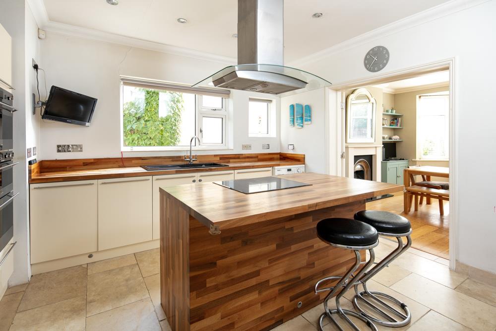 The front door opens to an entrance vestibule offering very useful storage cupboards and hanging for coats. As with the rest of the accommodation, the hallway is large and bright and has doorways to the Dining, Kitchen and sitting rooms, as well as the cloakroom with WC and basin. The sizable dining room, which boasts a bay window to the front aspect allowing natural light to flood the room, has large double doors into the beautifully appointed kitchen. The large sitting room with its far-reaching views across the garden and beyond to the Blaise Estate, opens to a lovely, raised deck with balustrade and handrail overlooking the garden.