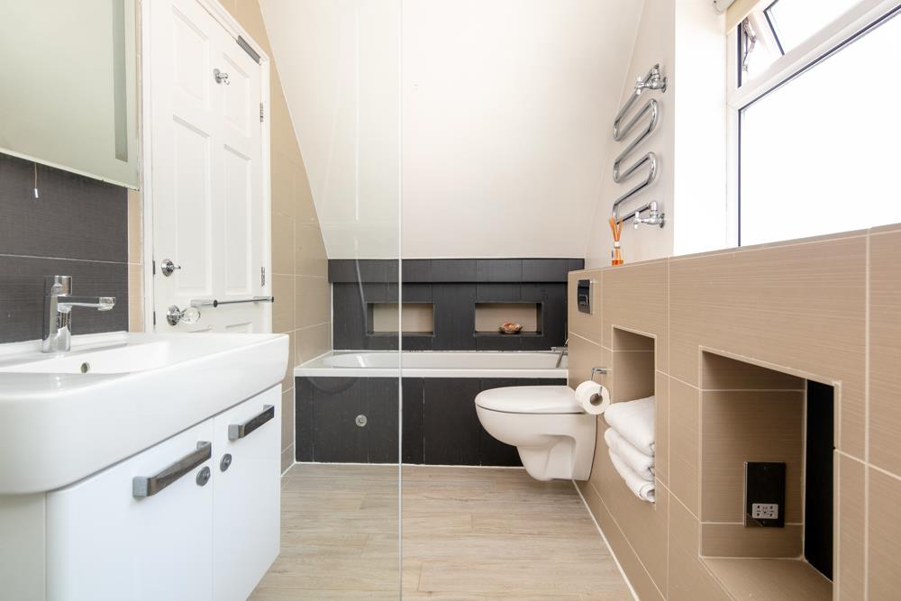 The stairs ascend to the first-floor landing which is generous in size and gives access to the three good sized double bedrooms and the contemporary family bathroom. The master bedroom benefits from the attractive bay window to the front aspect allowing the morning light to cascade in. The second bedroom has far reaching views, and the third is generous with ample built-in storage. From the landing there is a large access to loft, which subject to obtaining the necessary consents could be suitable for a loft conversation.