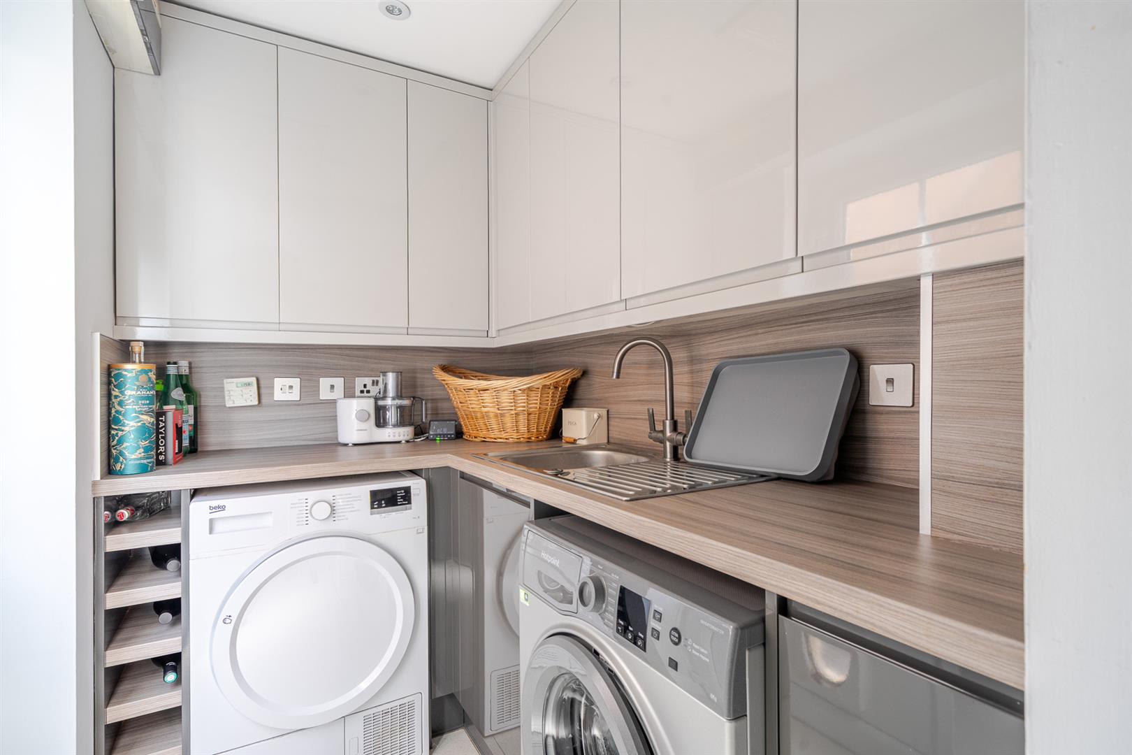 Utility Room - 2m x 1.4m (6'6" x 4'7" ) - Door to side aspect, high gloss wall and base units with work surfaces over and space for washing machine and tumble dryer. Sink and drainer with mixer tap over, tiled flooring and power points.