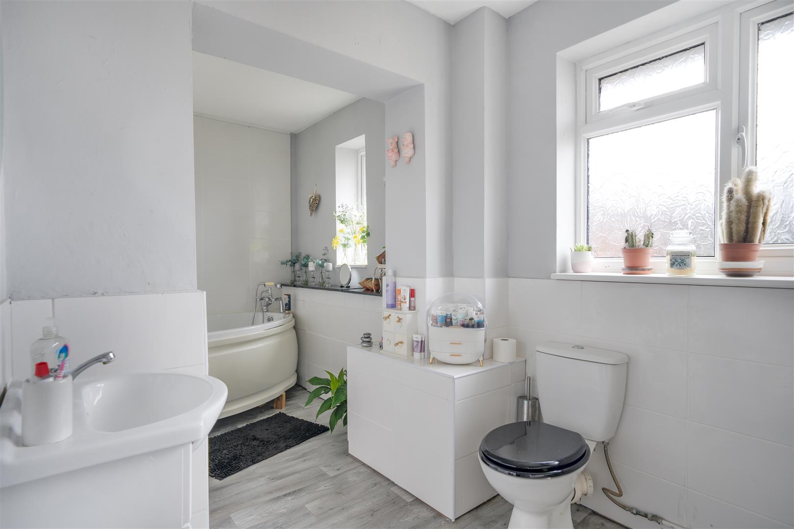 Bathroom - 4.2m x 1.9m (13'9" x 6'2" ) - Double glazed obscured windows to rear aspect, panelled corner bath with tap with shower attachment over, vanity basin unit with mixer tap over and a low level wc. Tiled walls to wet areas and a radiator.