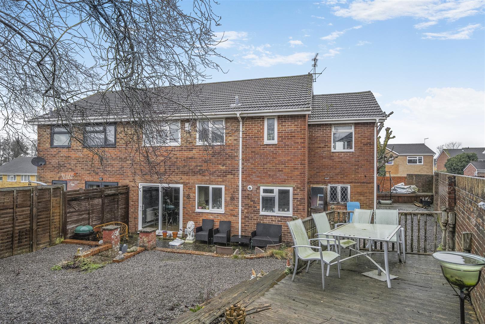 Externally, the property occupies a generous plot. The front garden features a hardstanding driveway with decorative chippings, while the rear garden offers a combination of decorative chippings, patio, and decking areas, providing excellent outdoor seating and entertaining space.