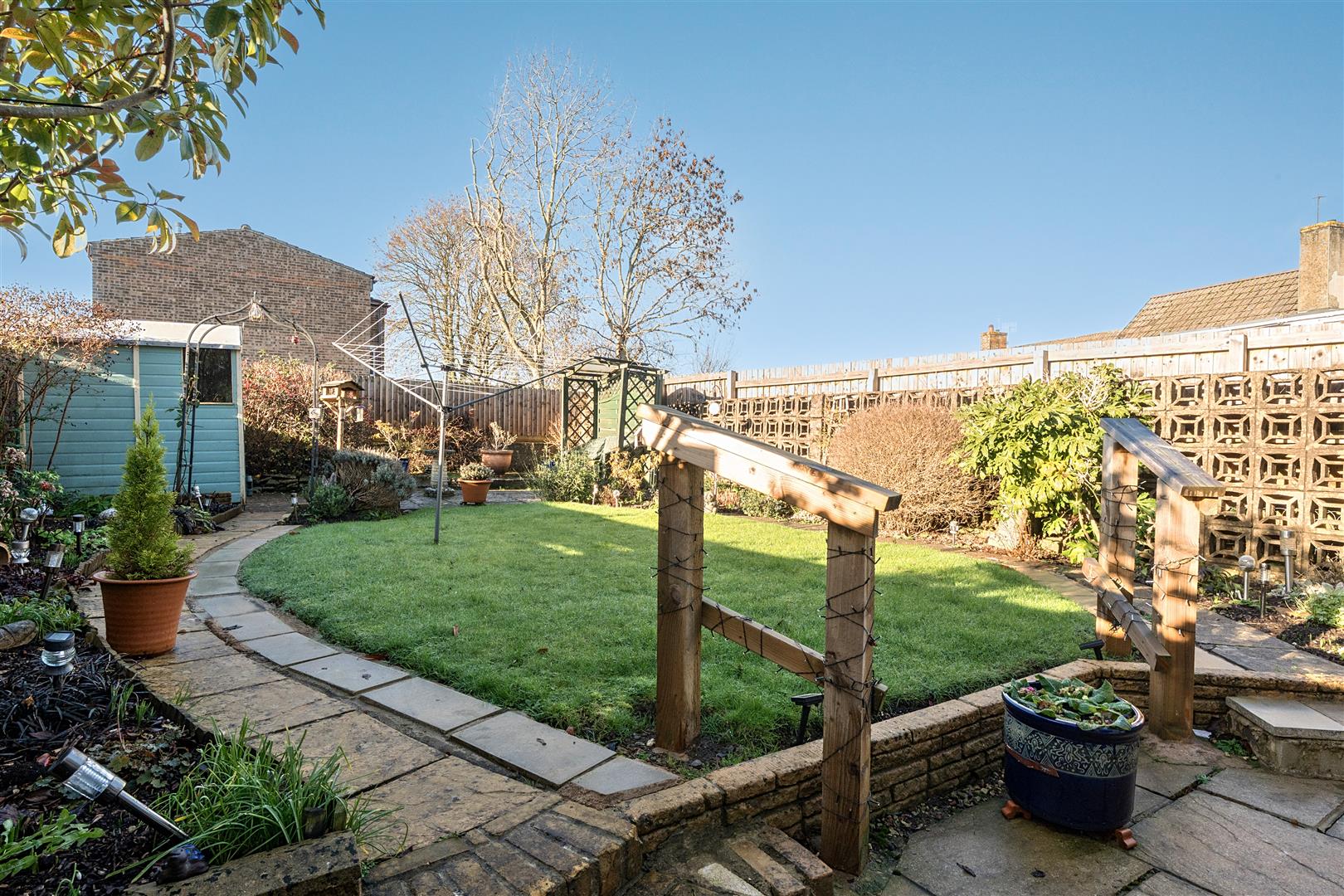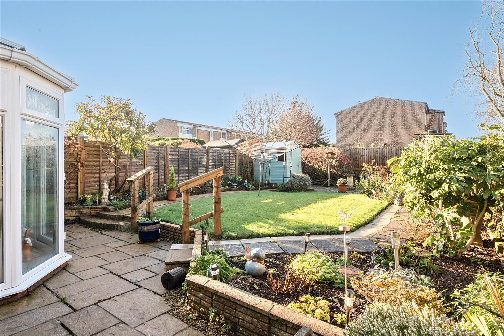 Rear Garden - Landscaped garden of level lawn, patio area for outdoor dining and well stocked flower beds. Mainly fenced boundaries and a timber storage shed.