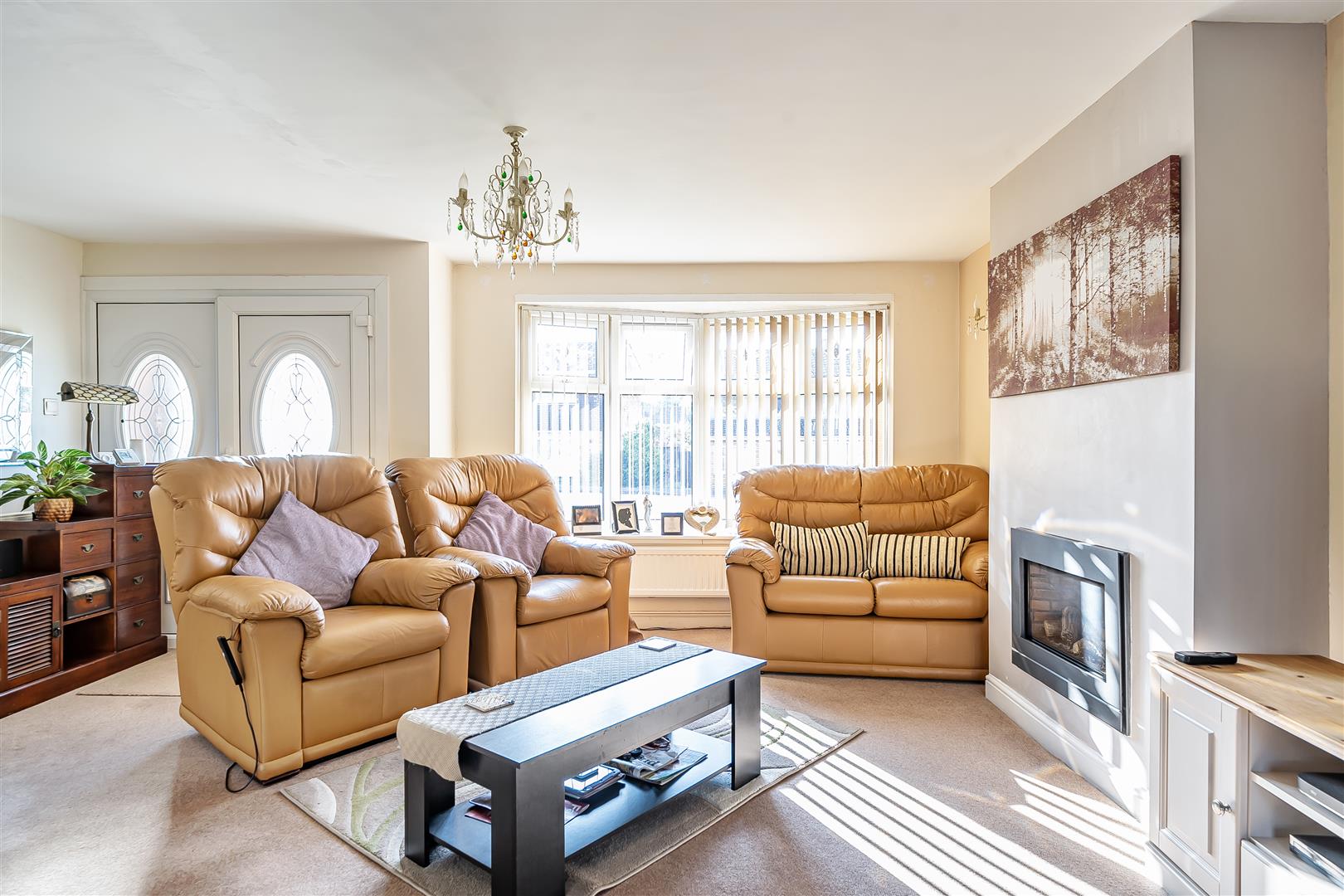 Front Of Property - Mainly laid to level lawn and hardstanding driveway accessed via dropped kerb and providing access to detached garage.