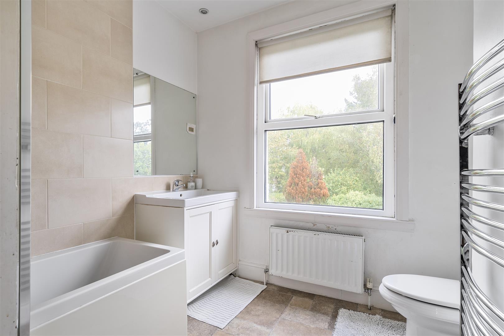 Bathroom - 2.7m x 2.2m (8'10" x 7'2" ) - Double glazed window to rear aspect overlooking rear garden, matching three piece suite comprising wash hand basin with mixer tap over, low level WC with panelled bath with centrally located mixer tap and dual head shower off main supply over, heated towel rail and tiled splashbacks to all wet areas.