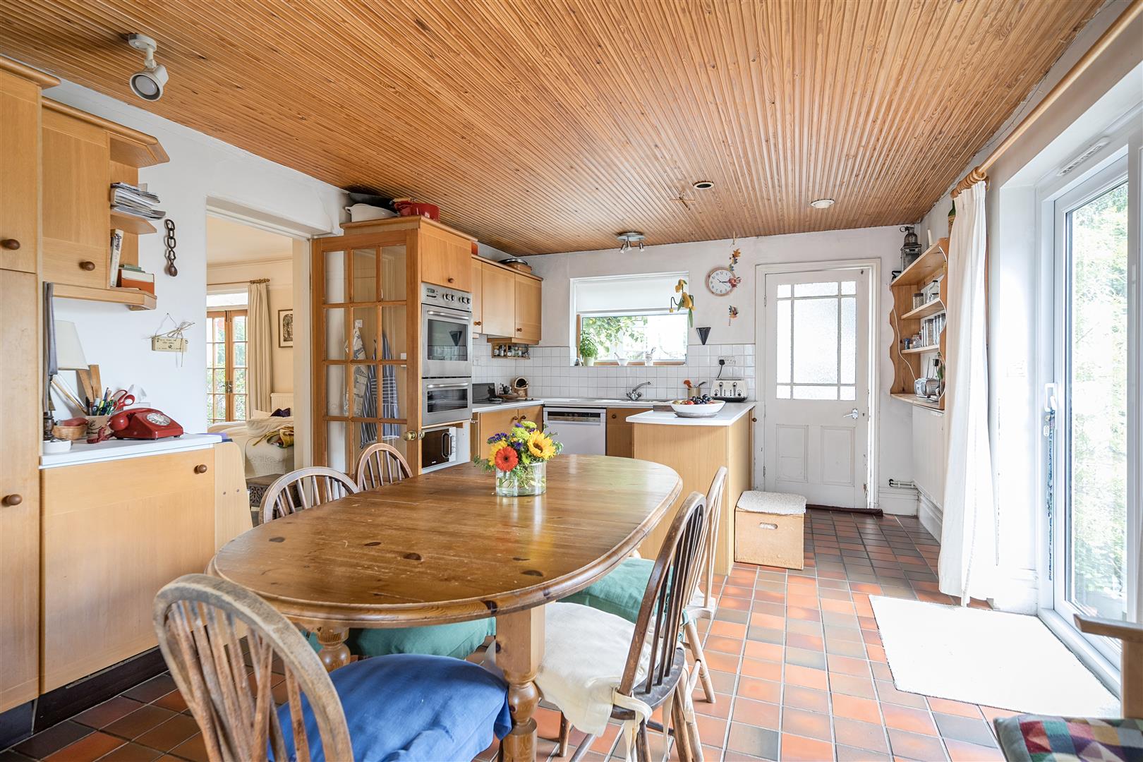 Kitchen/Breakfast Room - 8.2m x 3.8m narrowing to 2.4m (26'10" x 12'5" nar - Double glazed window to rear aspects to conservatory, double glazed French doors to side aspect leading to rear garden and double glazed bay window to front aspect. Kitchen comprising range of matching wall and base units with roll top work surfaces, bowl and a quarter stainless steel sink with mixer tap over, integrated double electric oven and four ring electric hob, integrated fridge, space and plumbing for dishwasher, radiators, power points, tiled splashbacks to all wet areas and door leading to Utility room.