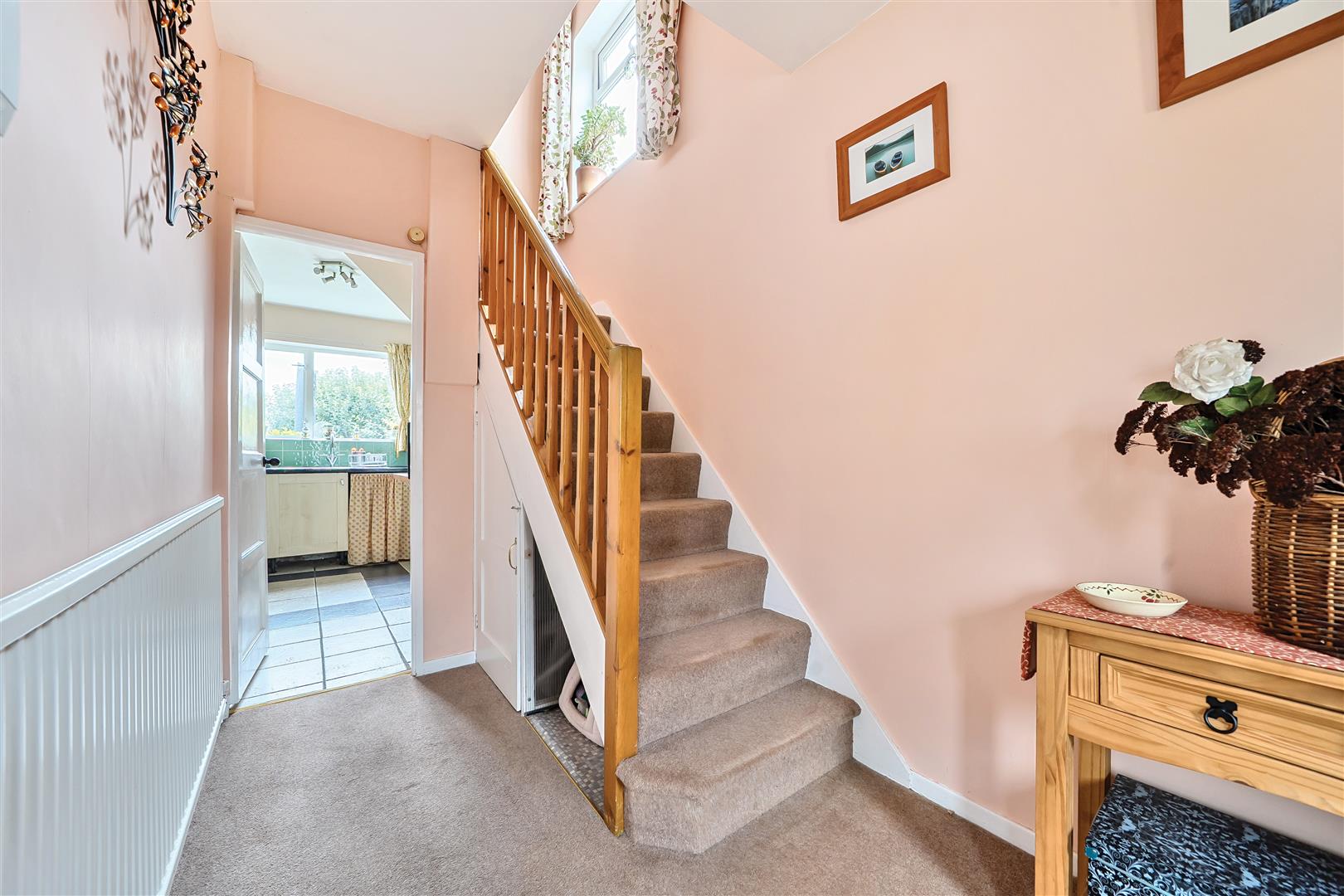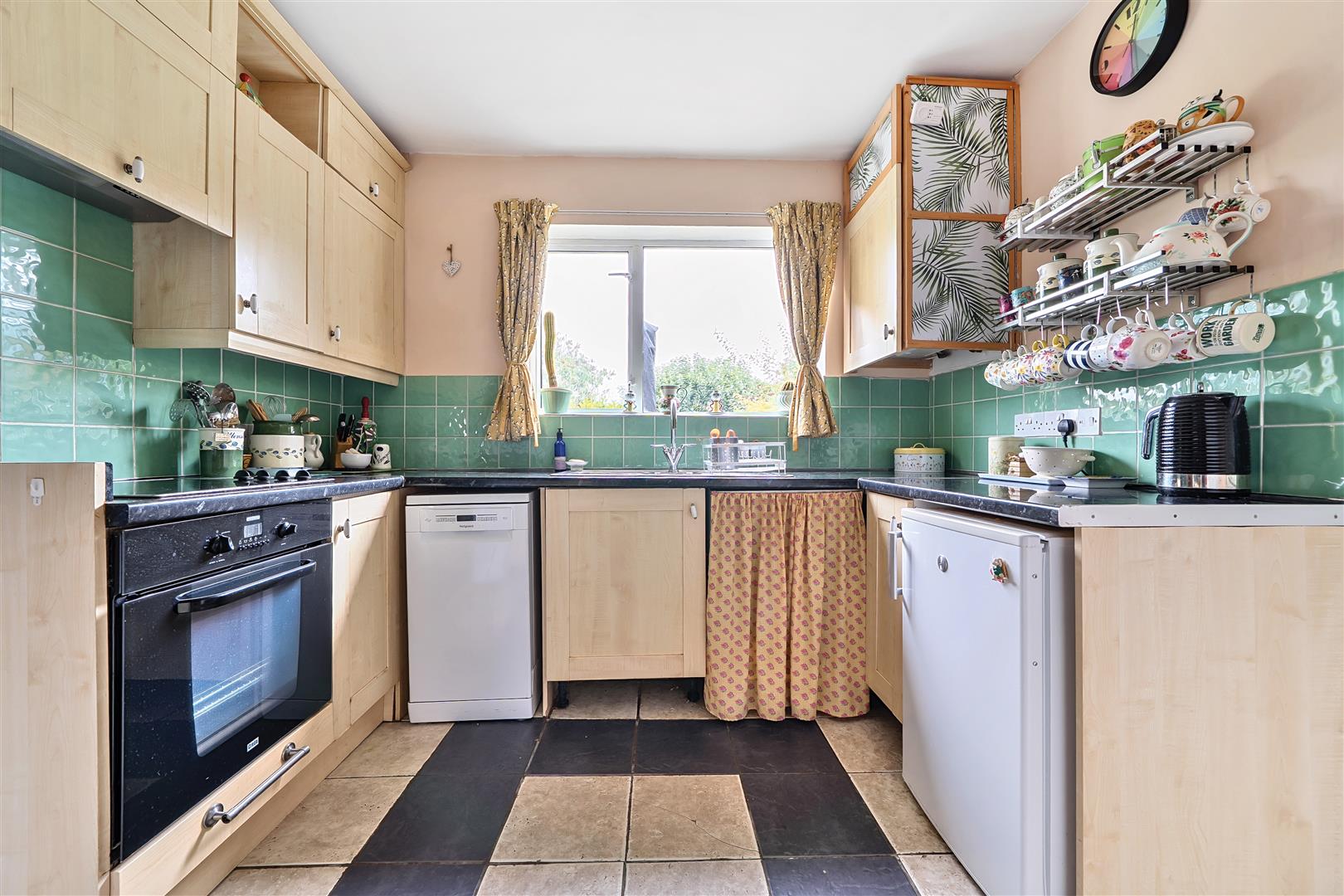 At the end of the entrance hall is the kitchen benefitting a large window flooding the space with natural light and views out onto the greenery beyond. The kitchen itself profits plenty of storage cupboards and workspace perfect for meal prep.