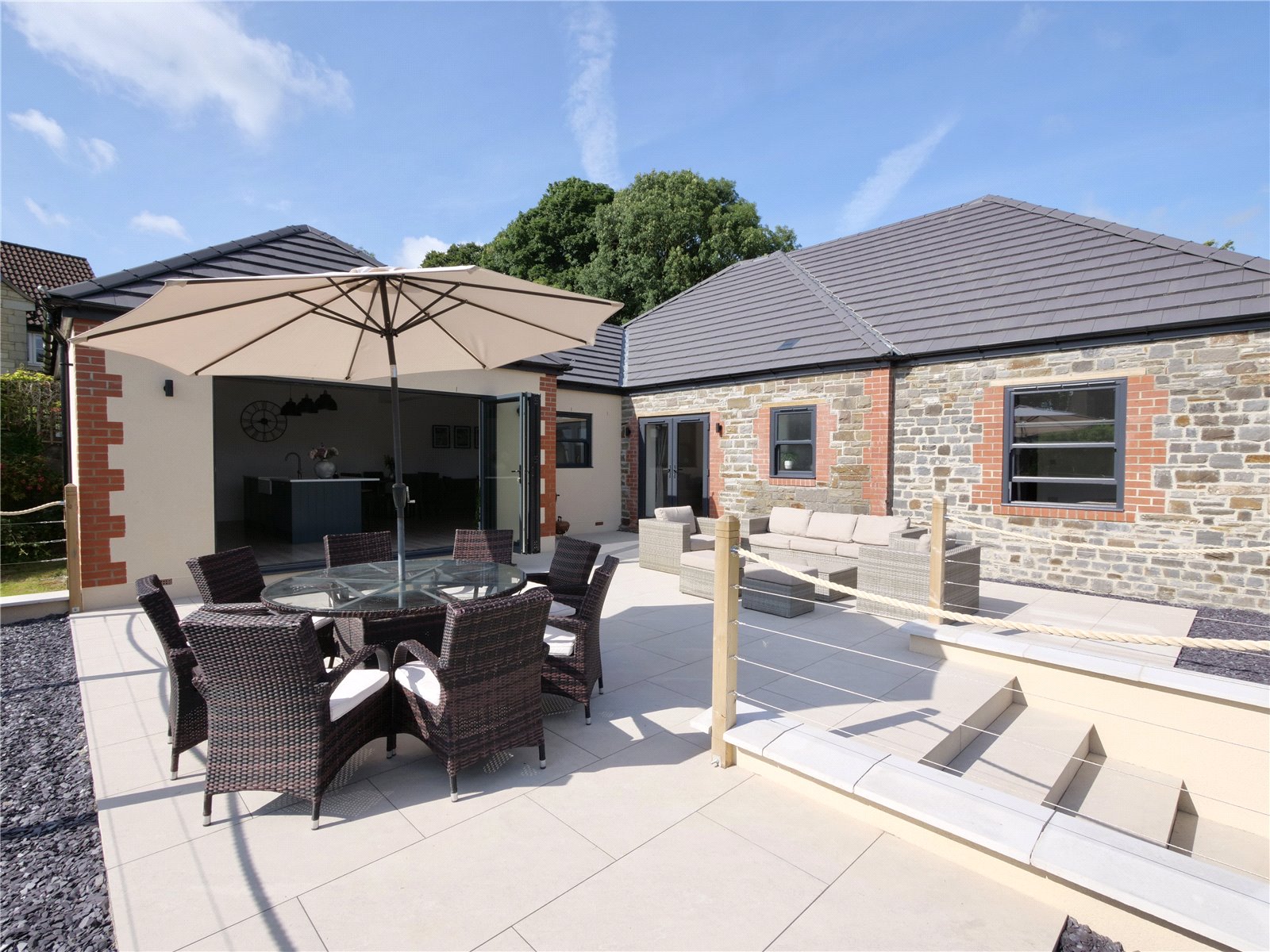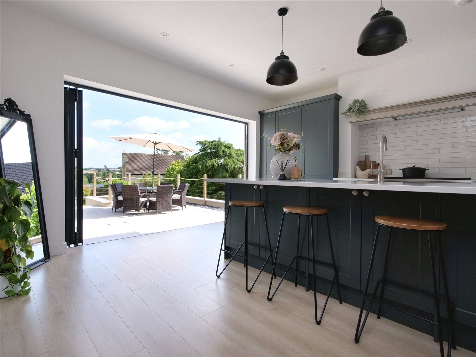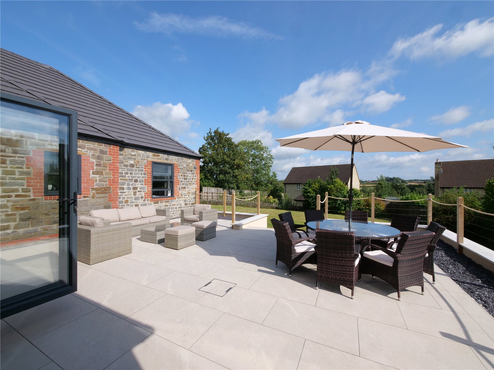 A stunning contemporary single storey residence on the edge of Temple Cloud, with four double bedrooms, large kitchen/dining room with bi-fold doors onto a paved terrace, expansive gardens and double garage.