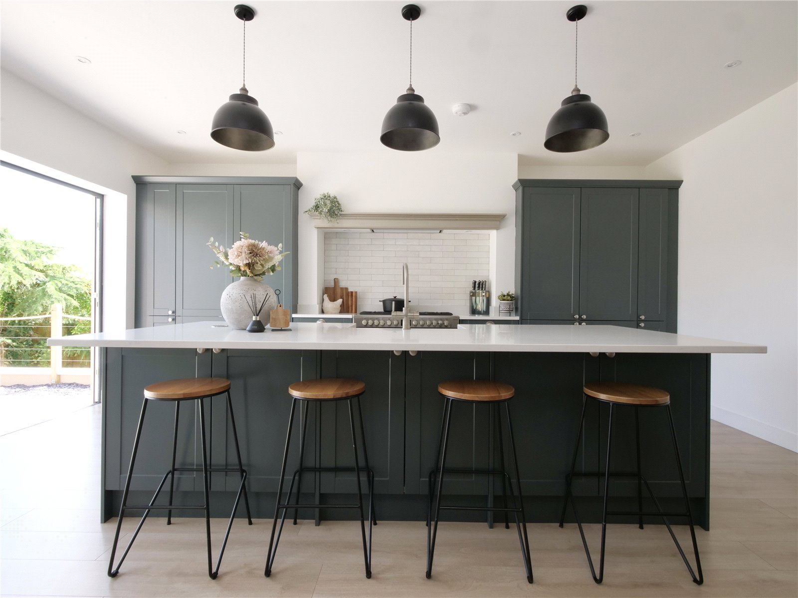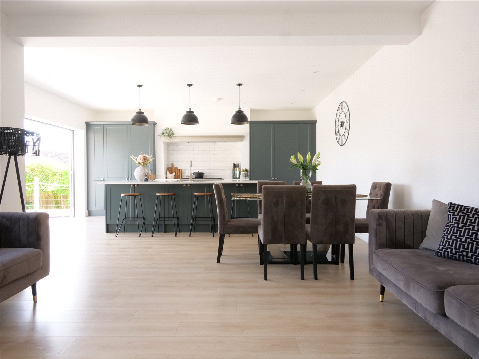 Approached down a gravel path the modest looking entrance in the original part of the cottage opens into an spacious contemporary interior. The L-shaped property has four double bedrooms leading off from a long hallway, and the main living space extending out to the side. Pale oak effect flooring leads you into the expansive open plan kitchen/dining/family room with underfloor heating. The classic shaker style fitted kitchen has been thoughtfully designed with a gas range cooker set between larder cupboards and built-in appliances. A large breakfast island topped with pale silstone worktops and inset Belfast sink sits next to the bi-fold doors which lead out onto a wide terrace, perfect for al fresco dining. There is plenty of room for a large dining table and sofas, creating a perfect space for entertaining. In addition there is a separate living room with French doors onto the terrace.