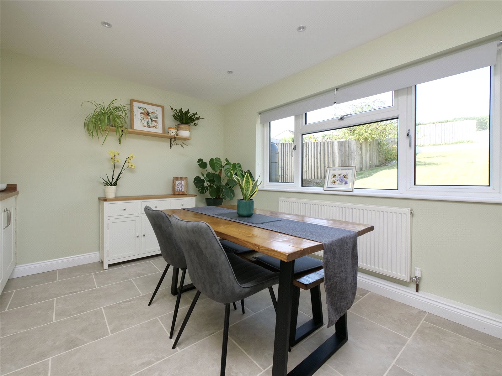 Step into a bright, welcoming hallway leading to a tranquil living room, where a large front window and a charming wood-burning stove create a cosy yet airy space. Across the rear, the spacious kitchen/dining room features stone-tiled flooring, contemporary fitted units, and a practical breakfast bar perfect for casual dining. From here, a door opens to the side passage, linking front and rear gardens. This leads to a newly fitted utility room, a ground floor cloakroom, and a useful storage area.