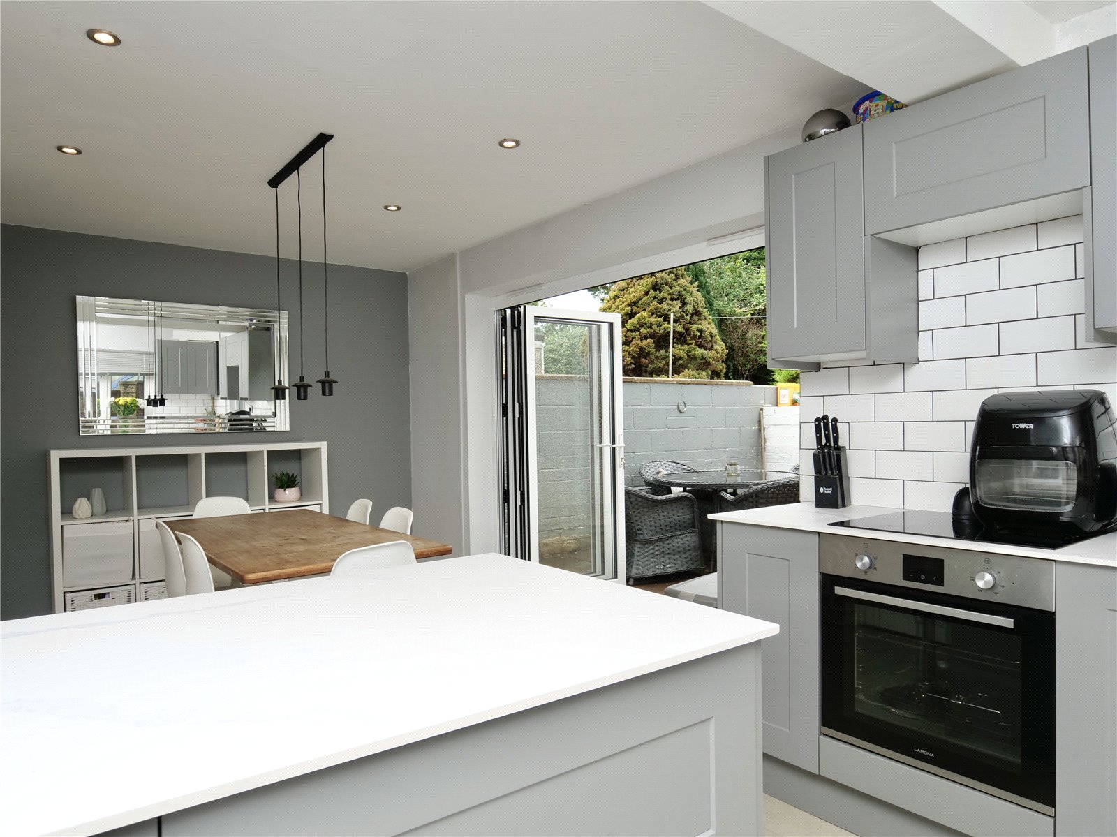 The ground floor accommodation flows well for family living. The large kitchen/dining room offers excellent natural light through bi-fold doors which lead out onto the terrace area. The kitchen is fitted with high specification Howden grey wall and base units decorated with white and grey vein marble effect worktops. Both the white splashback wall tiles and natural flooring also compliment the rooms brightness. Within the kitchen units are integrated oven, hob and dishwasher.