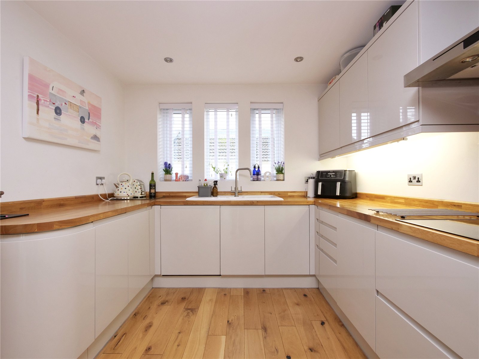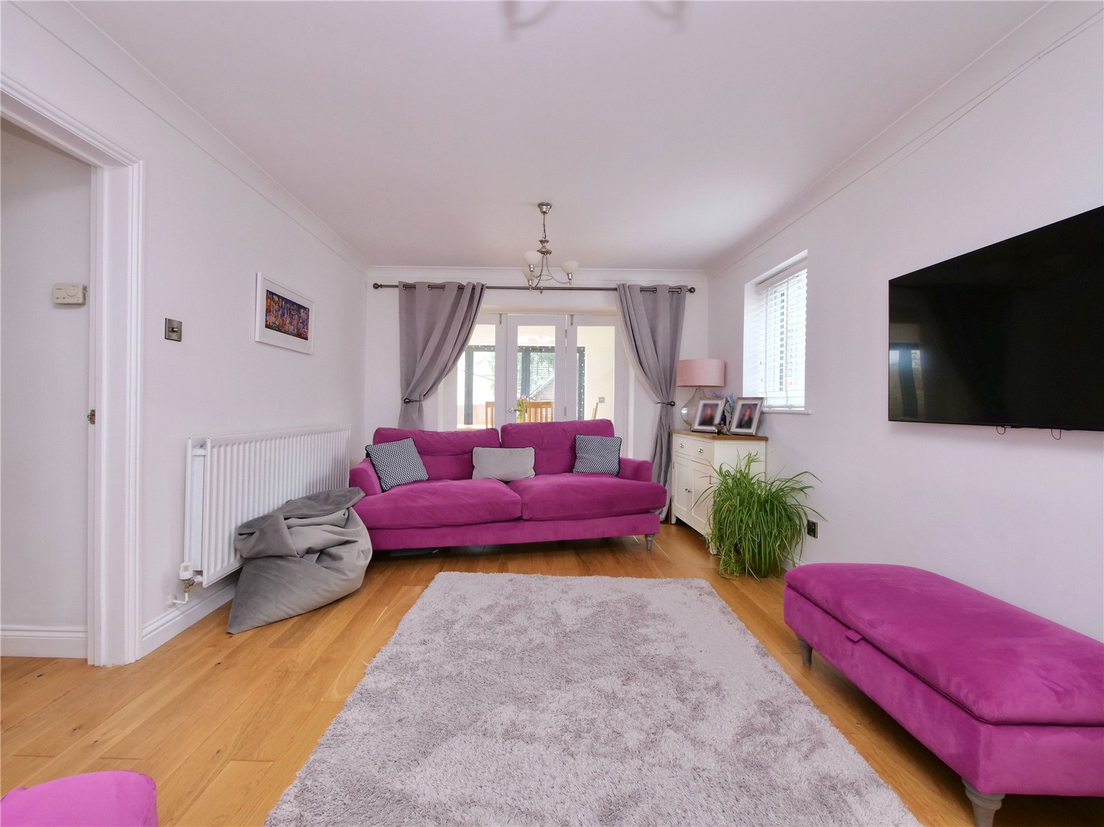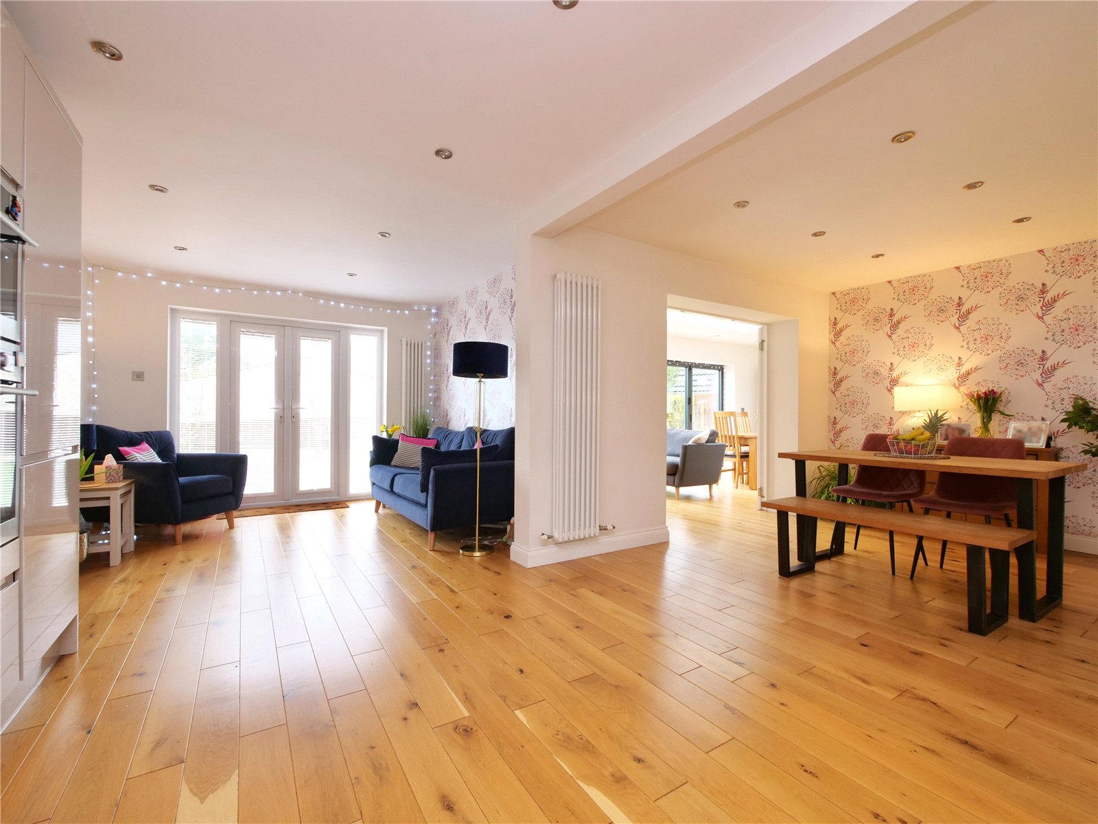 A welcoming entrance hall leads to a spacious triple aspect sitting room featuring a contemporary wood burning stove and bi-fold doors opening into the garden room. The open plan kitchen is fitted with sleek modern units with integrated appliances, flowing seamlessly into the dining area, which also enjoys folding doors into the garden room. A cosy snug offers additional living space and has French doors opening directly onto the terrace. The recently constructed garden room is flooded with natural light from its roof lantern and wide folding doors, creating a wonderful connection to the garden. A utility room provides further access to the garden and into the integral garage.