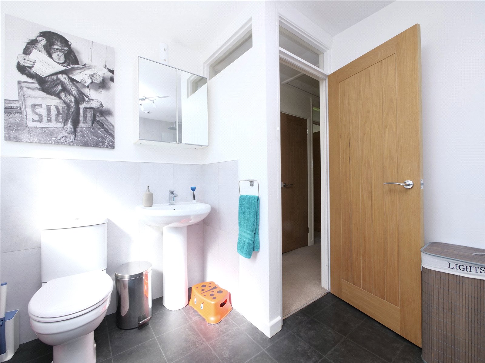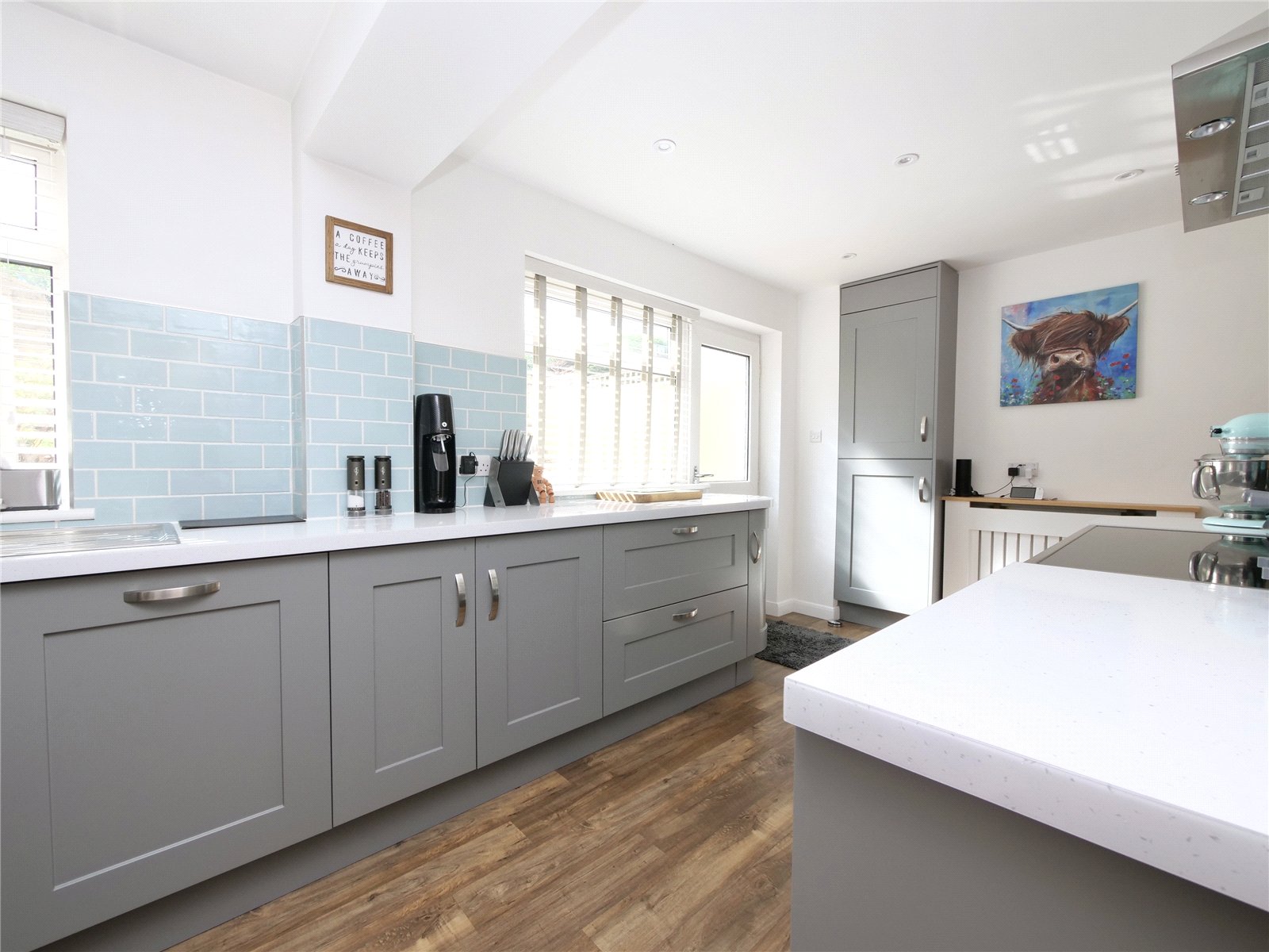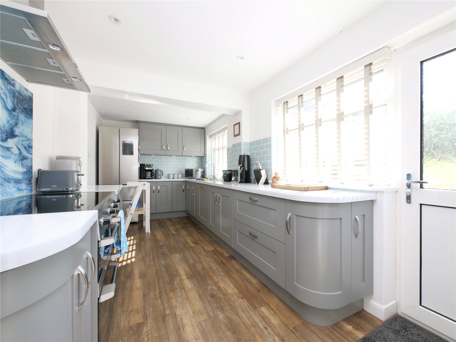 Upstairs, the landing is filled with natural light thanks to a cleverly placed sun tube and stylish glass balustrades. Three well-proportioned bedrooms share a sleek family bathroom, with the principal bedroom benefiting from fitted wardrobes and lovely countryside views.