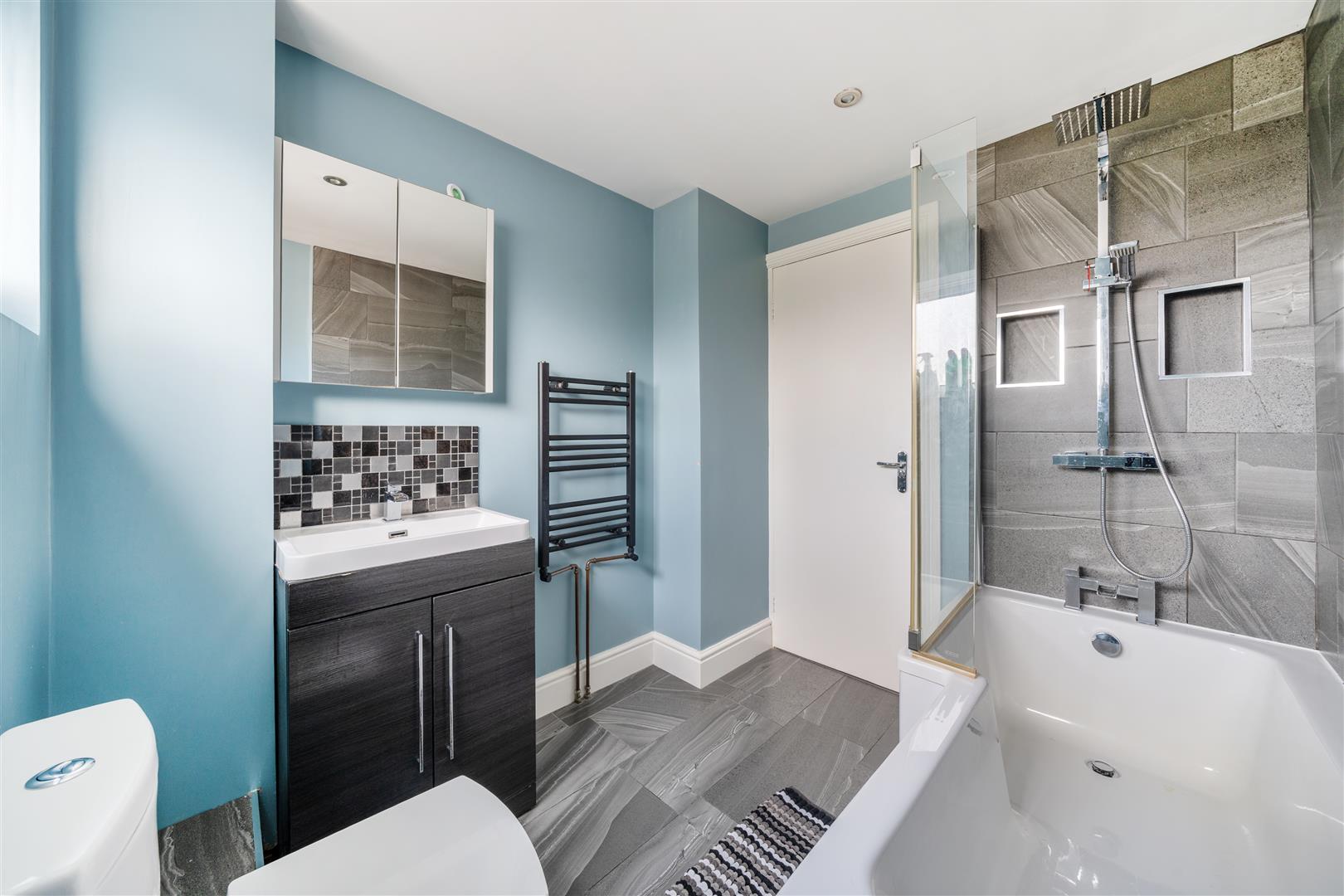 The family bathroom is contemporary is style, comprising a white three piece suite, featuring overhead shower that is tiled to the ceiling with vanity unit and toilet.