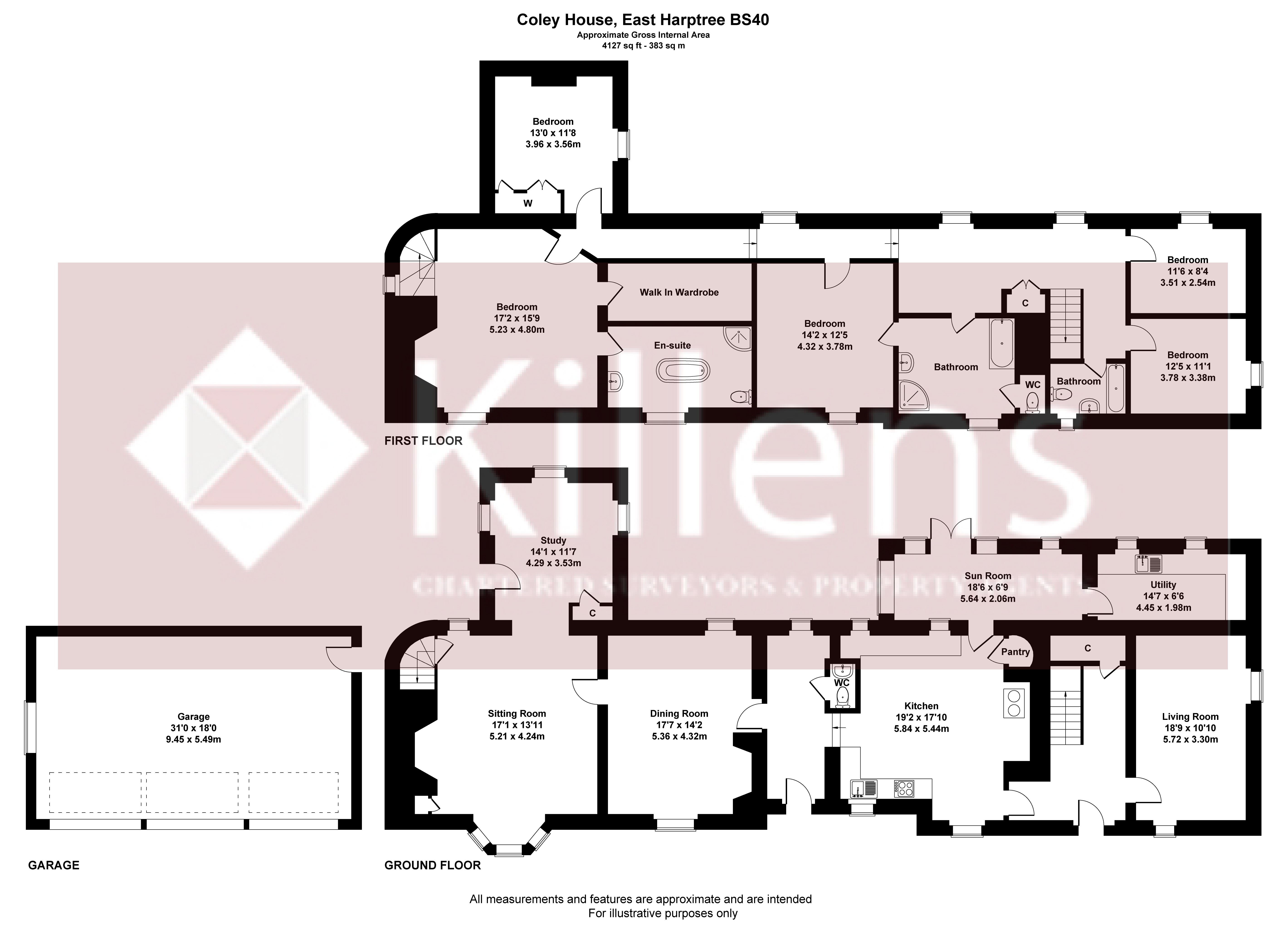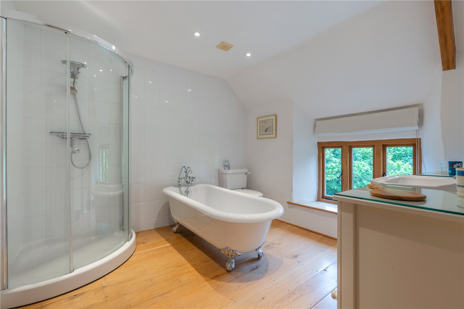 A wide, light filled landing leads to the generous principal bedroom, complete with walk-in wardrobe and generous en-suite bathroom. There are four further double bedrooms, each enjoying charming garden views. A family bathroom designed as a Jack and Jill for flexible access from the second bedroom. There is a further bathroom at the far end of the house for the remaining bedrooms.