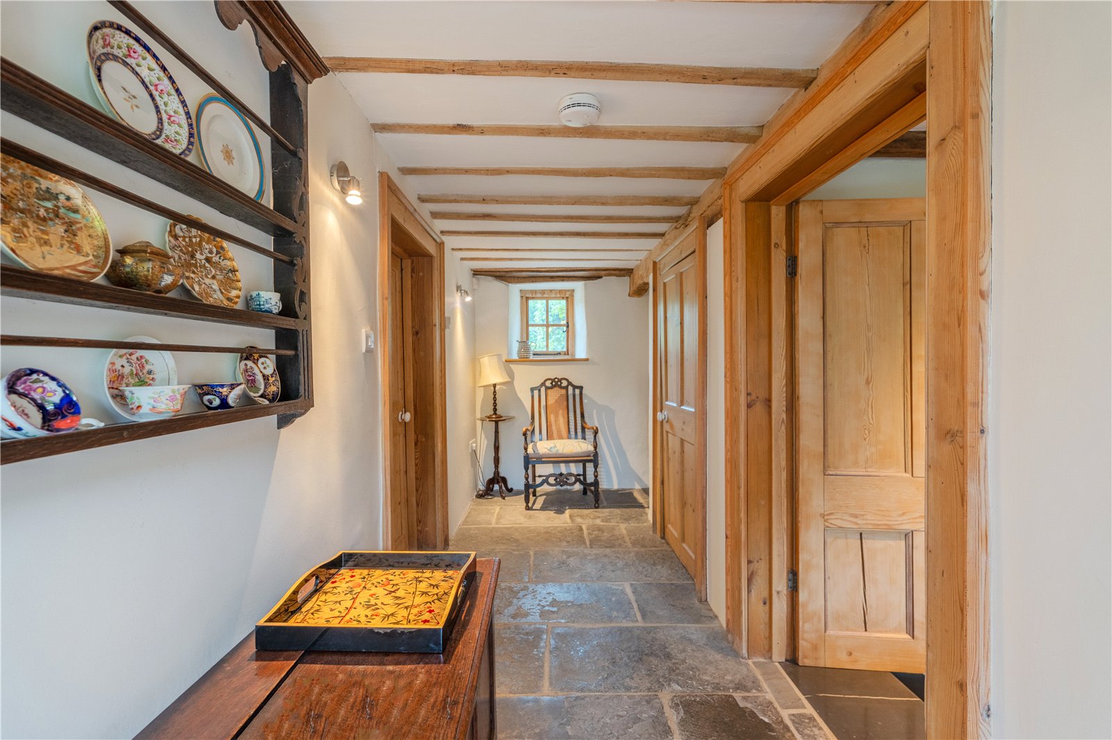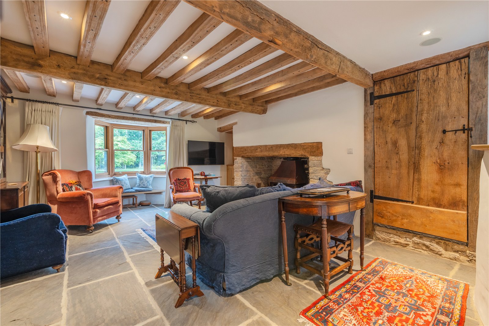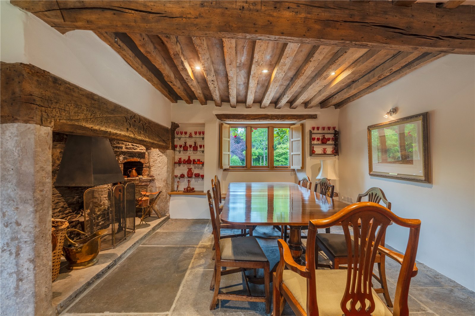 To the left of the hall, the formal dining room features a magnificent inglenook fireplace and original flagstone flooring, offering a perfect setting for dinner parties or family gatherings. Beyond, the dual aspect drawing room is light and inviting and enjoys lovely views of the gardens with exposed oak beams, deep windowsills, and another attractive fireplace.