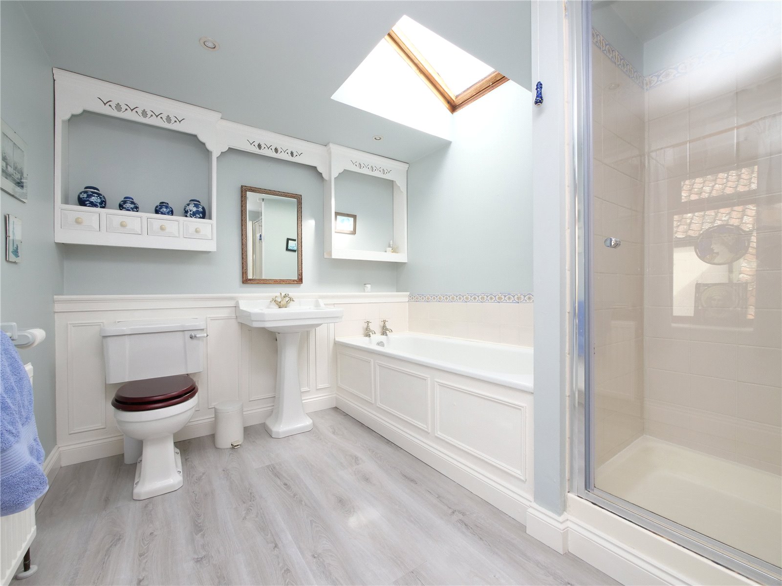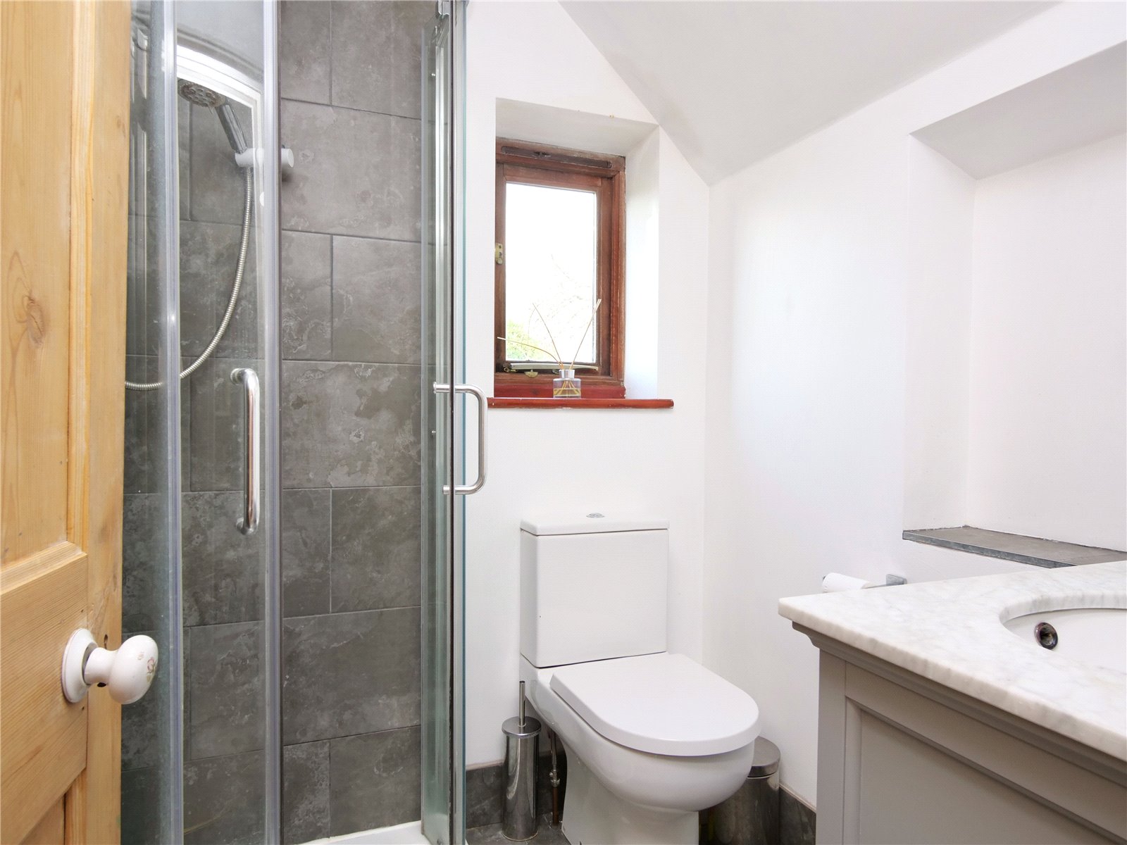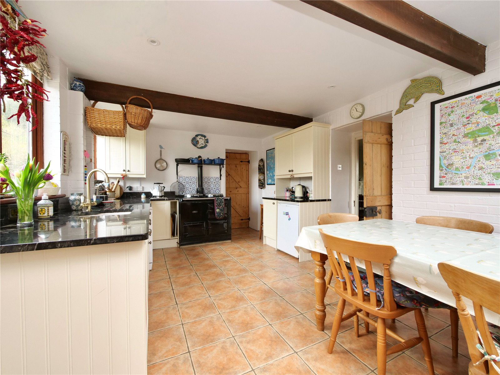 An enclosed entrance porch opens into a spacious and light filled kitchen/breakfast room, featuring a gas fired Aga, granite work surfaces and exposed beams that enhance the cottage's character. The adjoining dining room, part of the original cottage, exudes charm with polished wooden floorboards and an attractive decorative fire surround, and flows naturally through to a comfortable sitting room complete with an open fire and deep window sills. Just off the kitchen is a large utility room with a walk in larder, cloakroom, and door leading out to the patio. The first floor is accessed via two separate staircases. There is a spacious family bathroom with both a bath and separate shower, as well as an additional modern shower room. The property offers five generously sized bedrooms, one of which features vaulted ceilings and patio doors onto the garden, currently arranged as a home office.