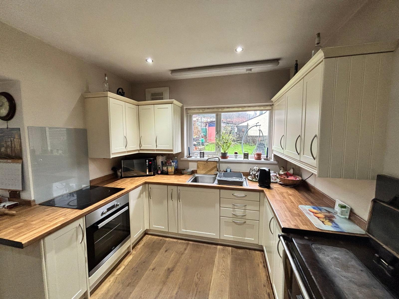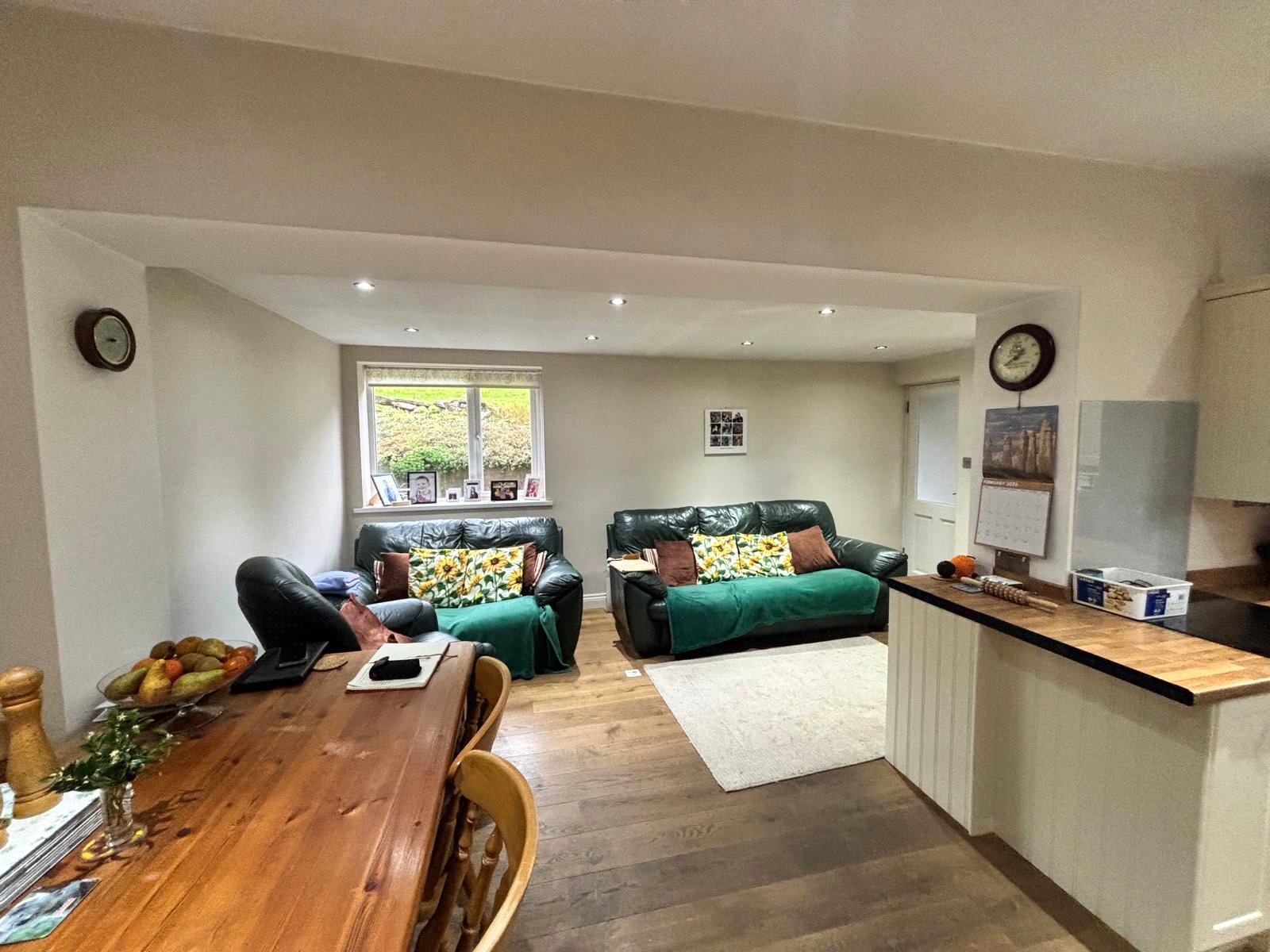 The sitting room and kitchen/dining area are arranged in an open-plan layout, creating a light and sociable living space well suited to modern day-to-day living. The sitting area is comfortably proportioned and enjoys good natural light, while the kitchen/dining area is fitted with a range of wall and base units with work surfaces and provides space for a dining table. Windows overlook the garden, offering a pleasant outlook and good levels of natural light.