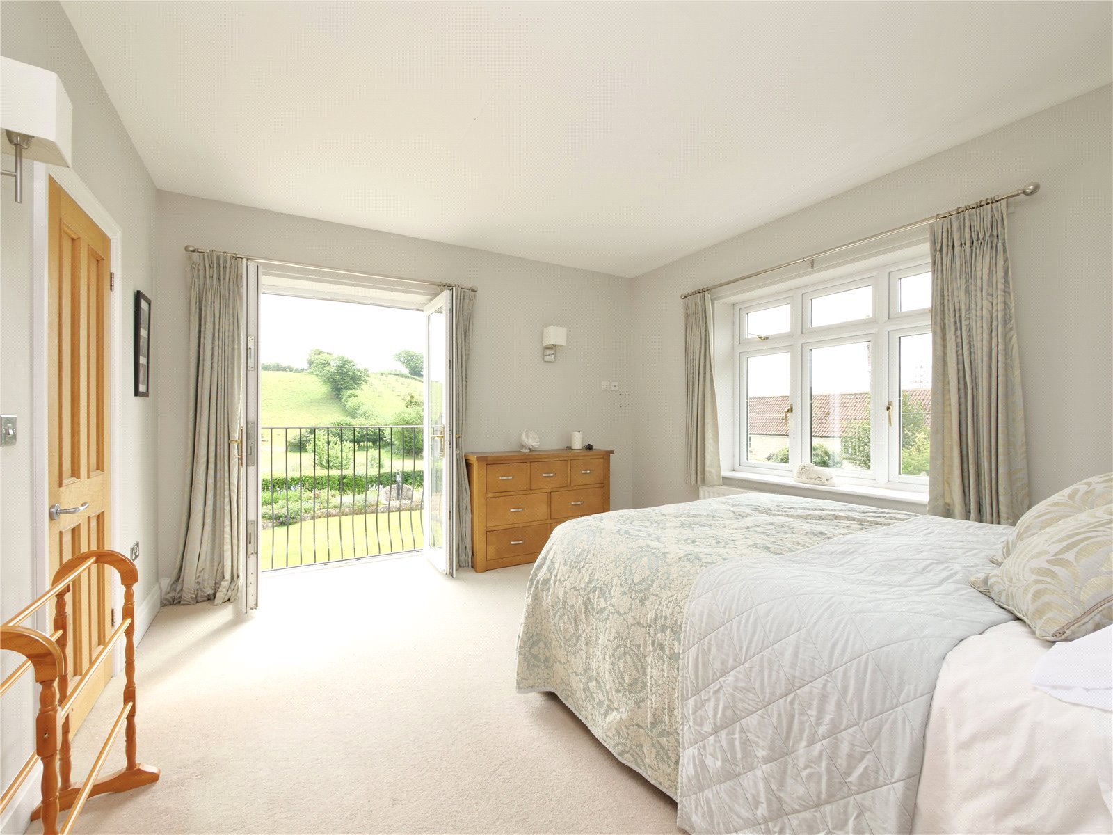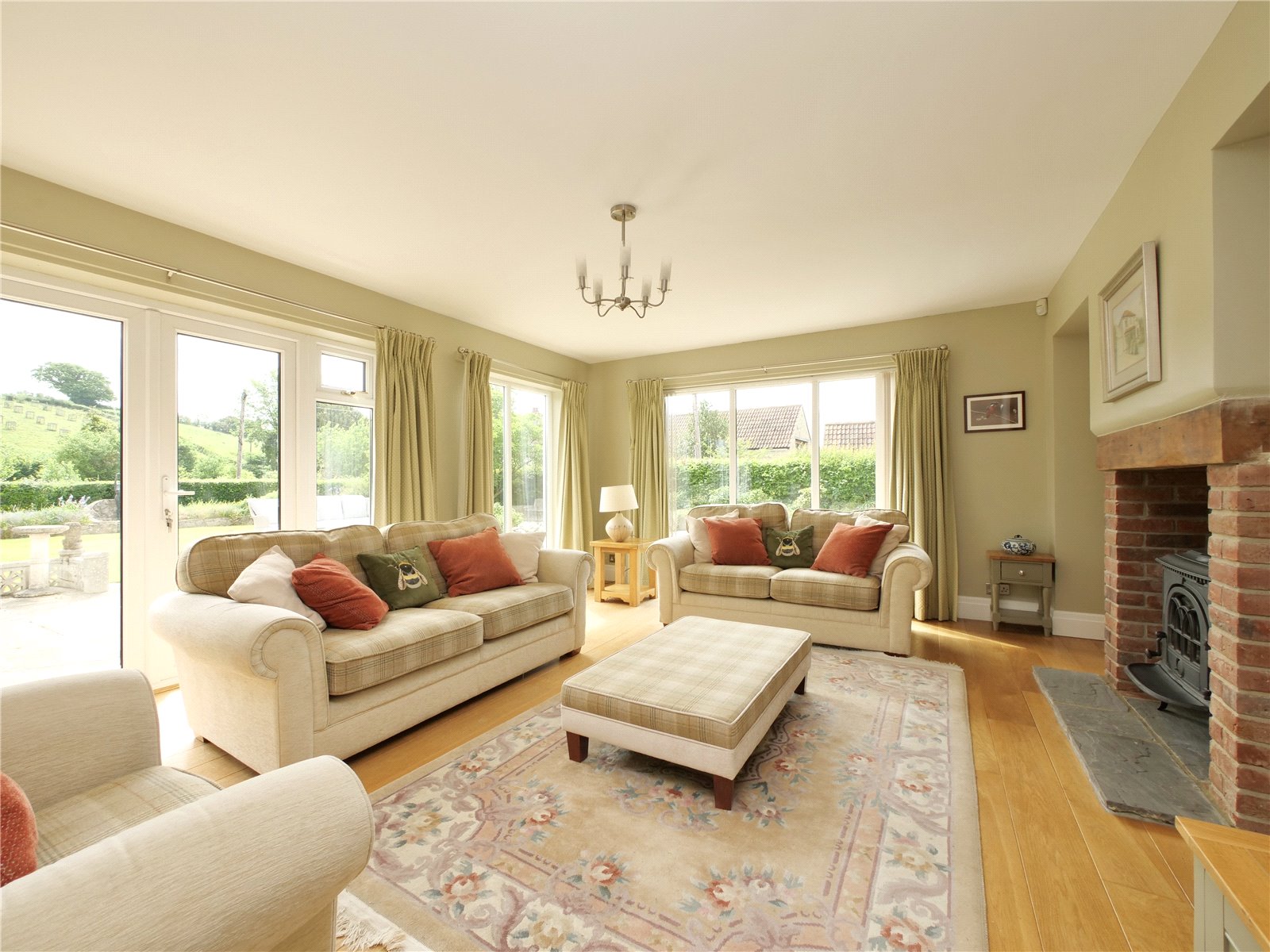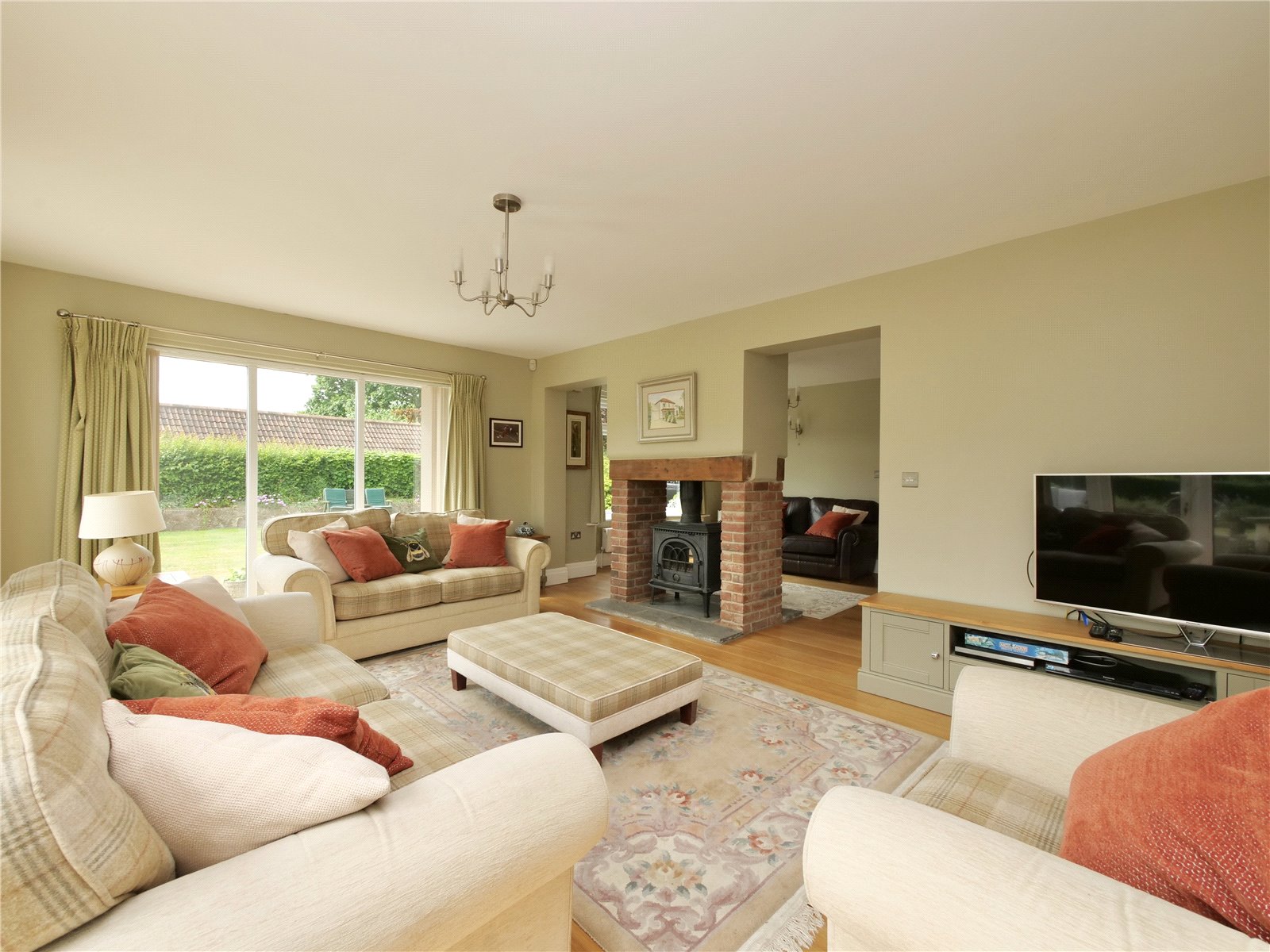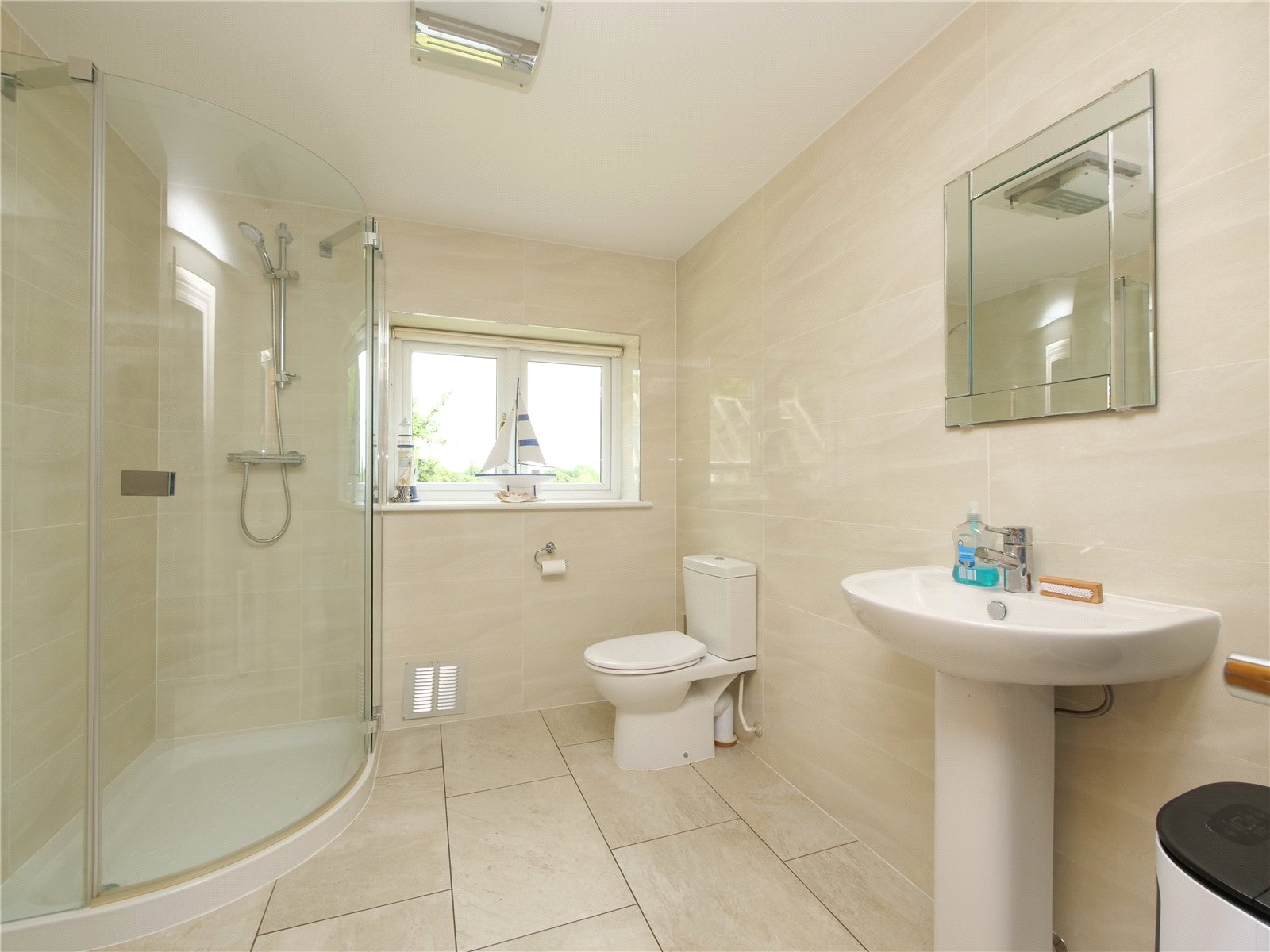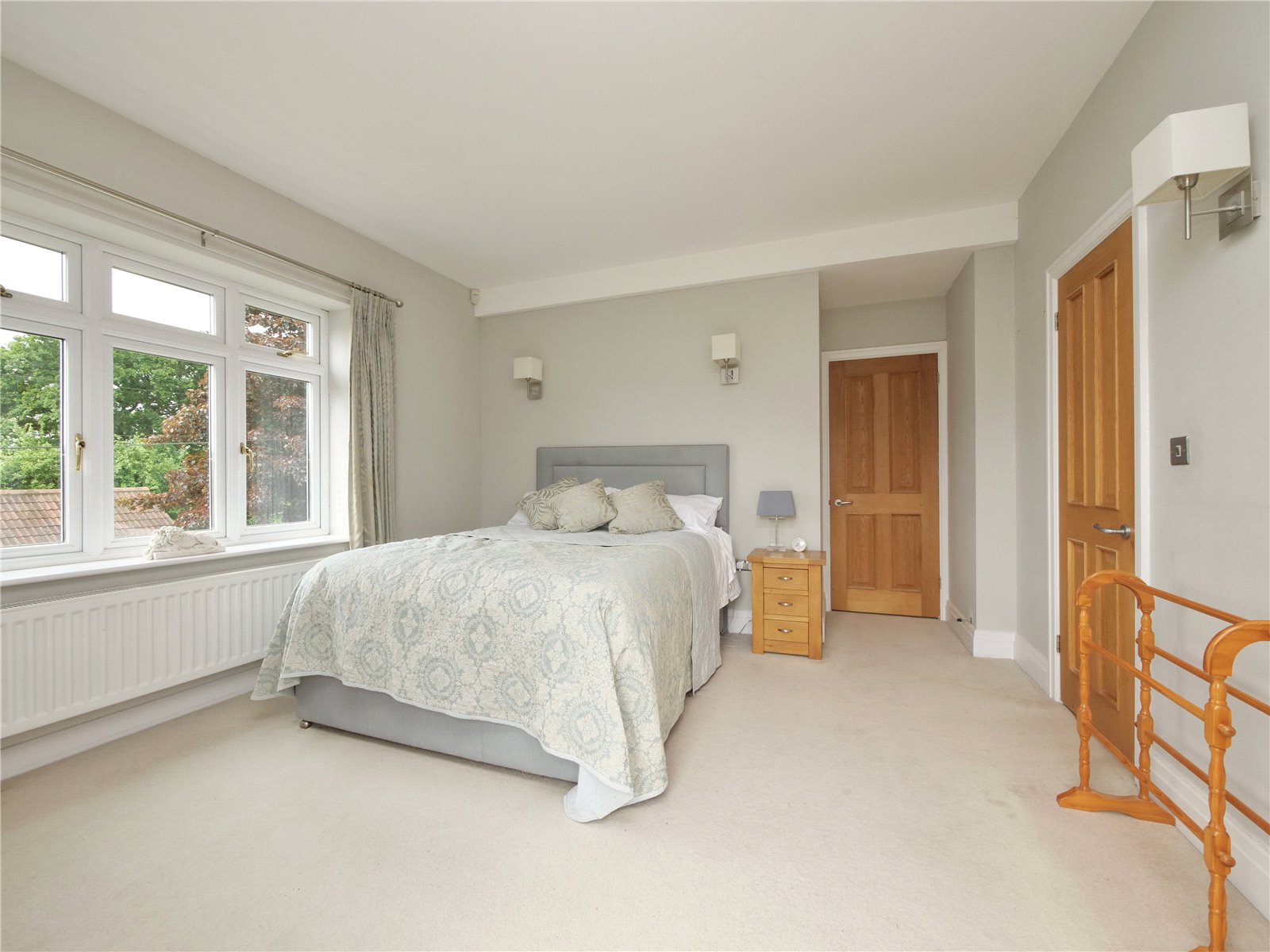 Upstairs, the principal bedroom suite is a true retreat, offering a walk in wardrobe, sleek en suite shower room and a Juliet balcony that looks out across the gardens and neighbouring fields. The remaining four bedrooms share a spacious contemporary family bathroom with separate bath and shower