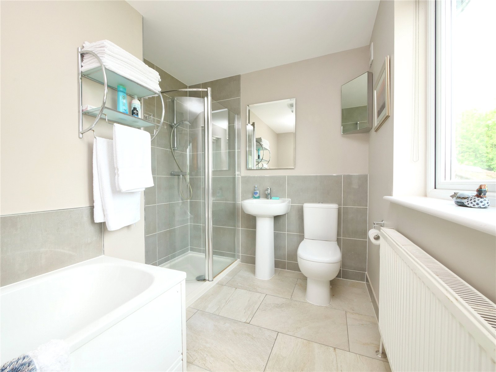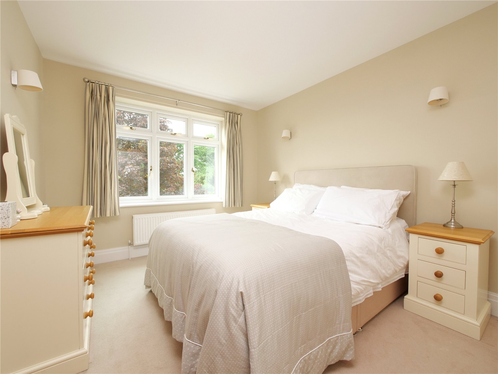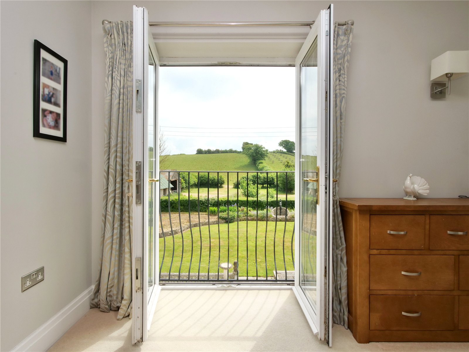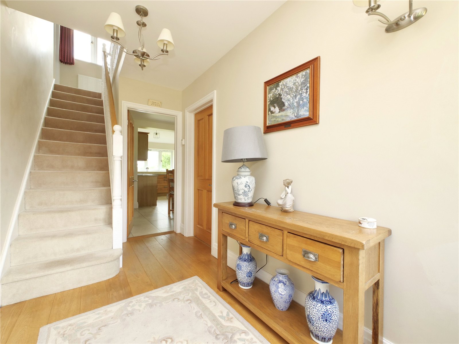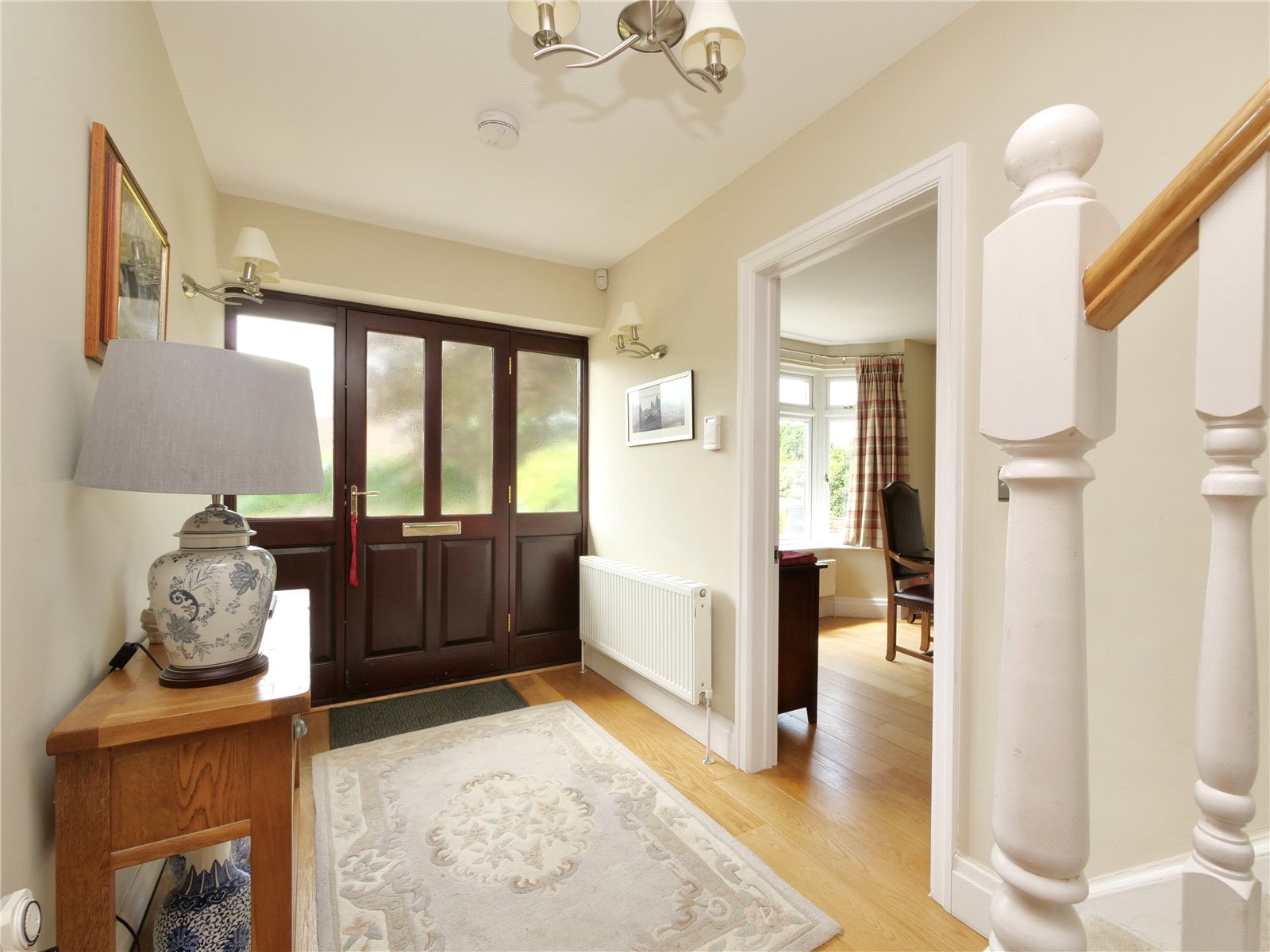 Upstairs, the principal bedroom suite is a true retreat, offering a walk in wardrobe, sleek en suite shower room and a Juliet balcony that looks out across the gardens and neighbouring fields. The remaining four bedrooms share a spacious contemporary family bathroom with separate bath and shower