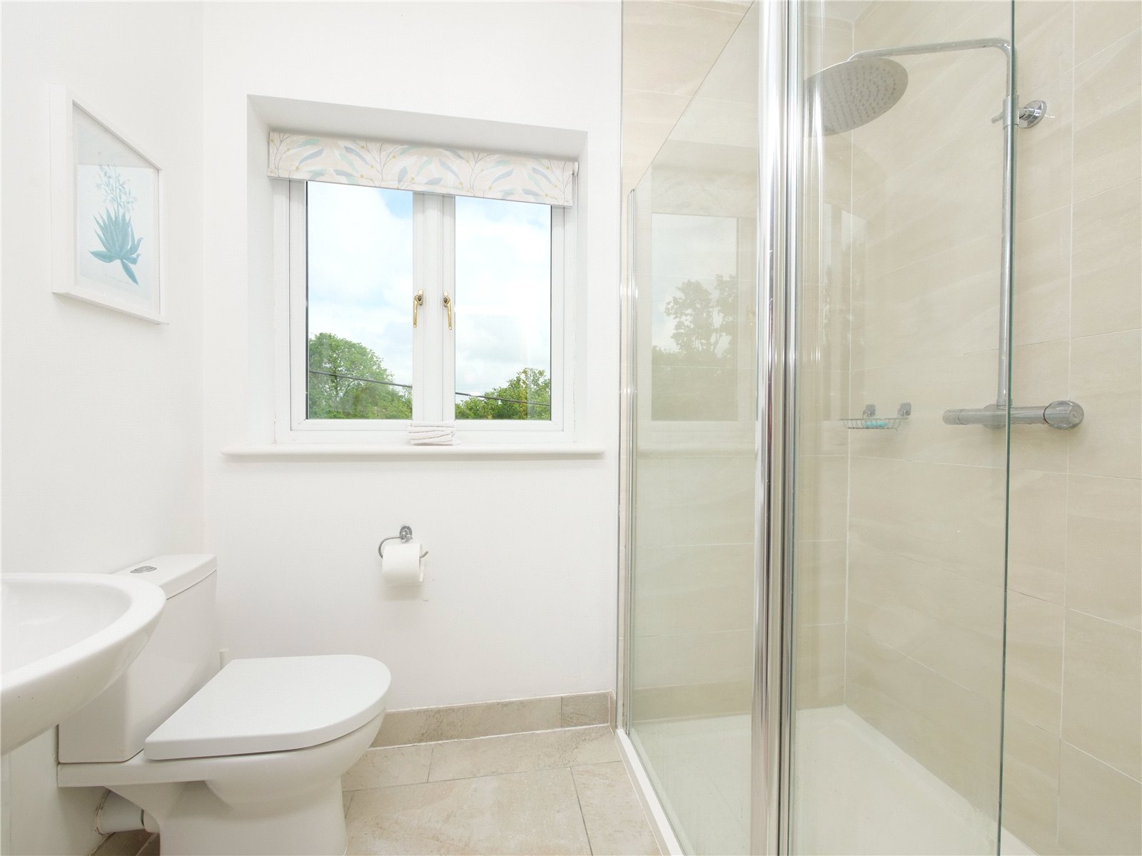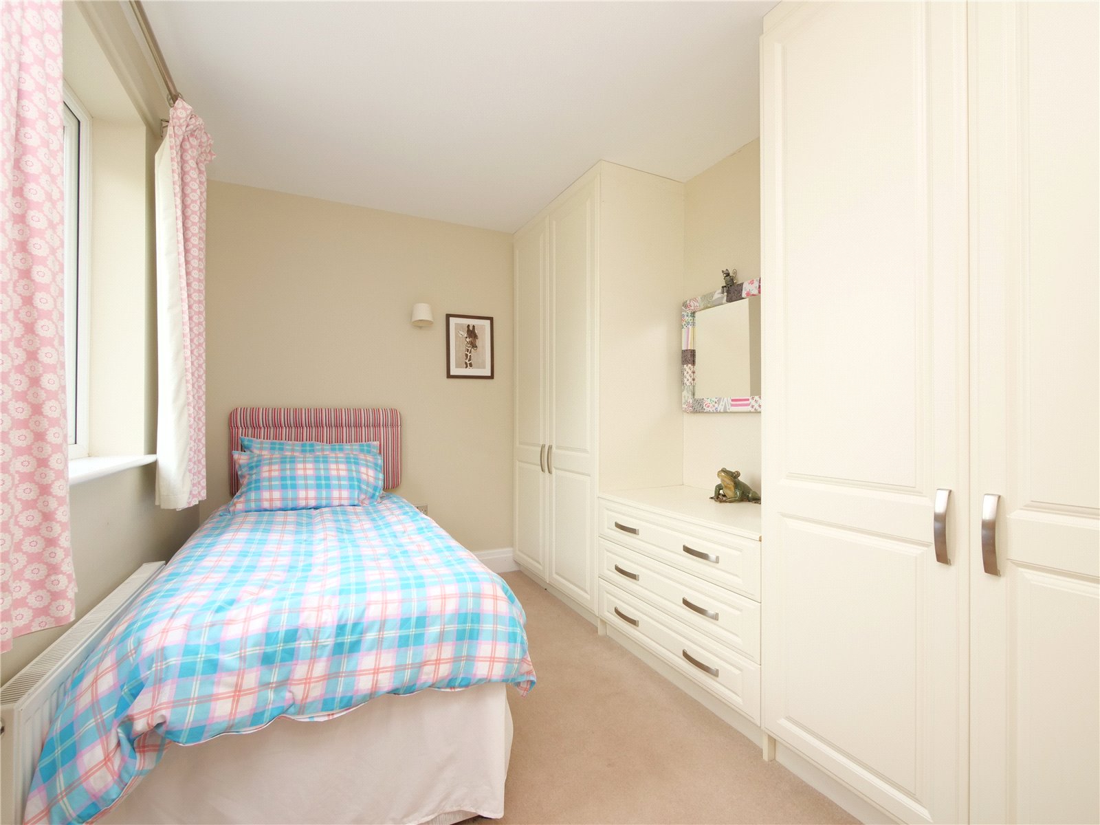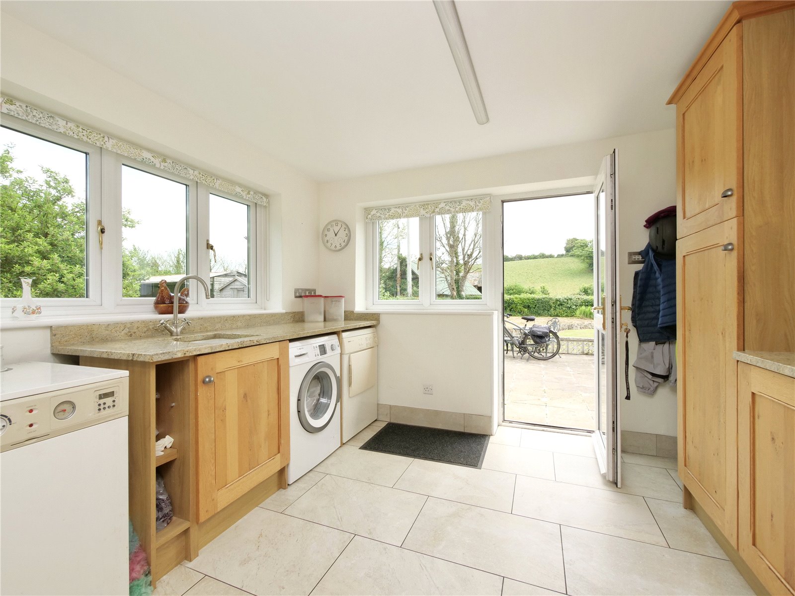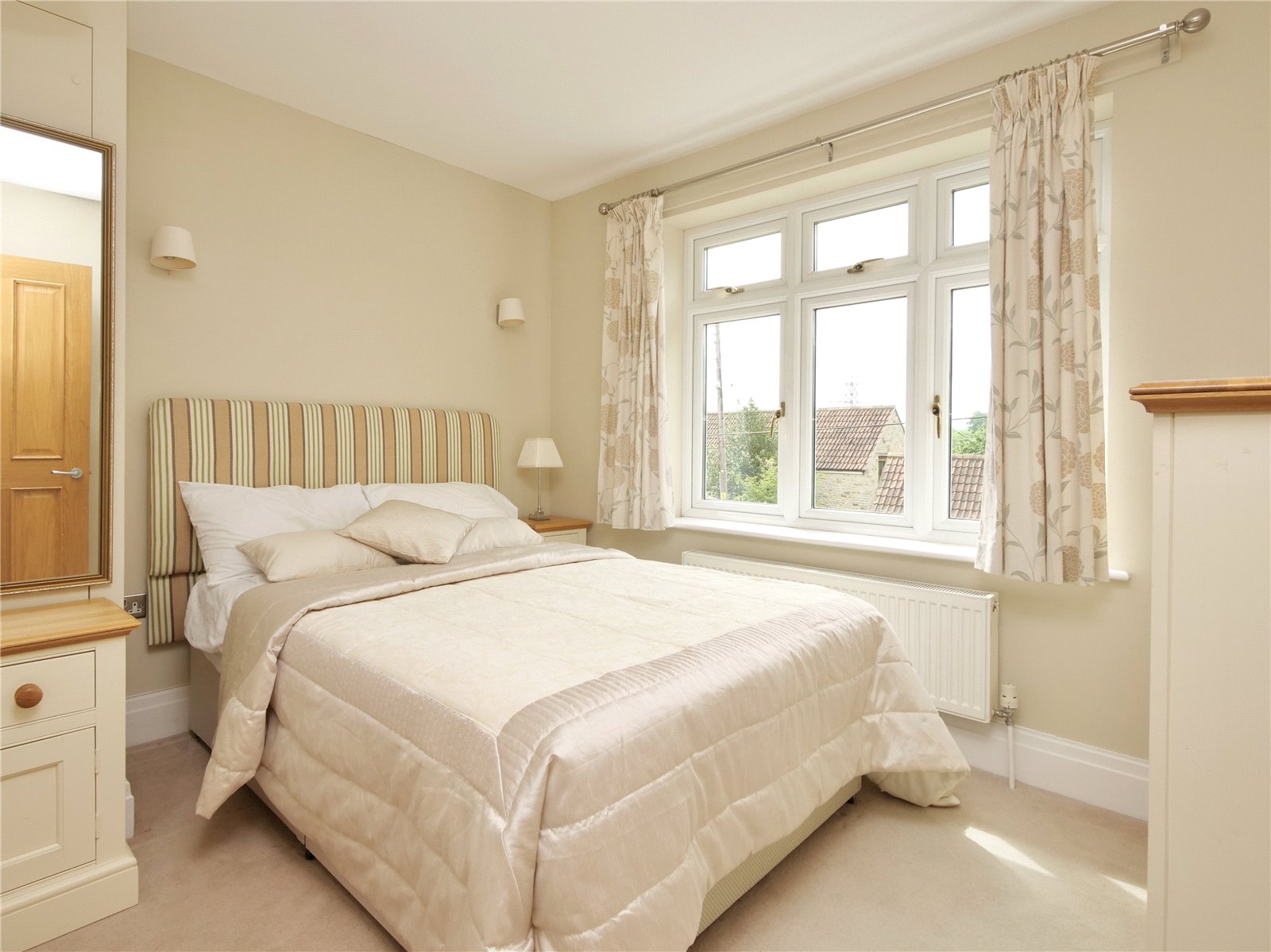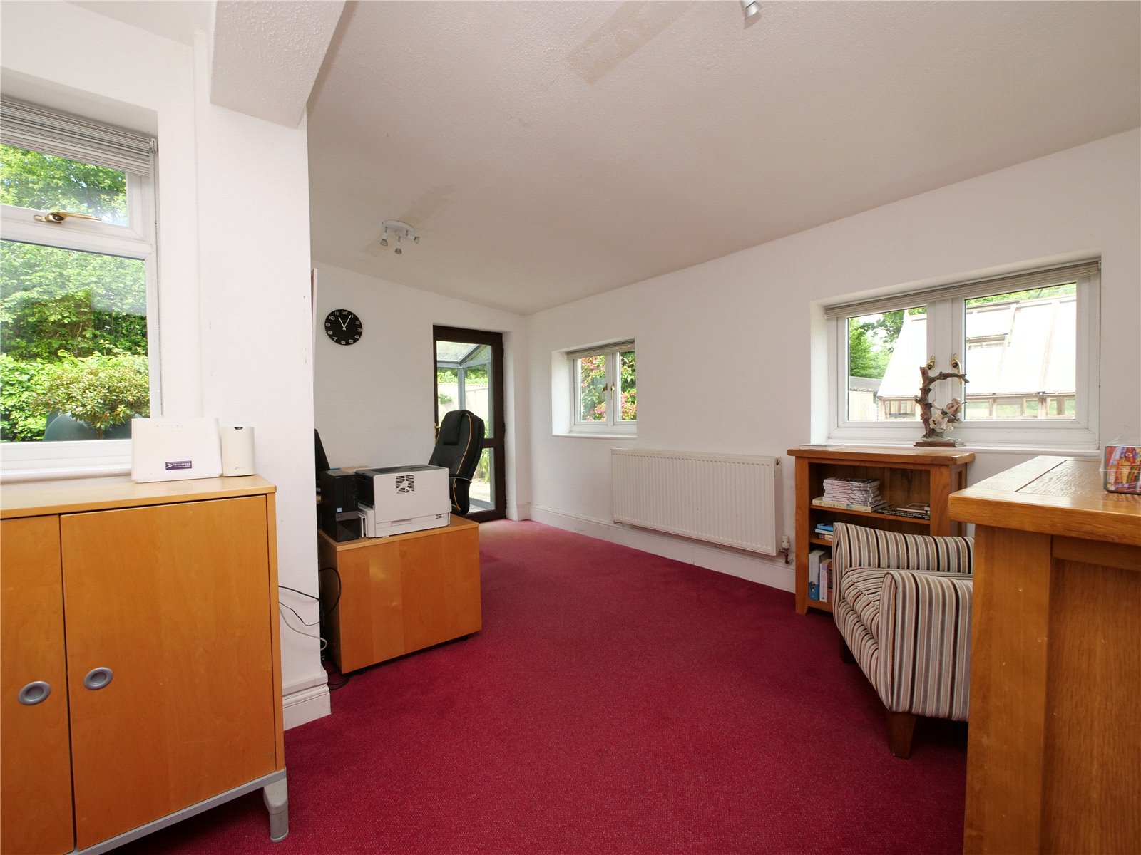 Upstairs, the principal bedroom suite is a true retreat, offering a walk in wardrobe, sleek en suite shower room and a Juliet balcony that looks out across the gardens and neighbouring fields. The remaining four bedrooms share a spacious contemporary family bathroom with separate bath and shower