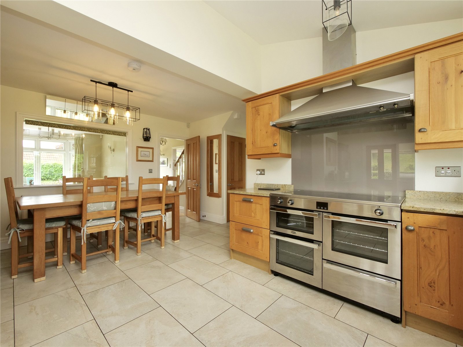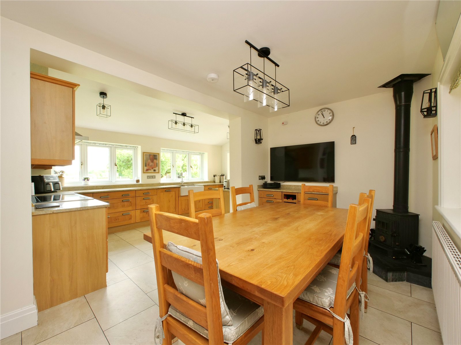 Inside, the accommodation has been thoughtfully extended to create generous, light filled spaces for family life. The entrance hall leads to a formal dining room with bay window, while the opposite sitting room flows into a substantial living room, both rooms linked by a double sided wood burner and framed by garden views with French doors onto the terrace. Stretching across the rear of the house, the kitchen is fitted with elegant timber cabinetry and granite worktops, complemented by a cosy dining nook with its own wood burner and a substantial adjoining utility/boot room that opens to the garden. On the ground floor you'll also find a modern shower room and a large study with independent external access - ideal for working from home.