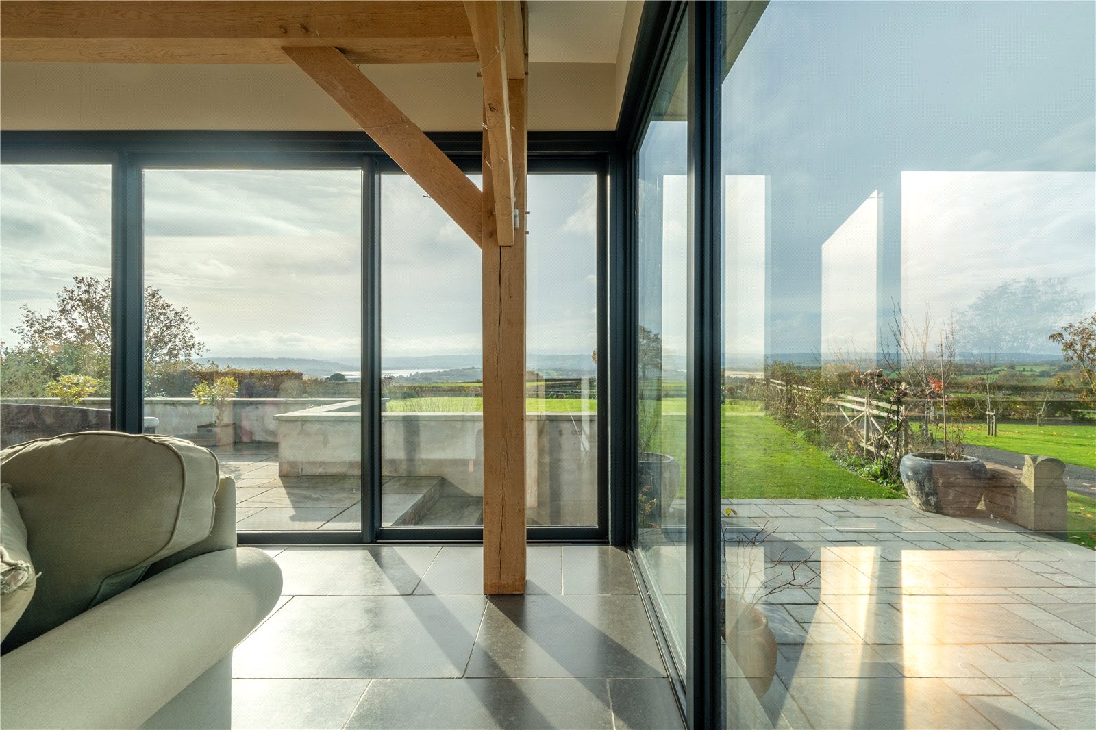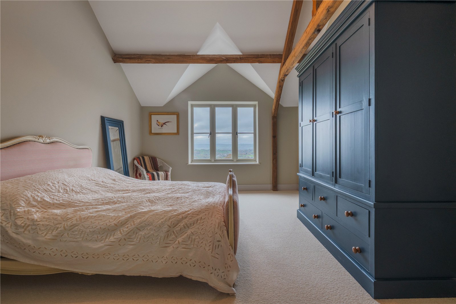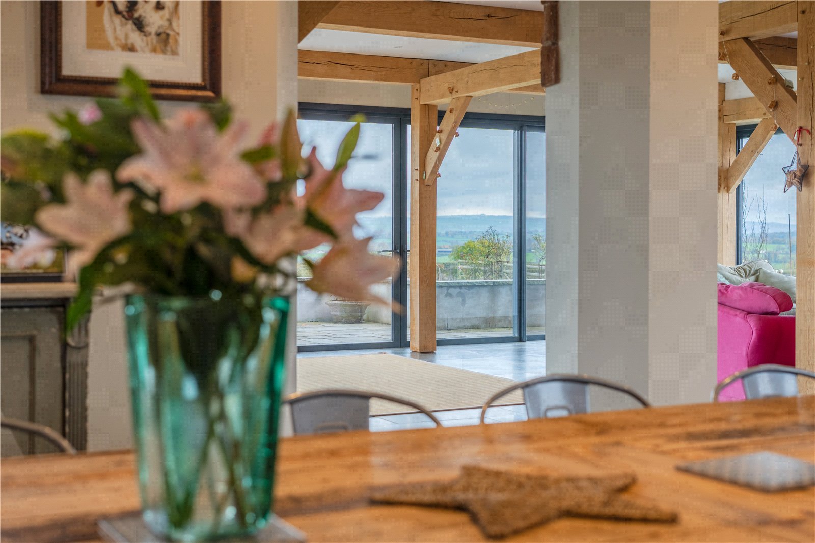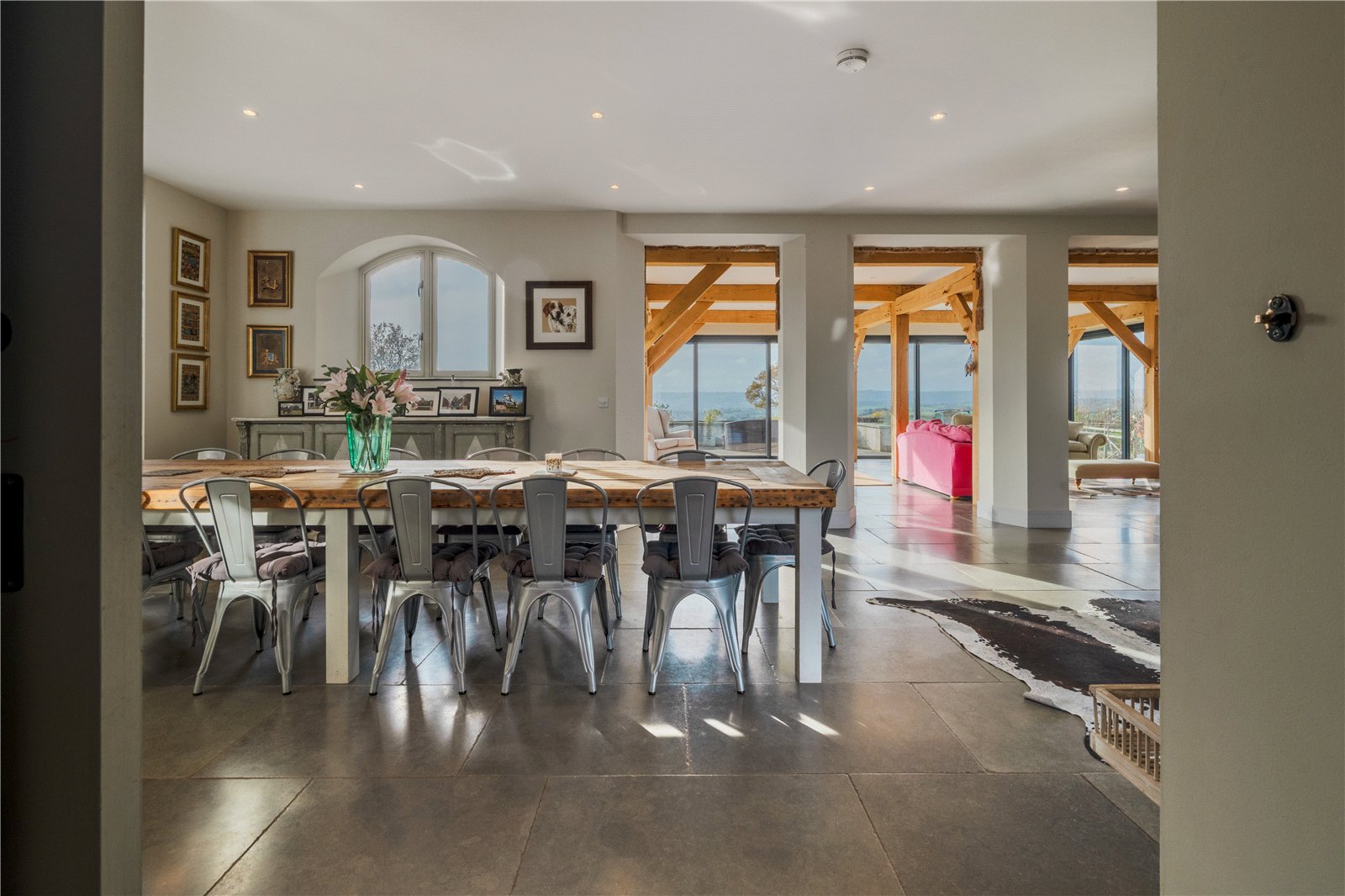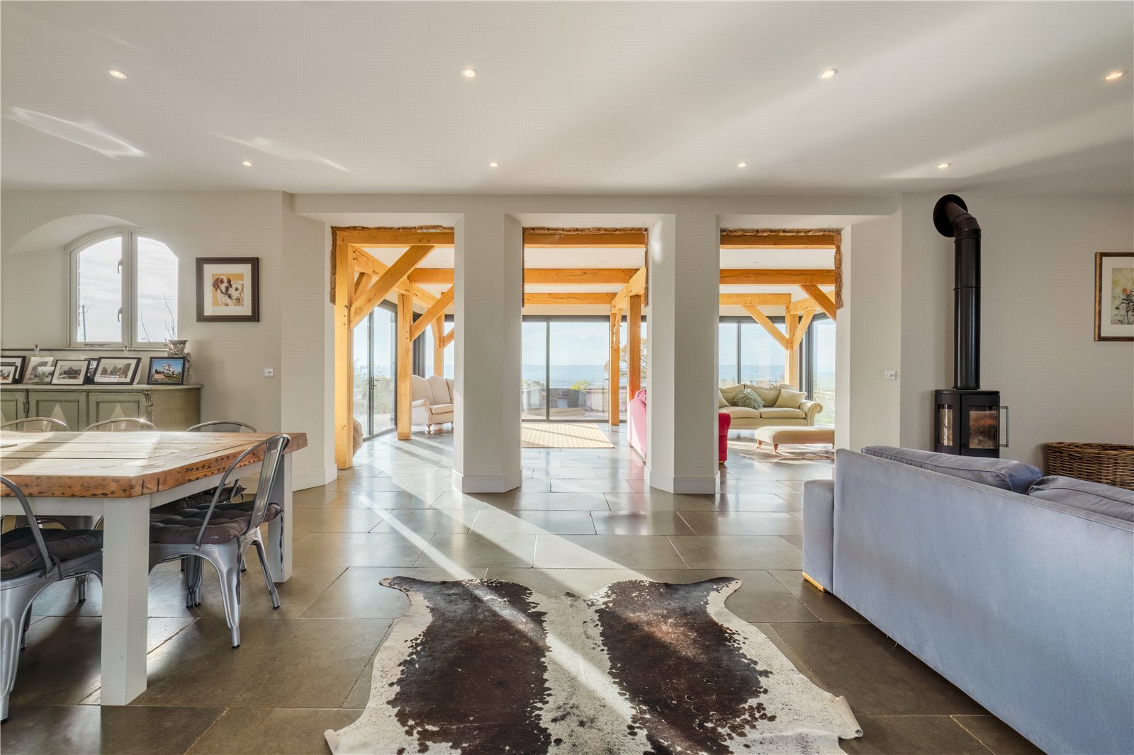 The bespoke kitchen features high-end fittings, a generous island, a separate pantry, and seamless flow into the dining and lounge areas. Exposed oak beams, a wood-burning stove, and direct access to the expansive lawns and south facing terraces create a warm and inviting environment, perfect for both intimate evenings and grand gatherings.