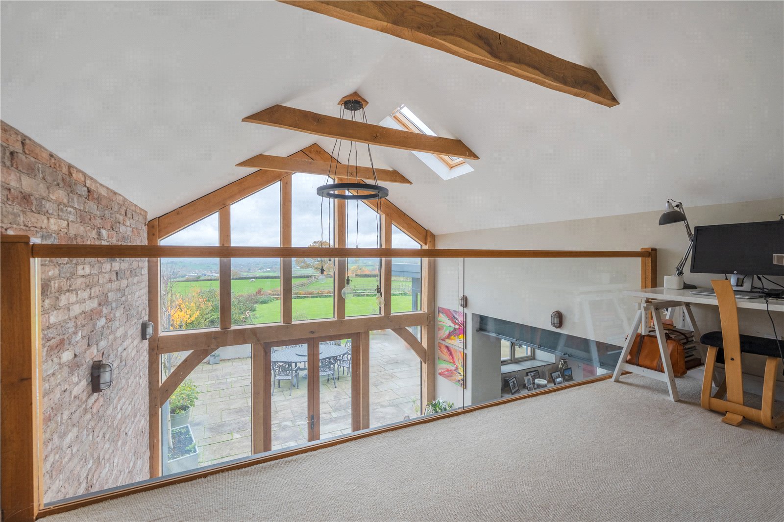 The first floor hosts four beautifully appointed bedrooms, three of which feature luxurious en-suites, blending comfort with elegance. A striking mezzanine study offers a serene workspace, with breathtaking views of Chew Valley Lake and views stretching across the valley.