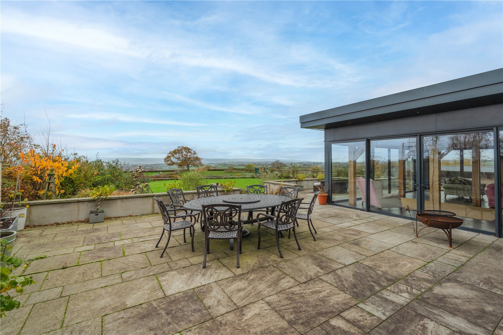 Upon entering, you are immediately drawn into the heart of the home, which is a vast, open-plan kitchen and entertaining space designed for modern living and effortless hosting. Expansive glass doors and picture windows frame uninterrupted, 360-degree views of rolling countryside, flooding the space with natural light.