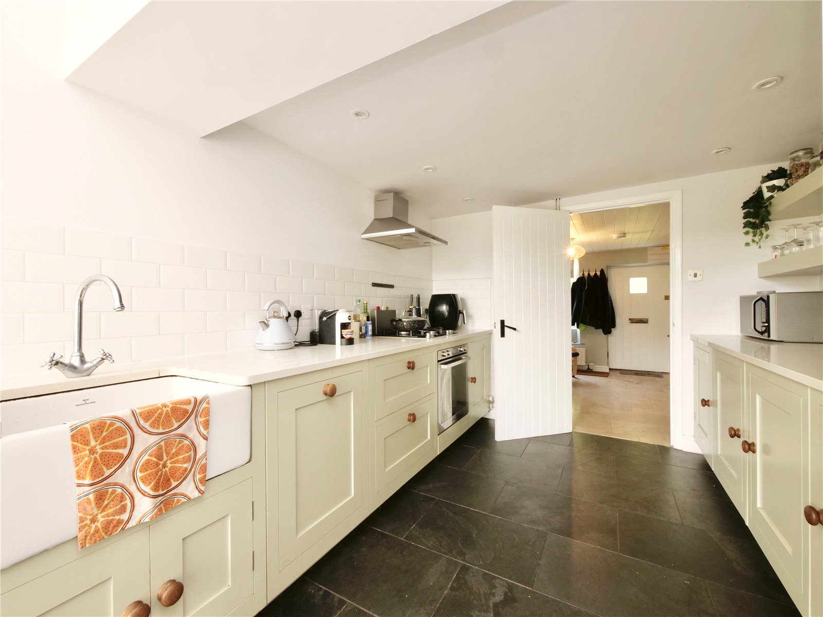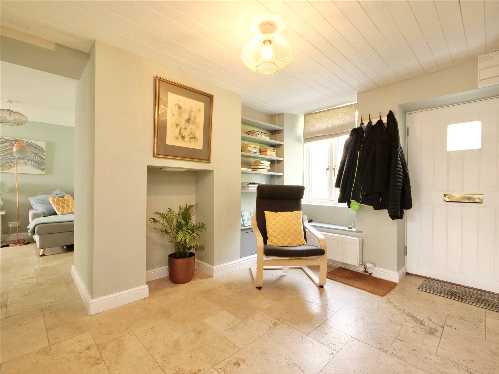 As you enter the cottage you are welcomed by a large hallway, which could be used as extra reception room or home office. On your right is a comfortable size cosy sitting room with an attractive open fireplace and windows to the front and rear. From the entrance hall you walk through to the large kitchen dining room. The kitchen offers lots of natural light with large oak glass doors leading into the private patio and garden. The kitchen enjoys under floor heating as well as modern units which work well in the space and integrated fridge, freezer and dishwasher. There is also plenty of room for a kitchen table. A utility cupboard provides space for a washing machine as well as additional useful storage space.