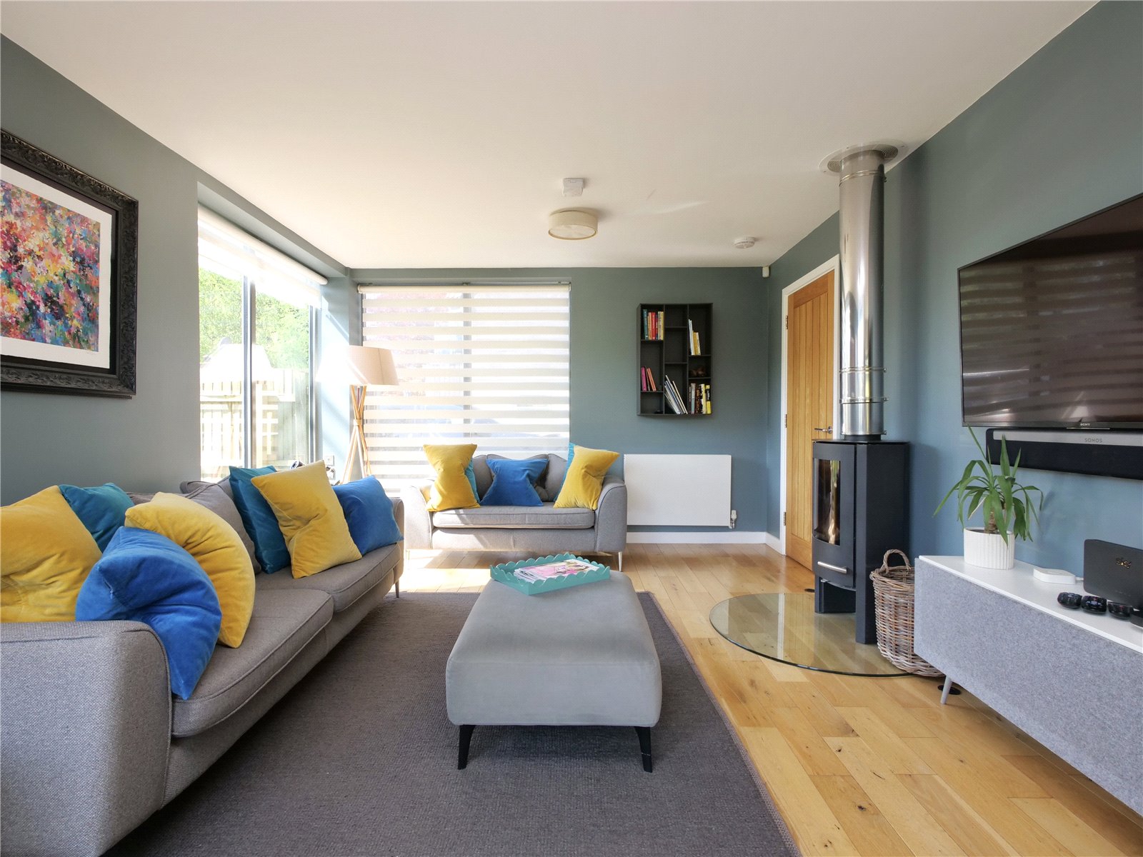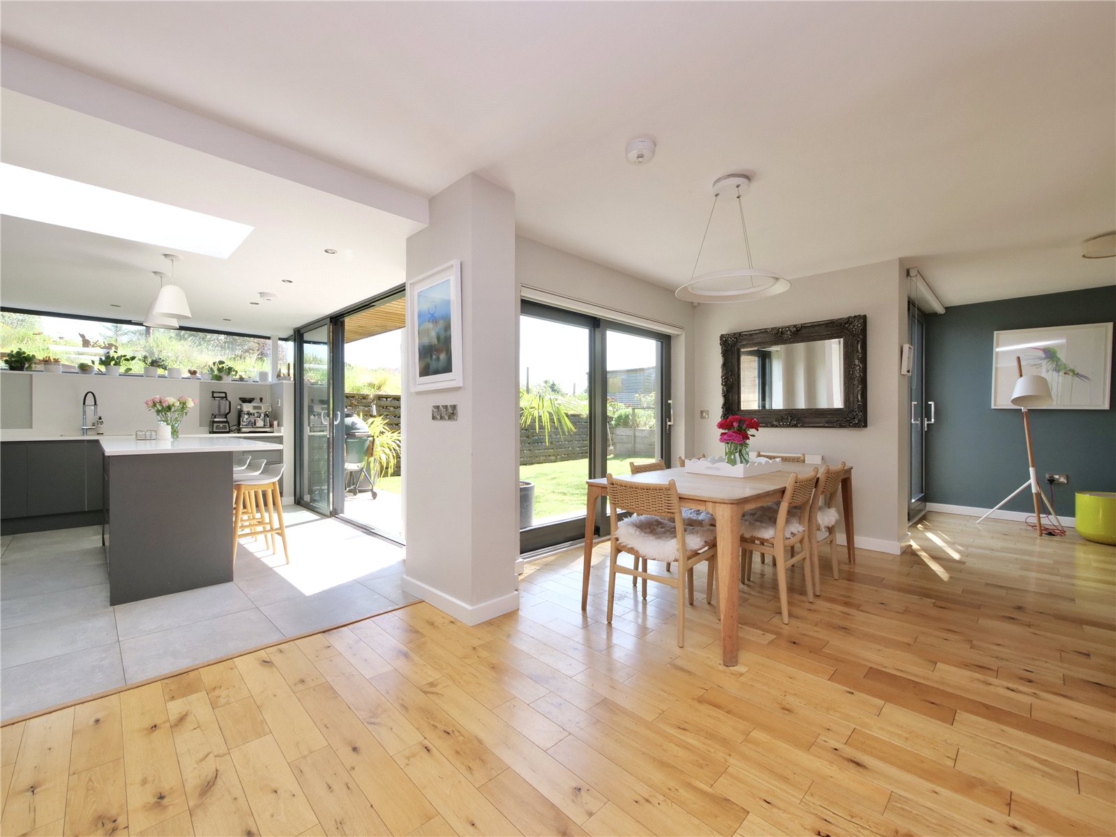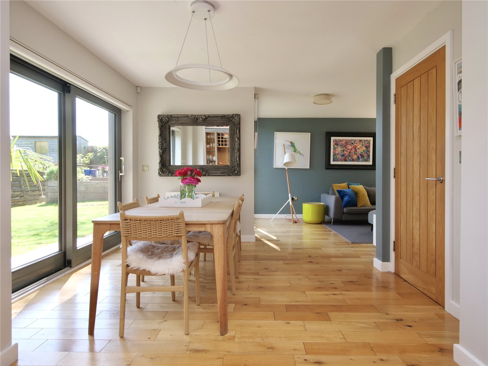 Step into a spacious entrance hall with cloakroom, leading directly into a light-filled open-plan living space. Wide sliding doors in the dining and living areas open out to the rear garden, enhancing the indoor-outdoor living experience. A contemporary wood-burning stove provides a cosy focal point.