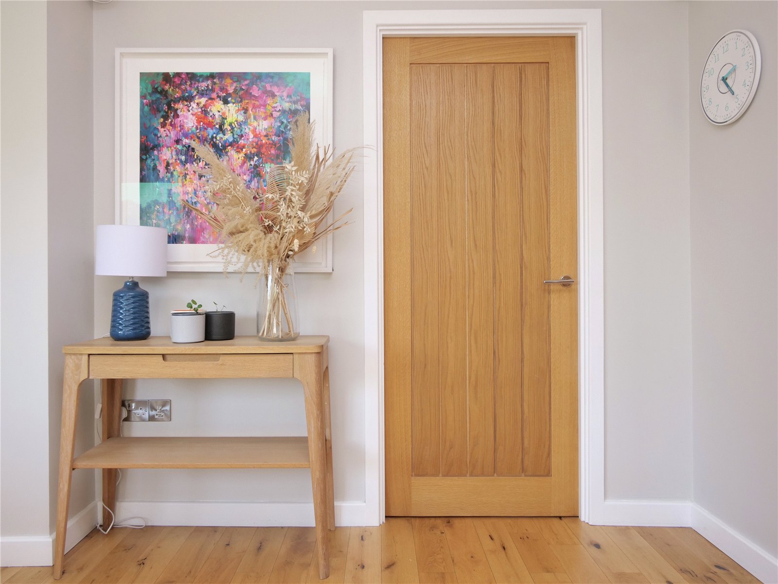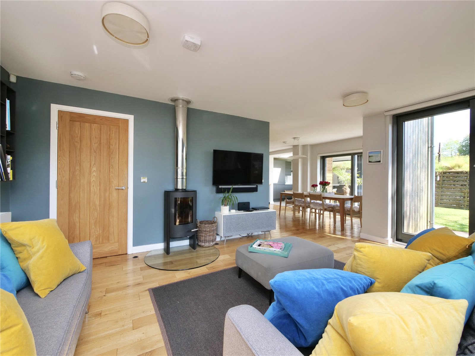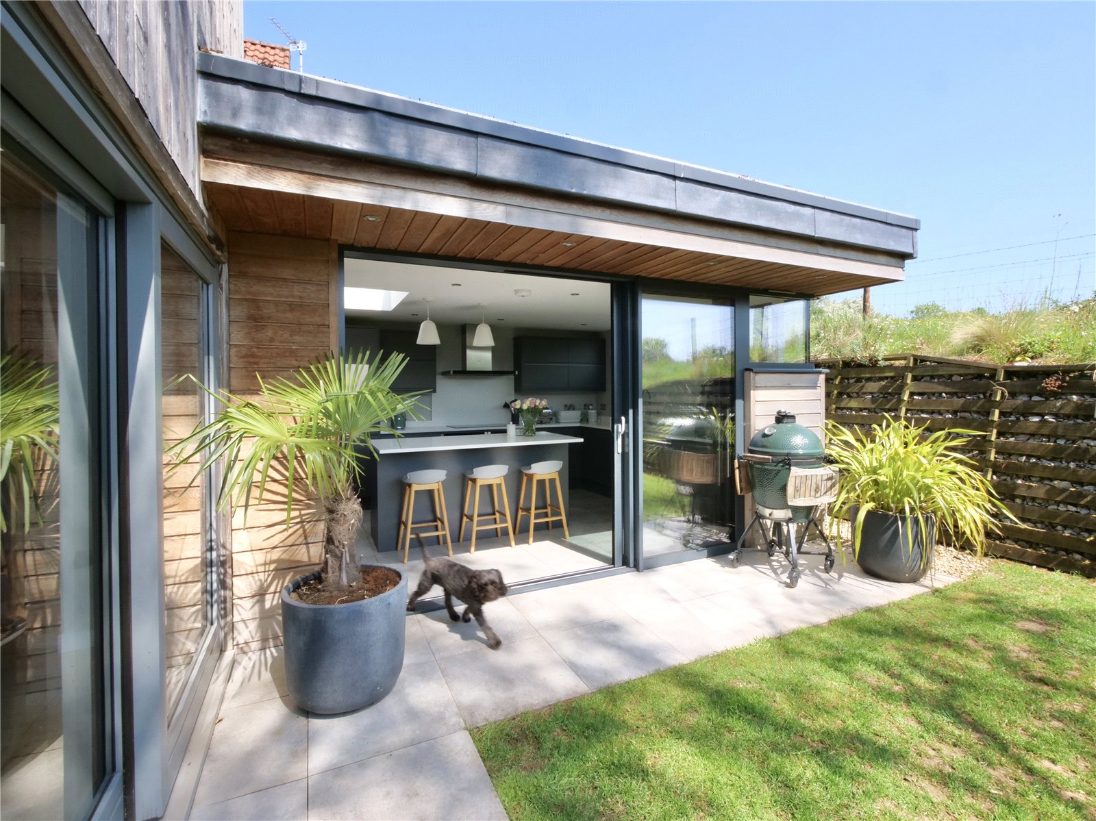 Step into a spacious entrance hall with cloakroom, leading directly into a light-filled open-plan living space. Wide sliding doors in the dining and living areas open out to the rear garden, enhancing the indoor-outdoor living experience. A contemporary wood-burning stove provides a cosy focal point.
