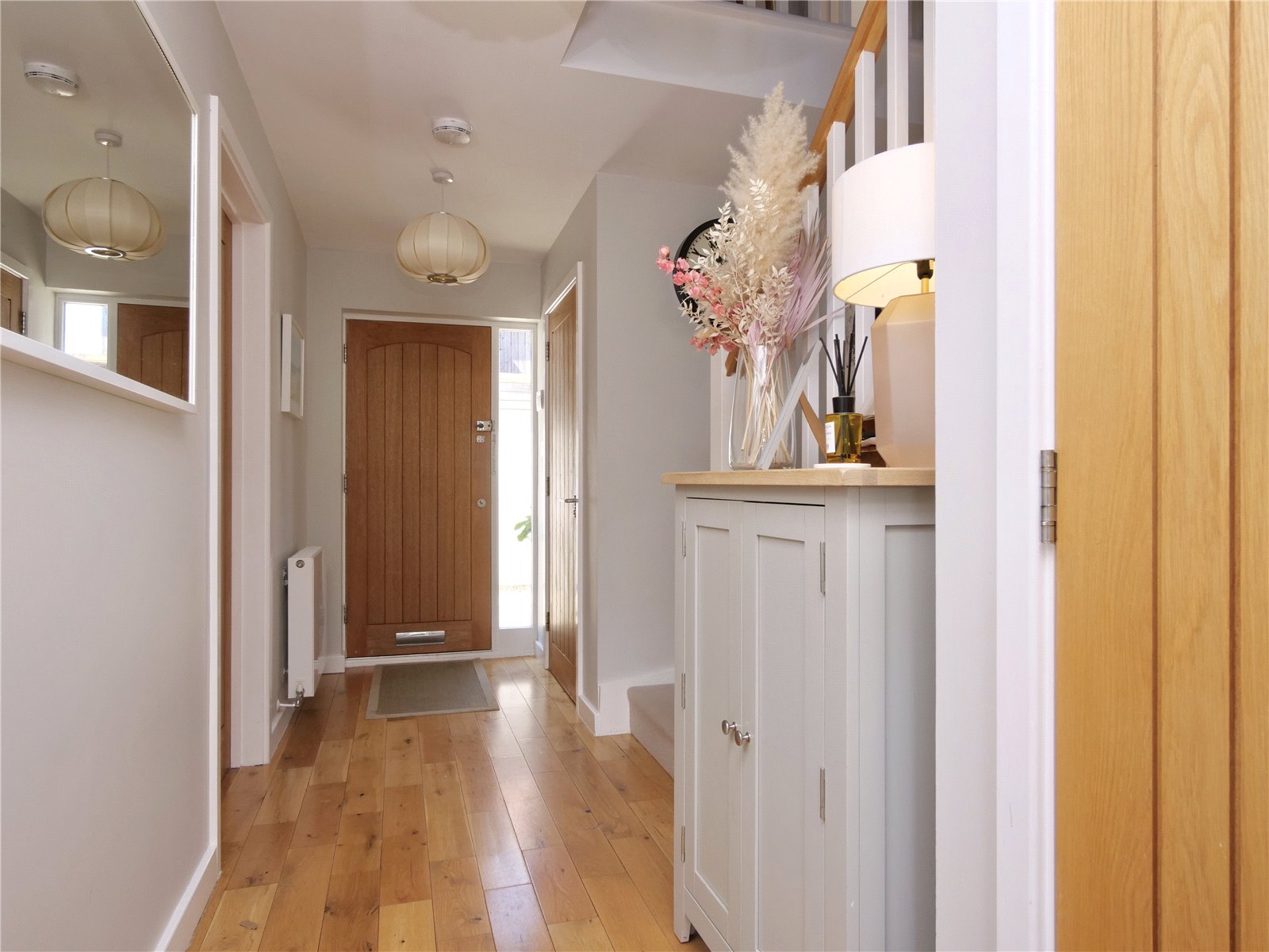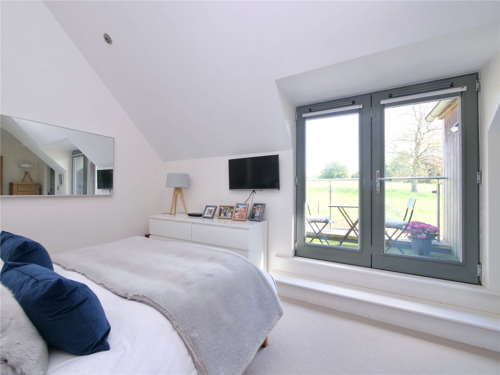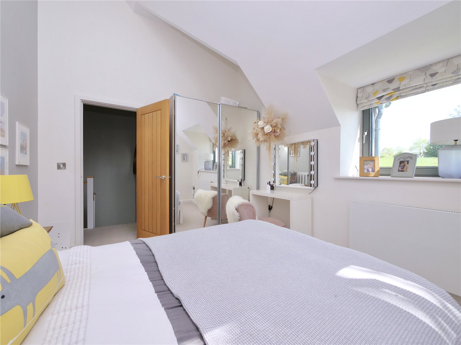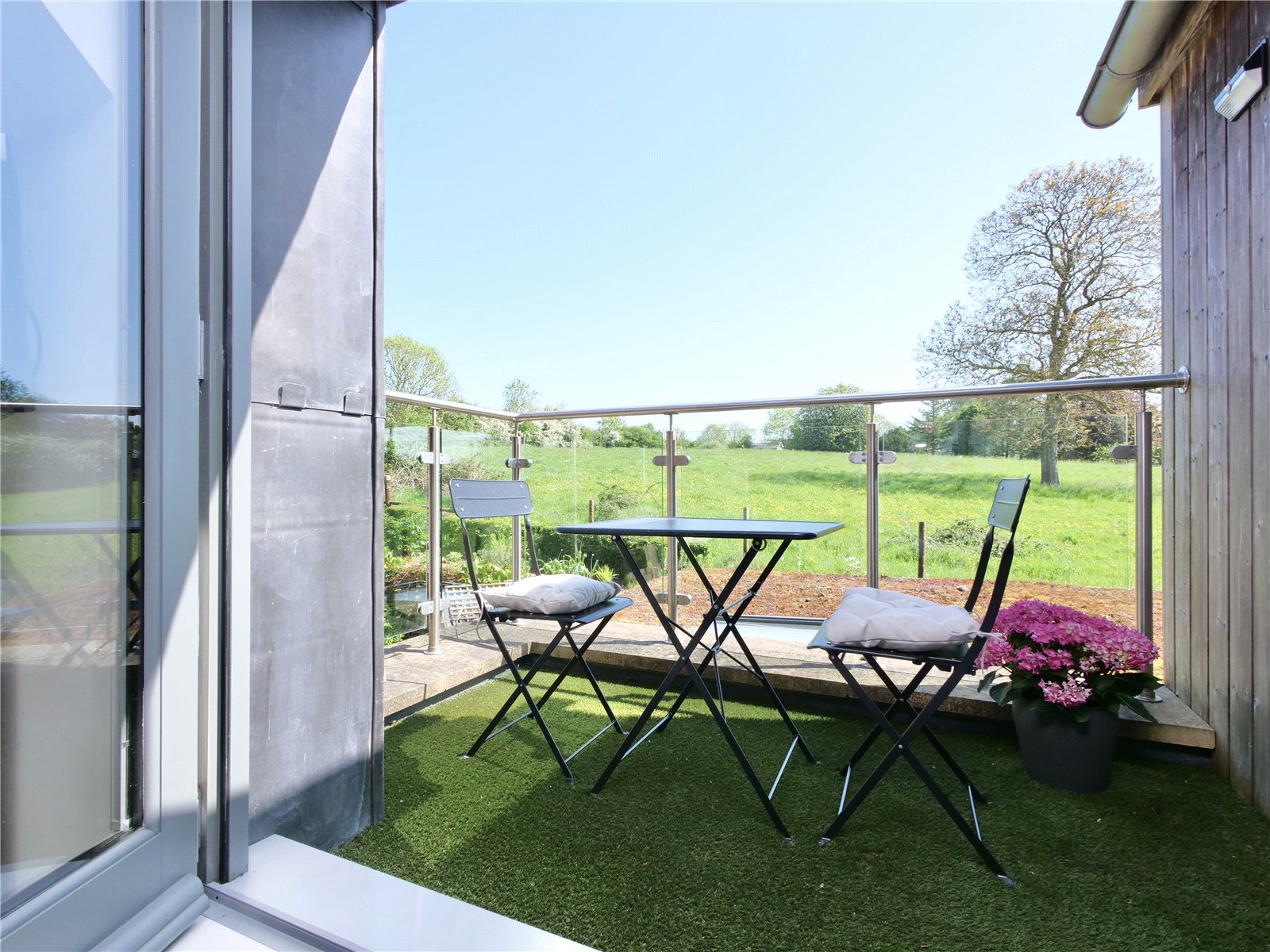 Upstairs, all four bedrooms are generously sized. The principal bedroom enjoys a private balcony with countryside views and a modern en-suite shower room. The family bathroom includes a large airing cupboard for additional storage.
