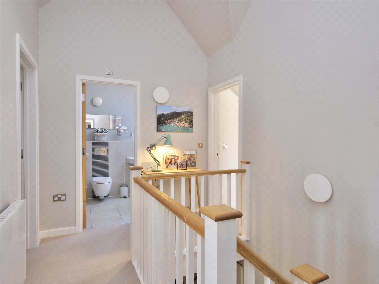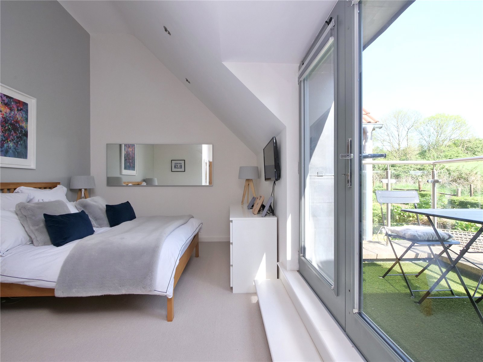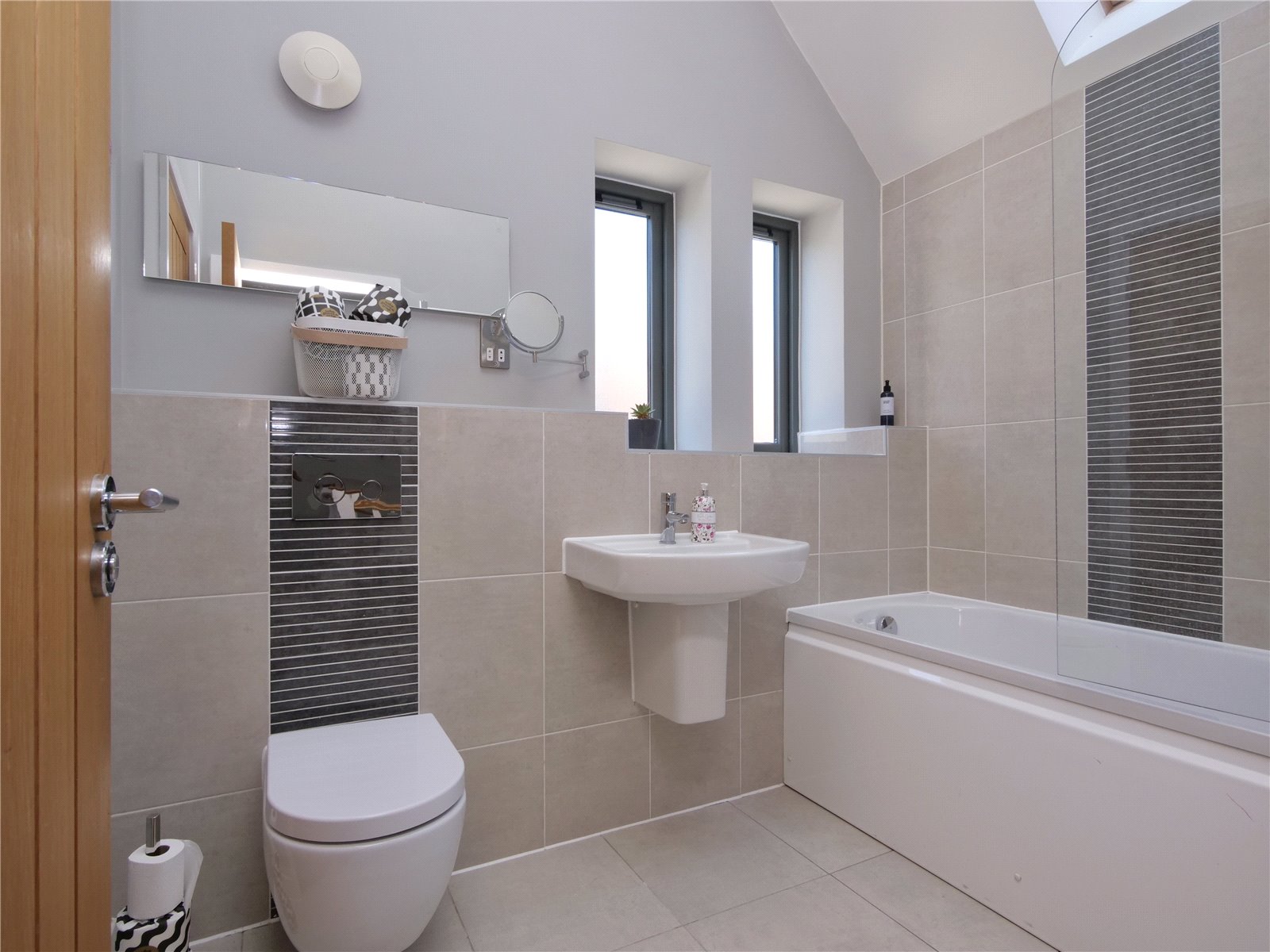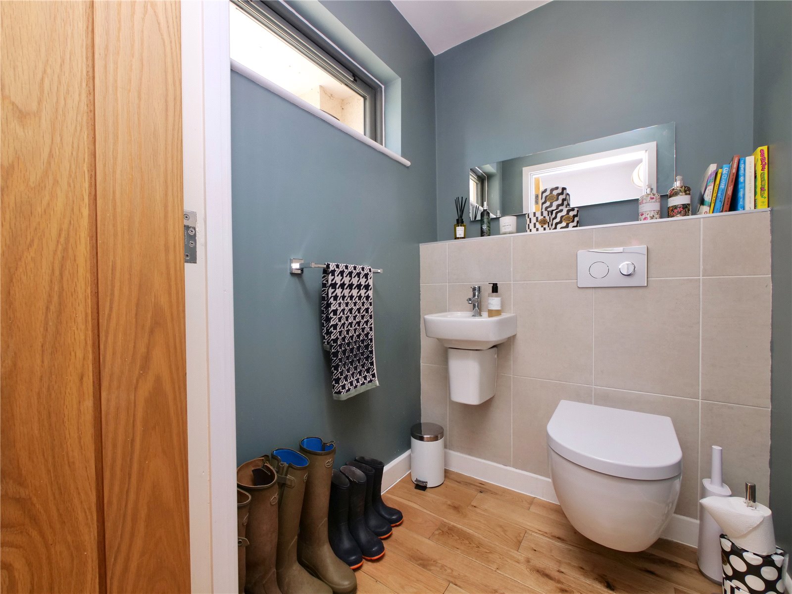 Upstairs, all four bedrooms are generously sized. The principal bedroom enjoys a private balcony with countryside views and a modern en-suite shower room. The family bathroom includes a large airing cupboard for additional storage.