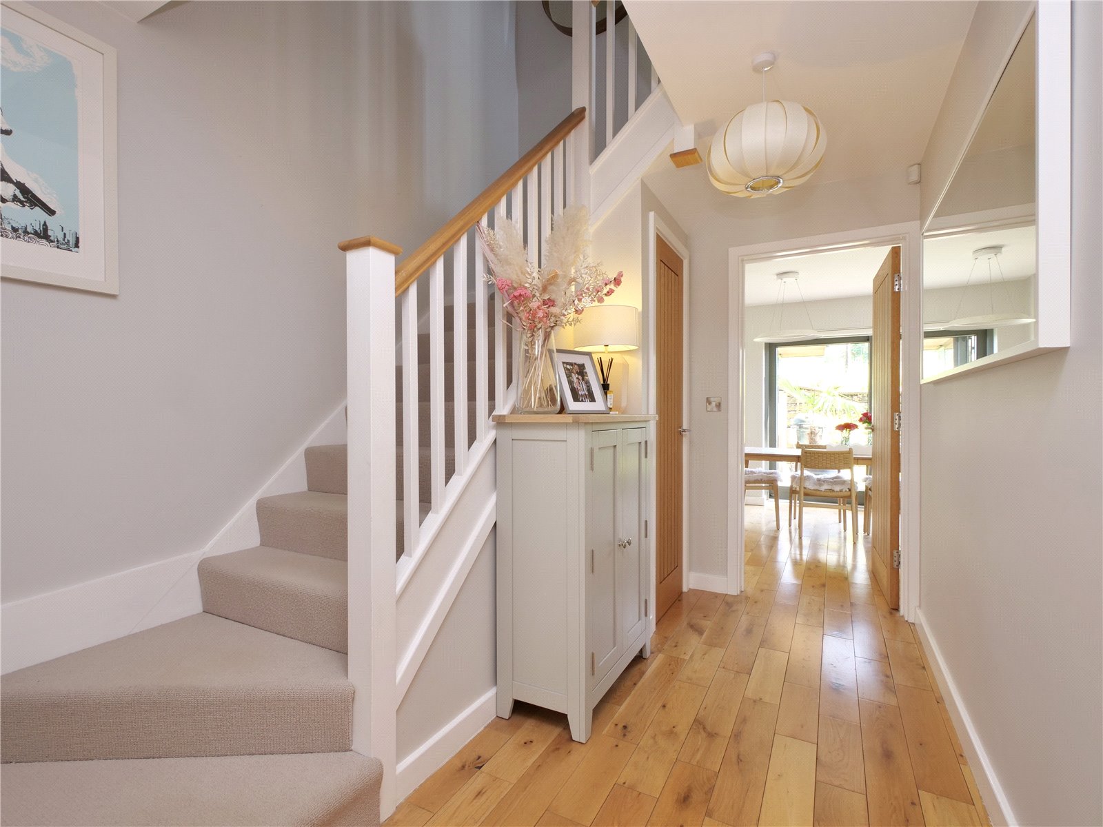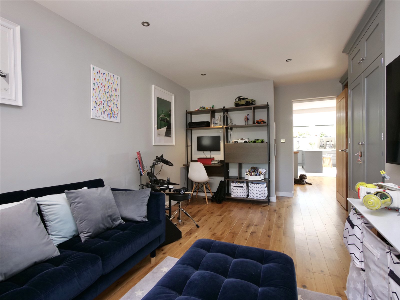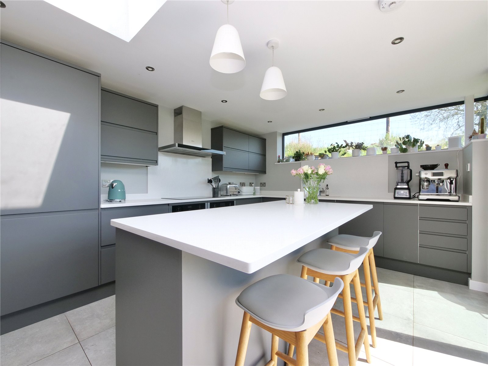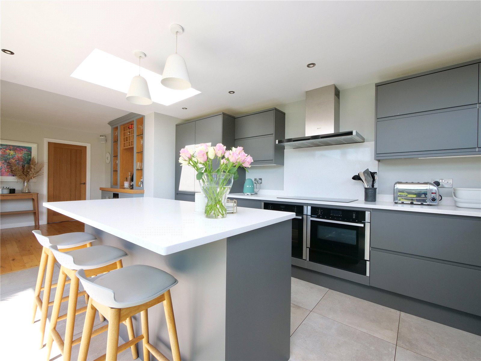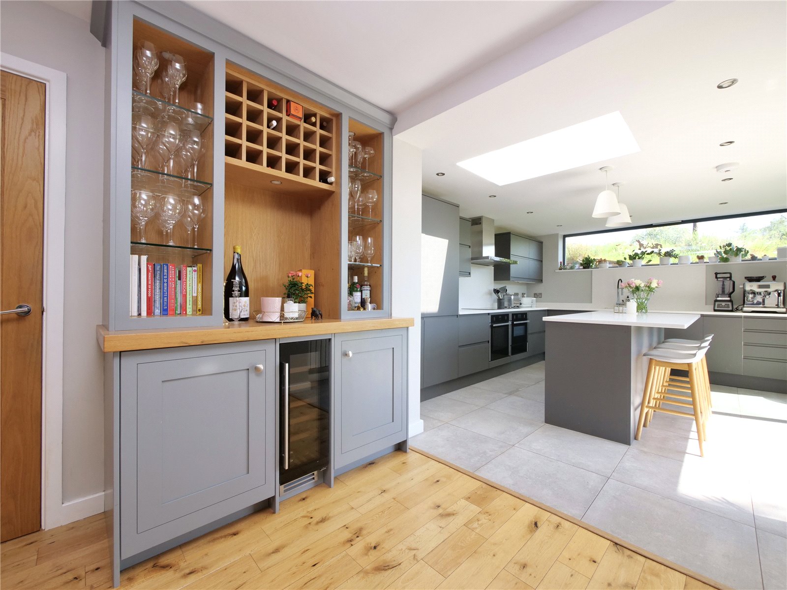 The striking kitchen extension is bathed in natural light from overhead skylights and features sleek, integrated units, built-in appliances, and a large breakfast bar. A bespoke dresser in the dining area discreetly houses a second fridge, freezer, and wine fridge, while a separate utility room keeps laundry tucked away. Off the dining area, a study/playroom overlooks the front, offering a peaceful workspace or snug.