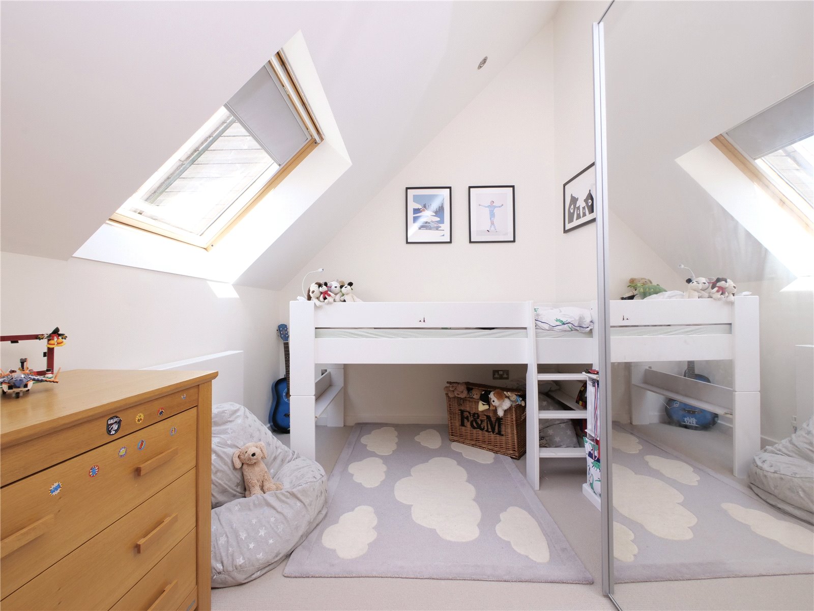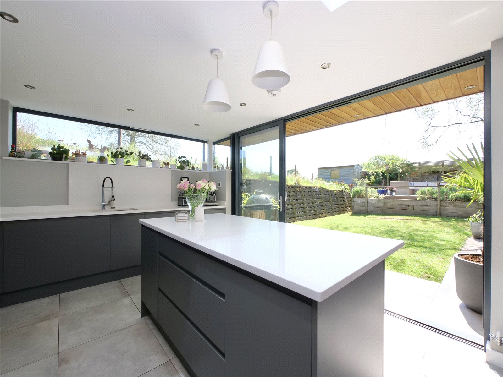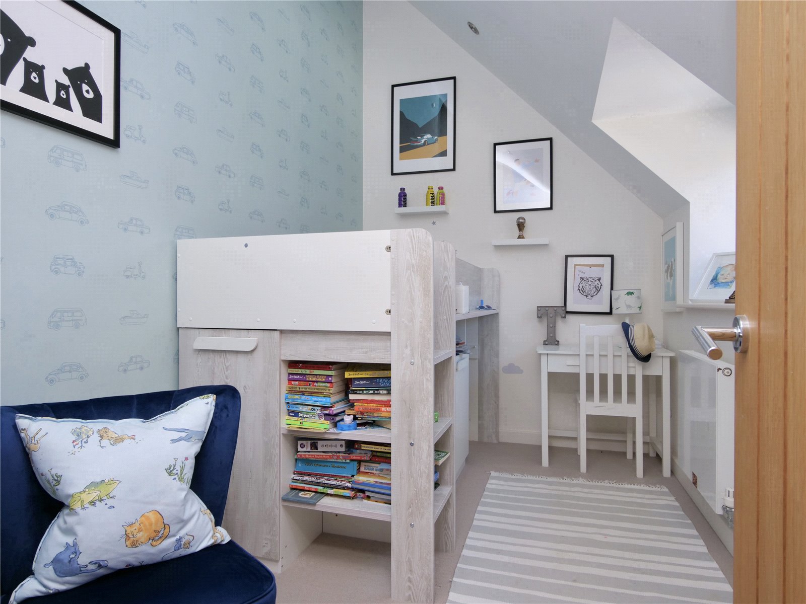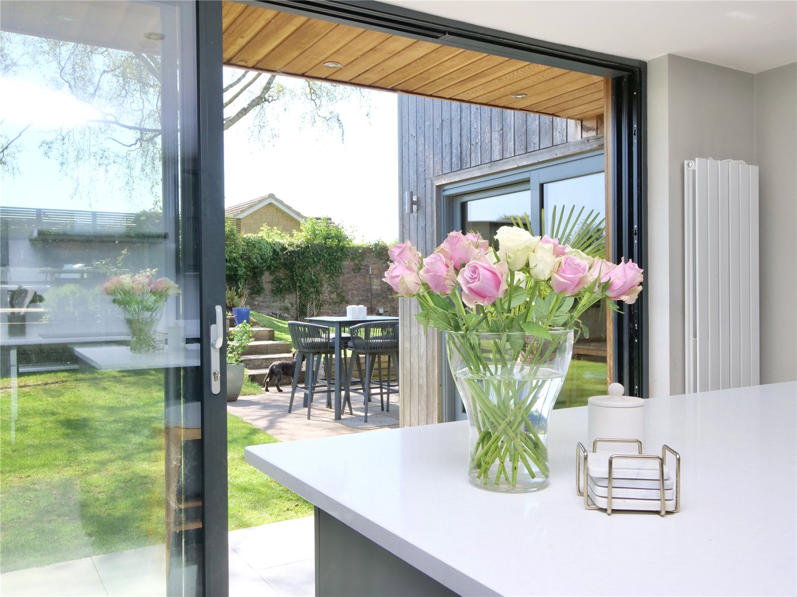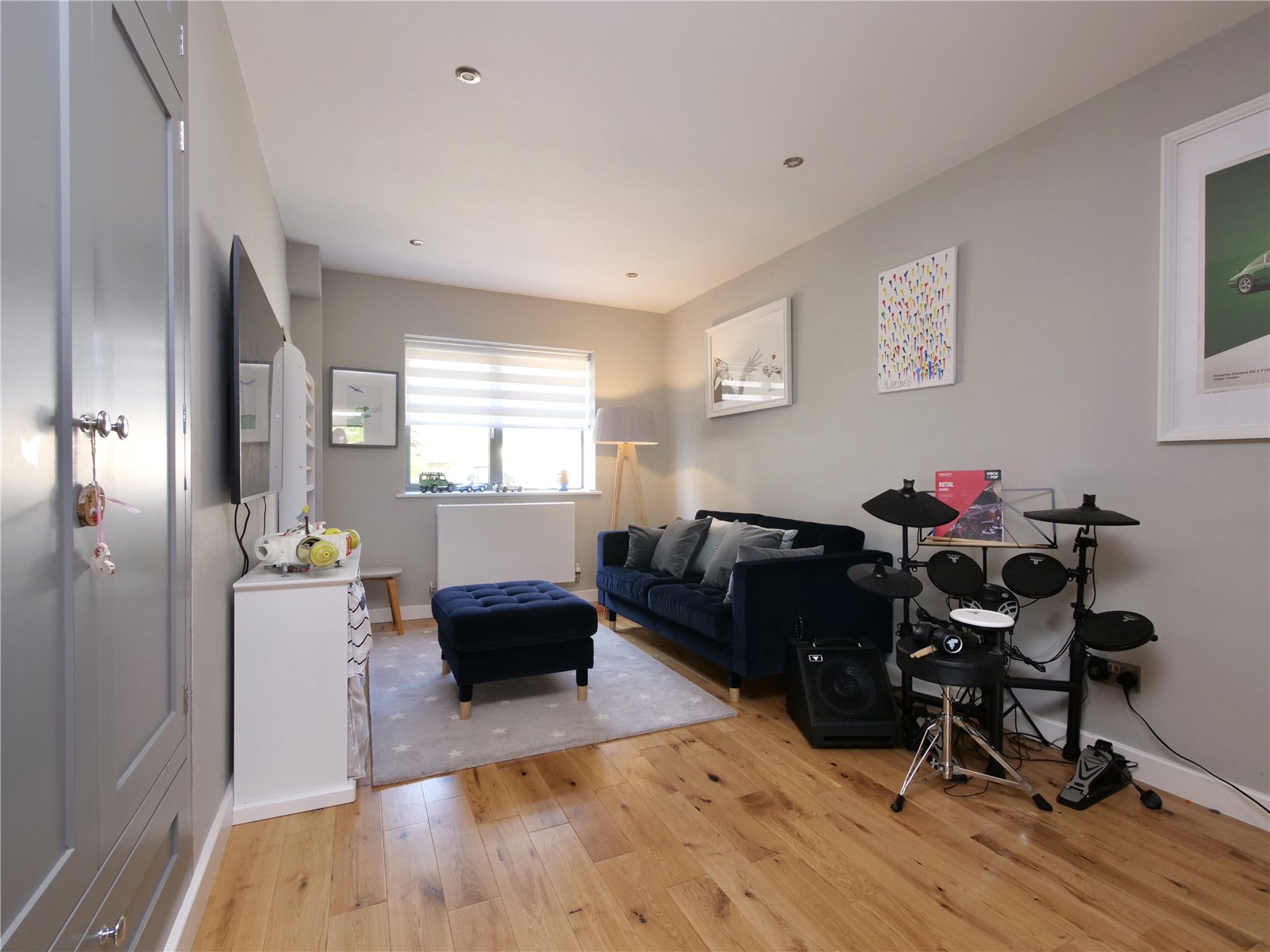 The striking kitchen extension is bathed in natural light from overhead skylights and features sleek, integrated units, built-in appliances, and a large breakfast bar. A bespoke dresser in the dining area discreetly houses a second fridge, freezer, and wine fridge, while a separate utility room keeps laundry tucked away. Off the dining area, a study/playroom overlooks the front, offering a peaceful workspace or snug.