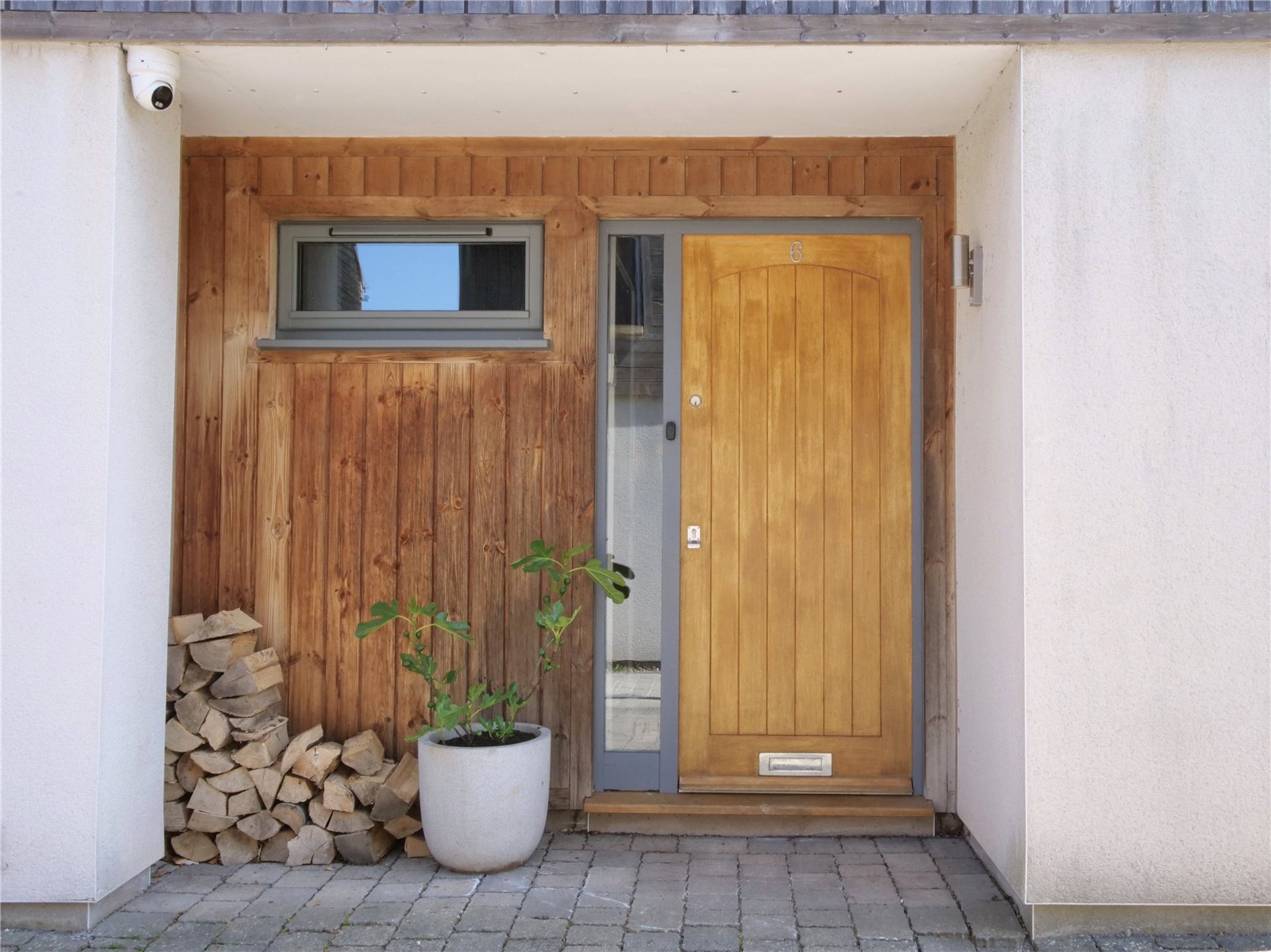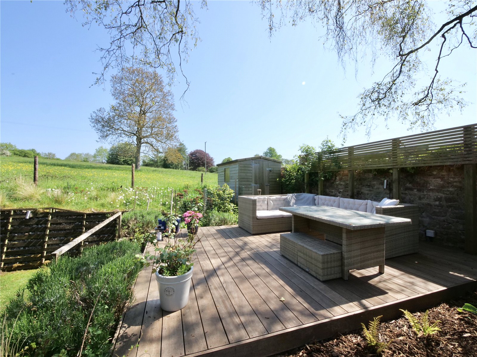 To the front, a paved driveway provides ample off-road parking. The rear garden is fully enclosed and thoughtfully landscaped with lawns, terraced seating areas, and a raised deck beneath a mature birch tree the perfect spot to relax and enjoy the open field views.