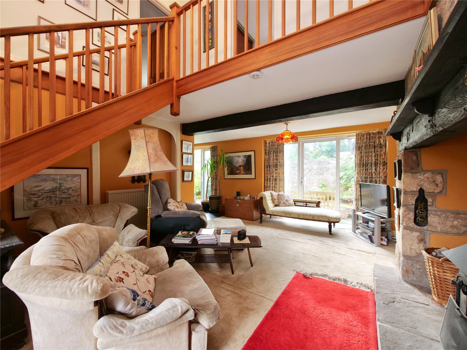 The modest entrance hall, complete with cloakroom, leads into a stunning double-height reception room. Here, an inglenook stone fireplace and galleried landing add character, while large windows and sliding doors bring in natural light and open onto the courtyard garden.