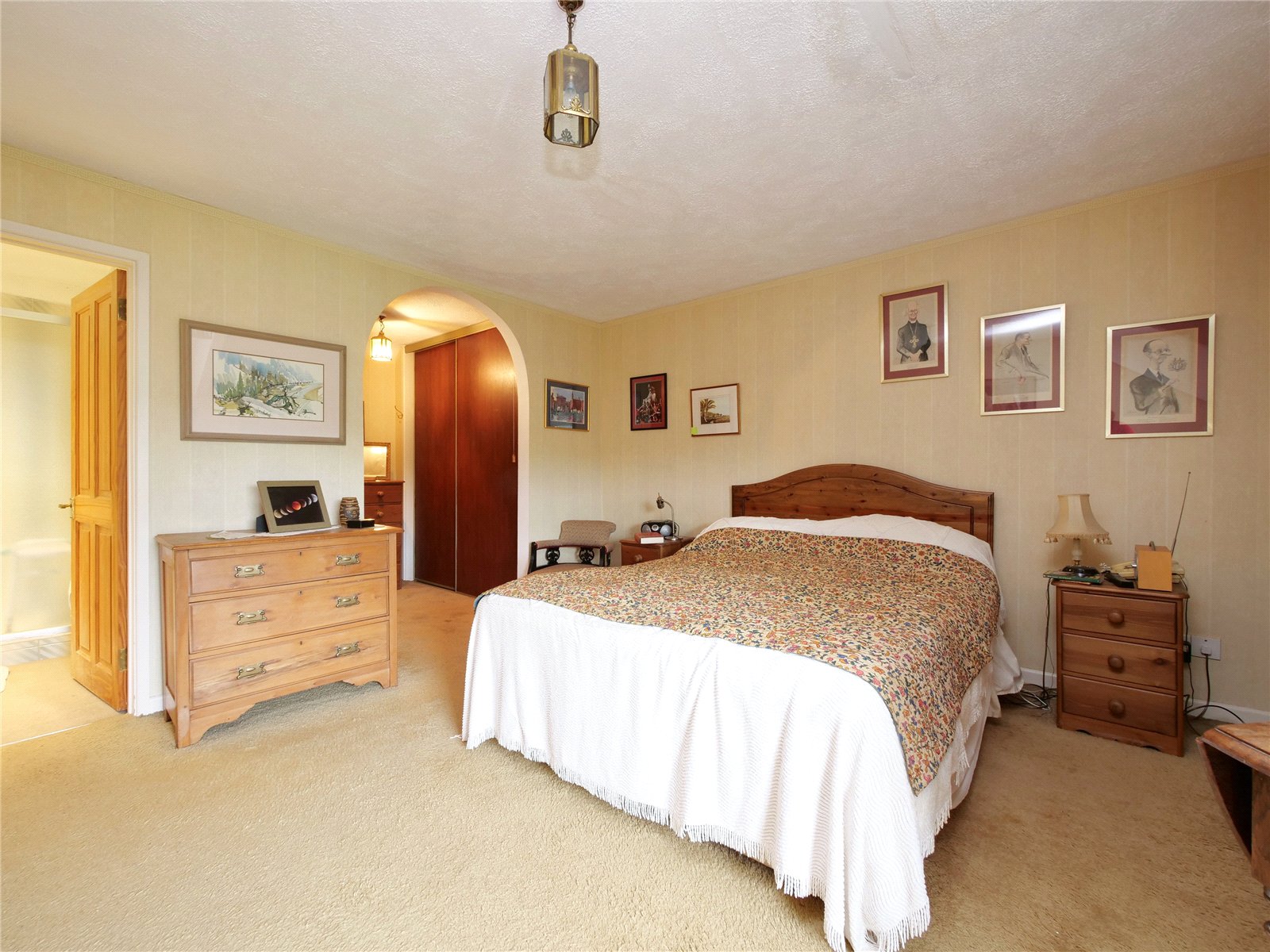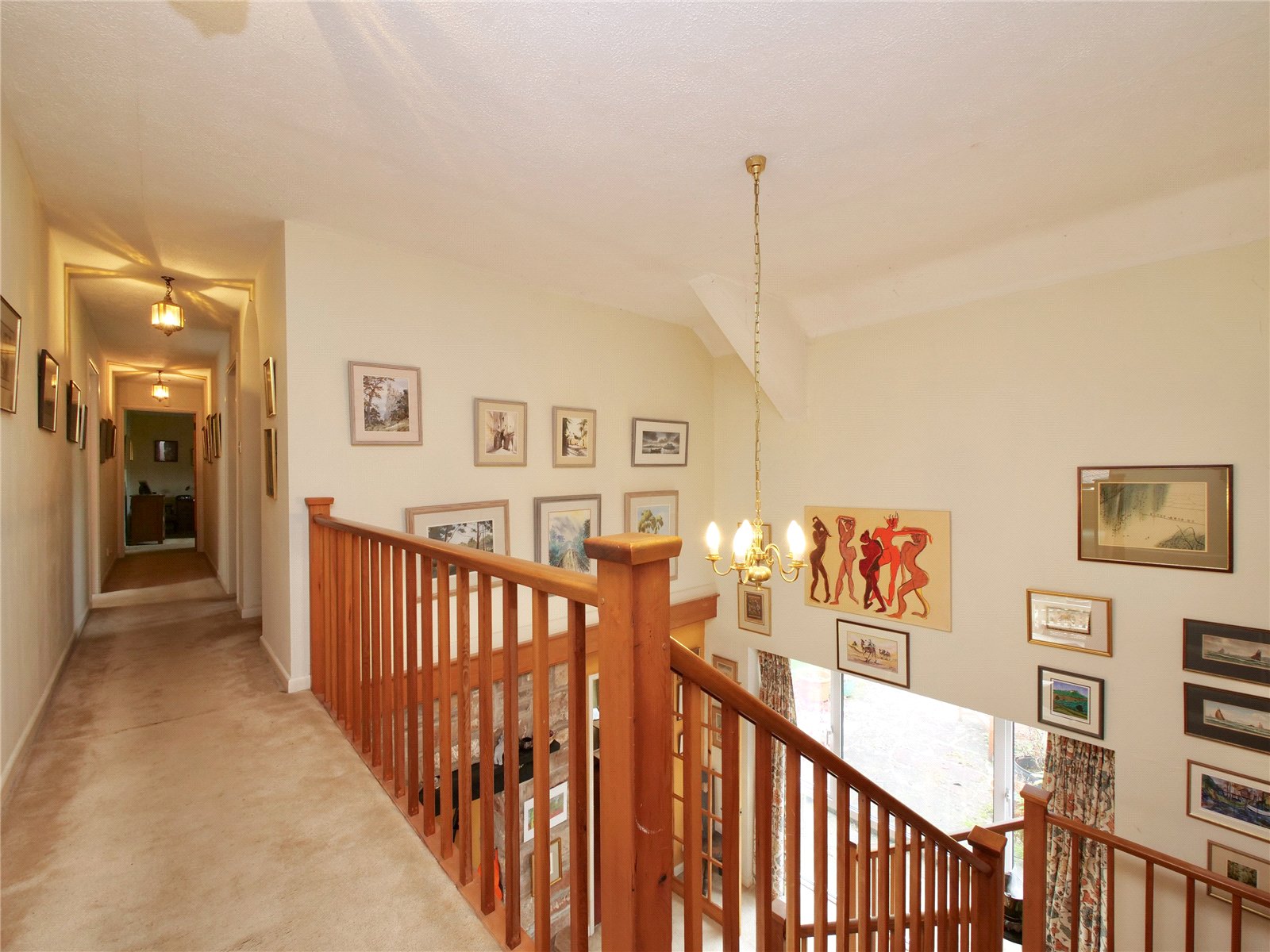 Upstairs, the galleried landing connects the bedrooms. The principal suite features a dressing area and en-suite shower room, mirrored by another en-suite bedroom at the opposite end of the house. Two single bedrooms, a further double, all with fitted wardrobes, and a family bathroom complete the first floor.