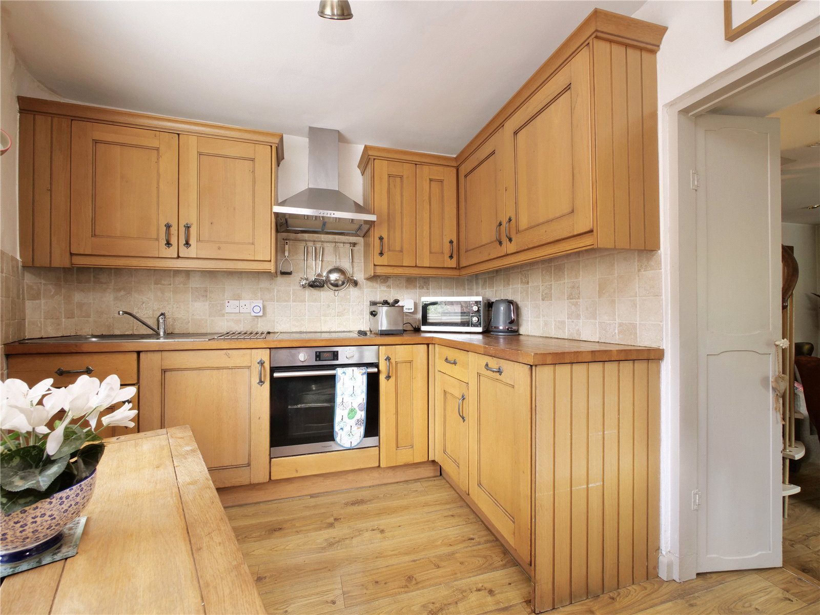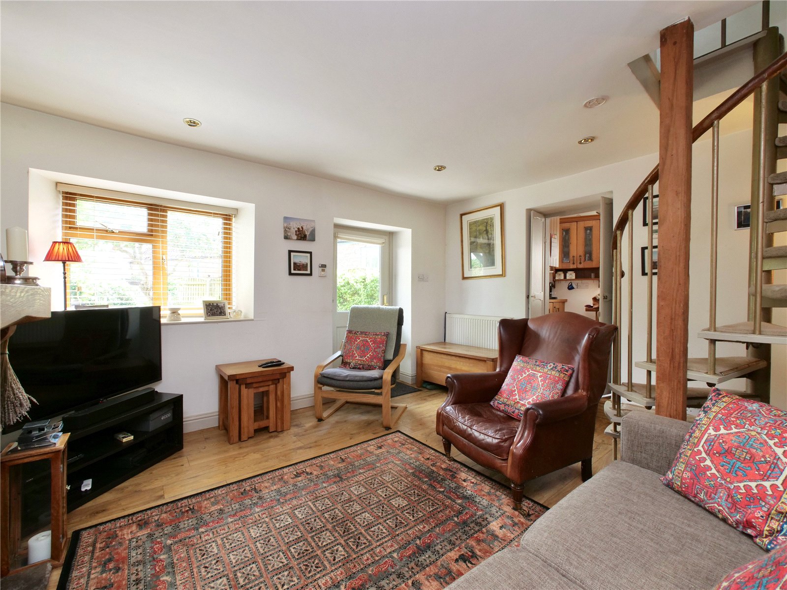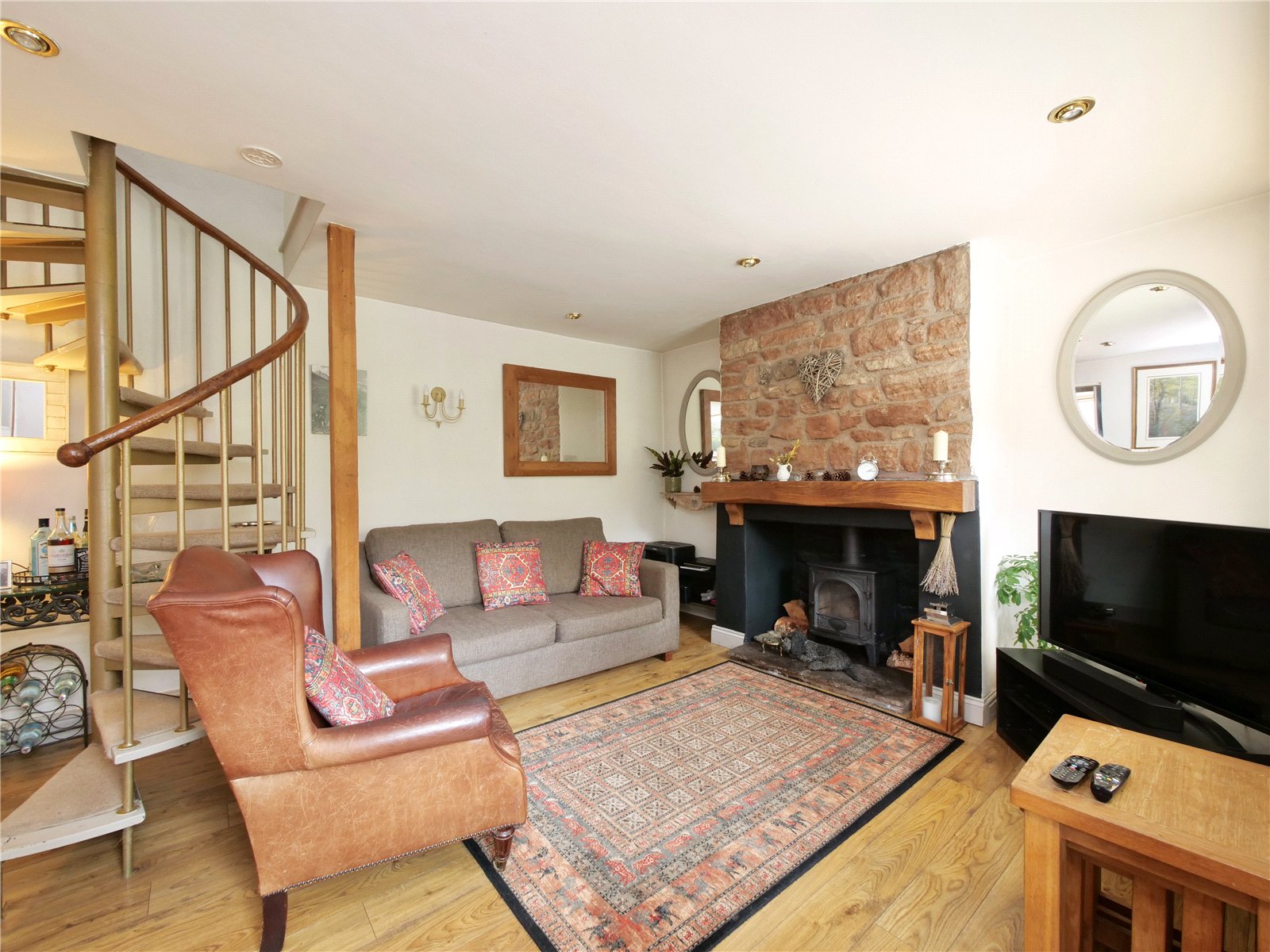 Step into a welcoming living room rich in charm, complete with timber flooring, a wood-burning stove, and a spiral staircase that adds both character and function. The light-filled kitchen enjoys a dual aspect and is thoughtfully fitted with handcrafted timber units housing integrated appliances including a washer/dryer, dishwasher, fridge, and freezer. Upstairs, the main bedroom benefits from built-in wardrobes and a peaceful garden view. A cosy second bedroom and a well-appointed bathroom complete the accommodation.