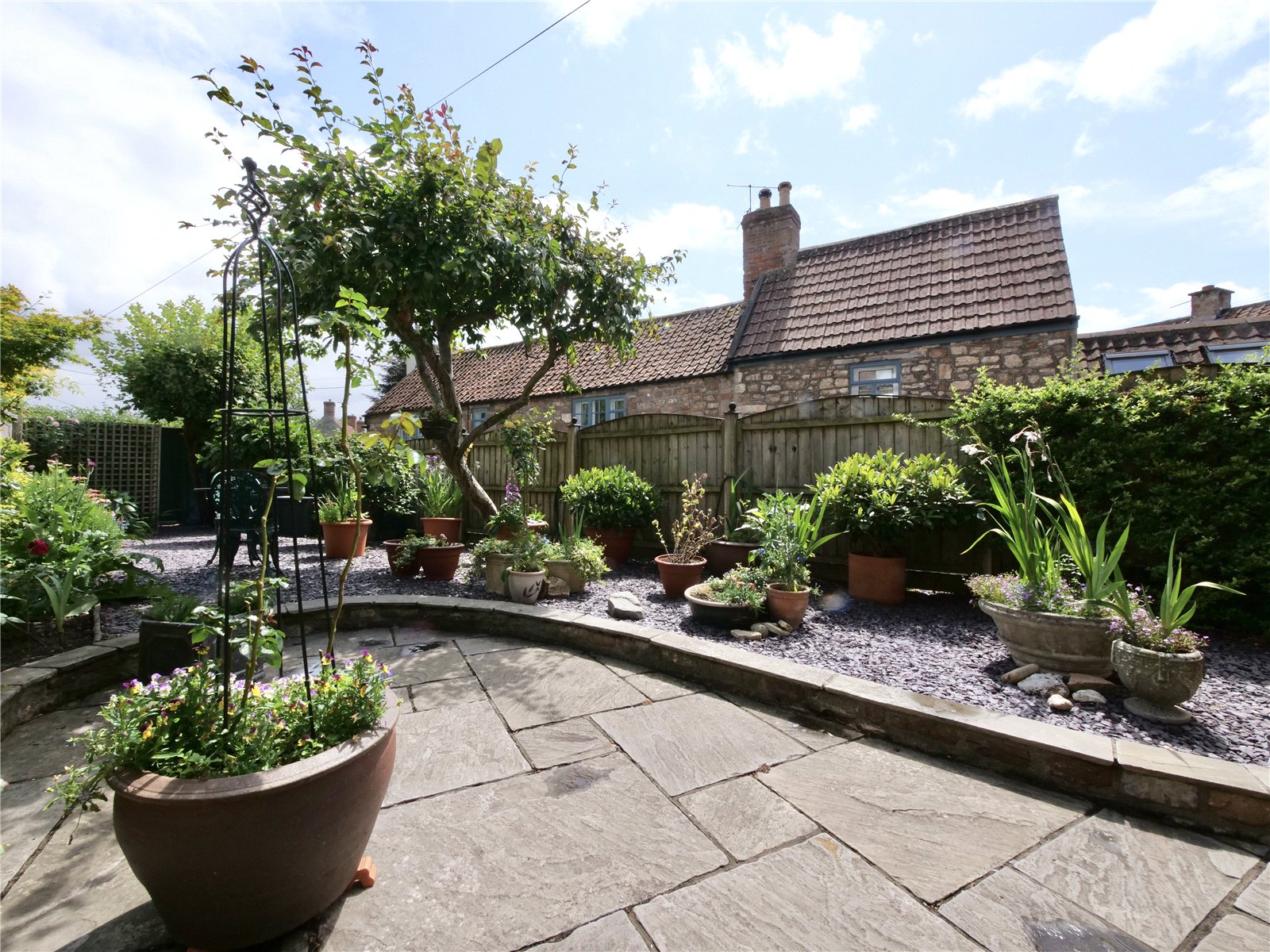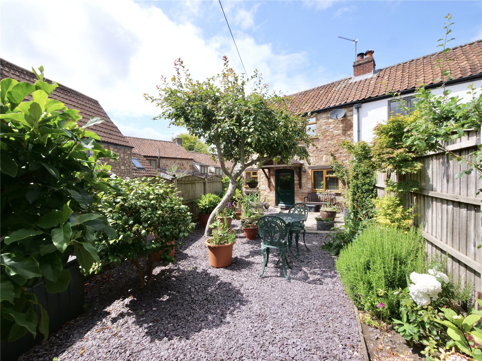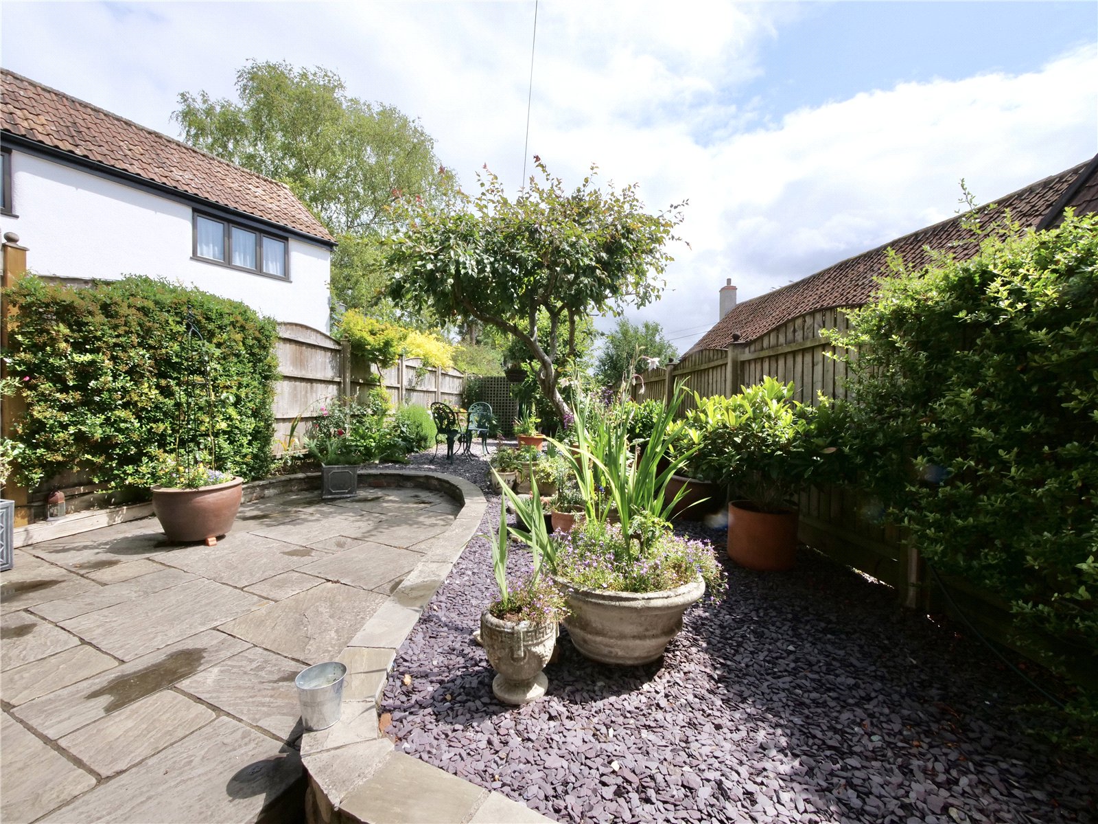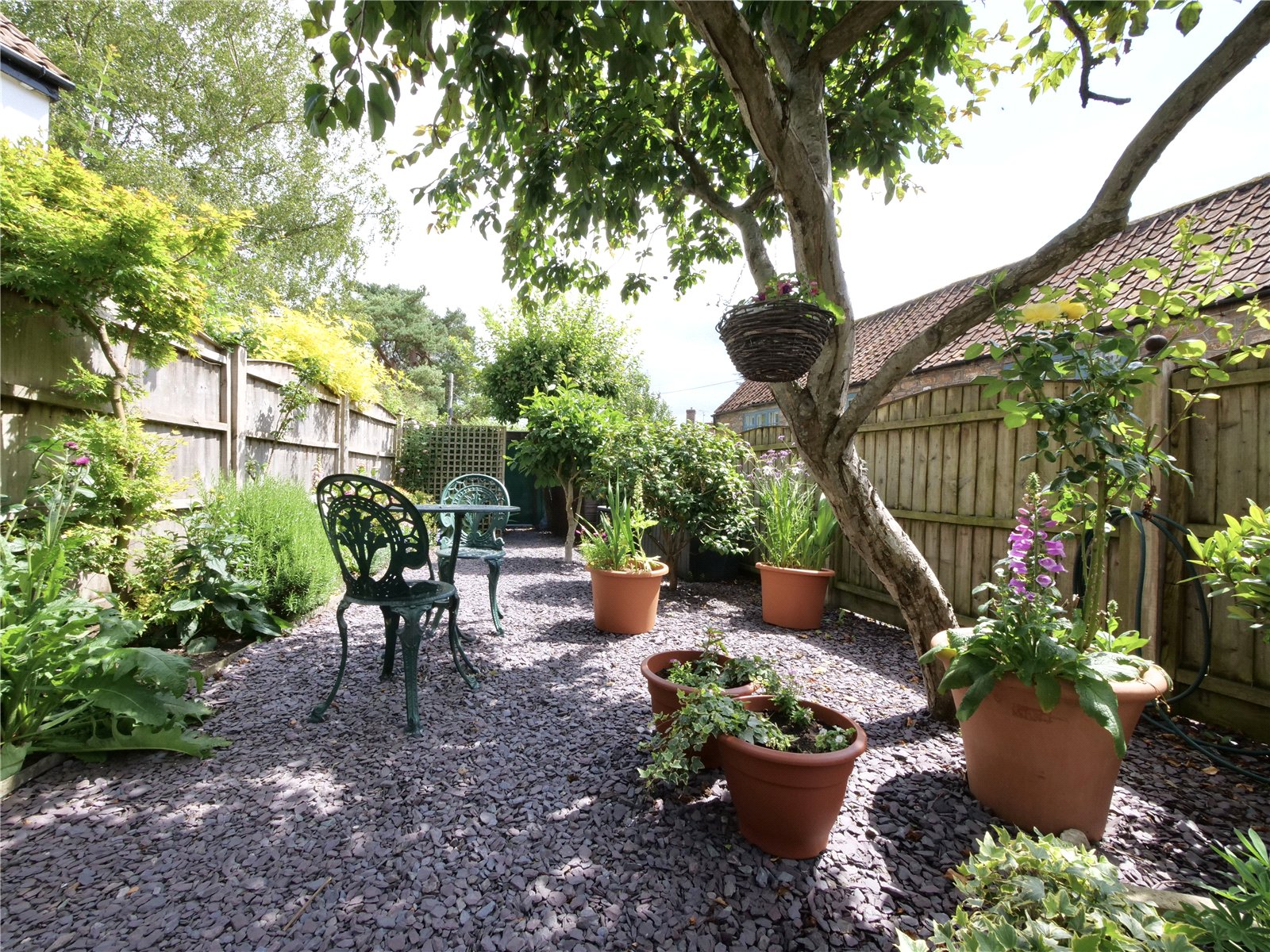A timber gate opens to reveal an elevated, enclosed south-facing gardenlandscaped for ease and enjoyment with slate chippings, flower-filled borders, and a mature cherry tree as a focal point. A paved patio area is perfect for outdoor dining, while discreet garden sheds provide additional storage. A practical undercroft beneath the kitchen includes a useful sink area, ideal for potting or utility use.