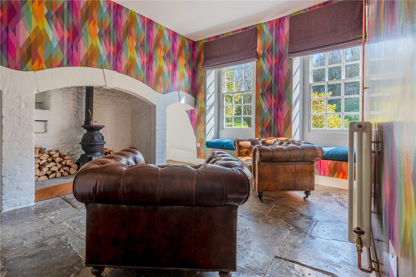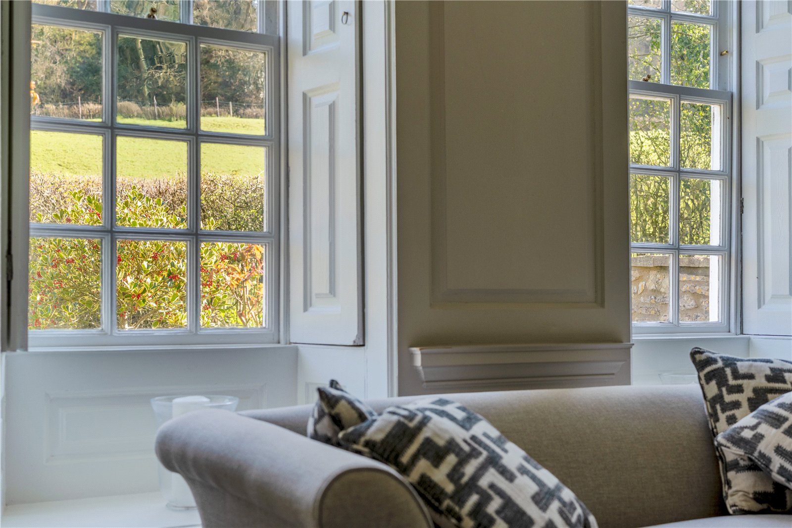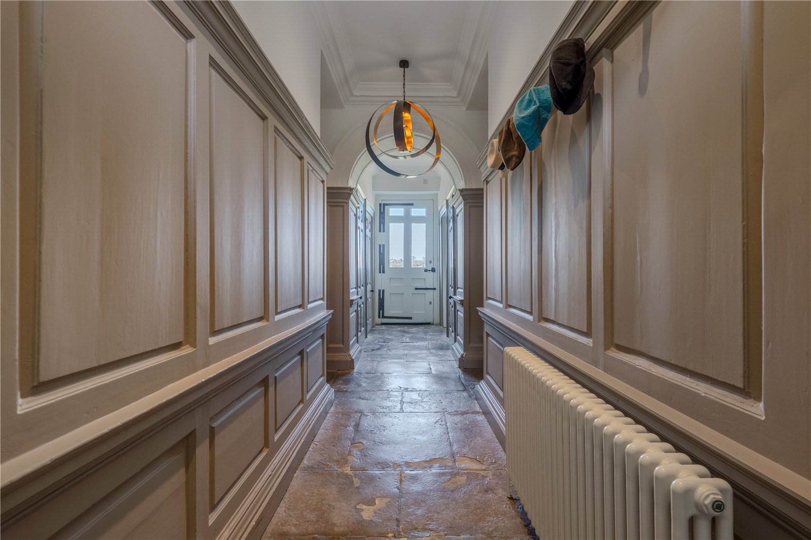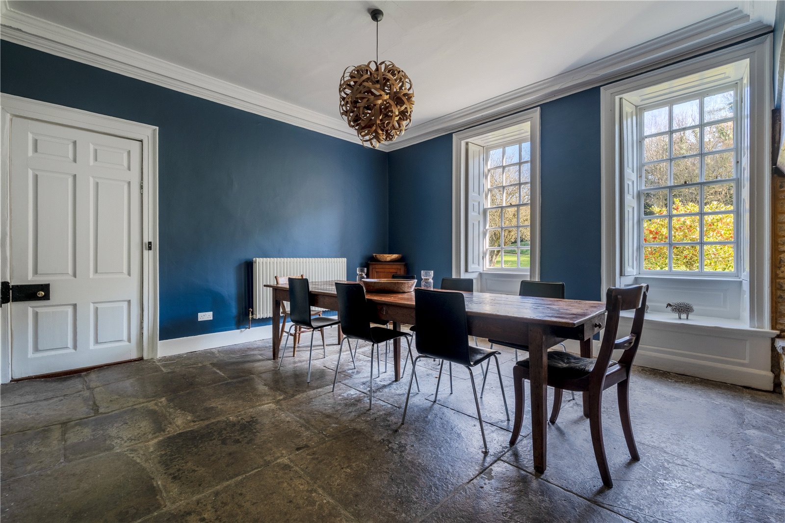 The internal accommodation flows naturally from a central entrance hall, which runs the full depth of the house and draws the eye through to the countryside beyond. To one side, two elegant reception rooms connect via double doors, allowing for both formal separation and open-plan entertaining. These rooms are rich in period detail, with high ceilings, sash windows with shutters, and characterful fireplaces.