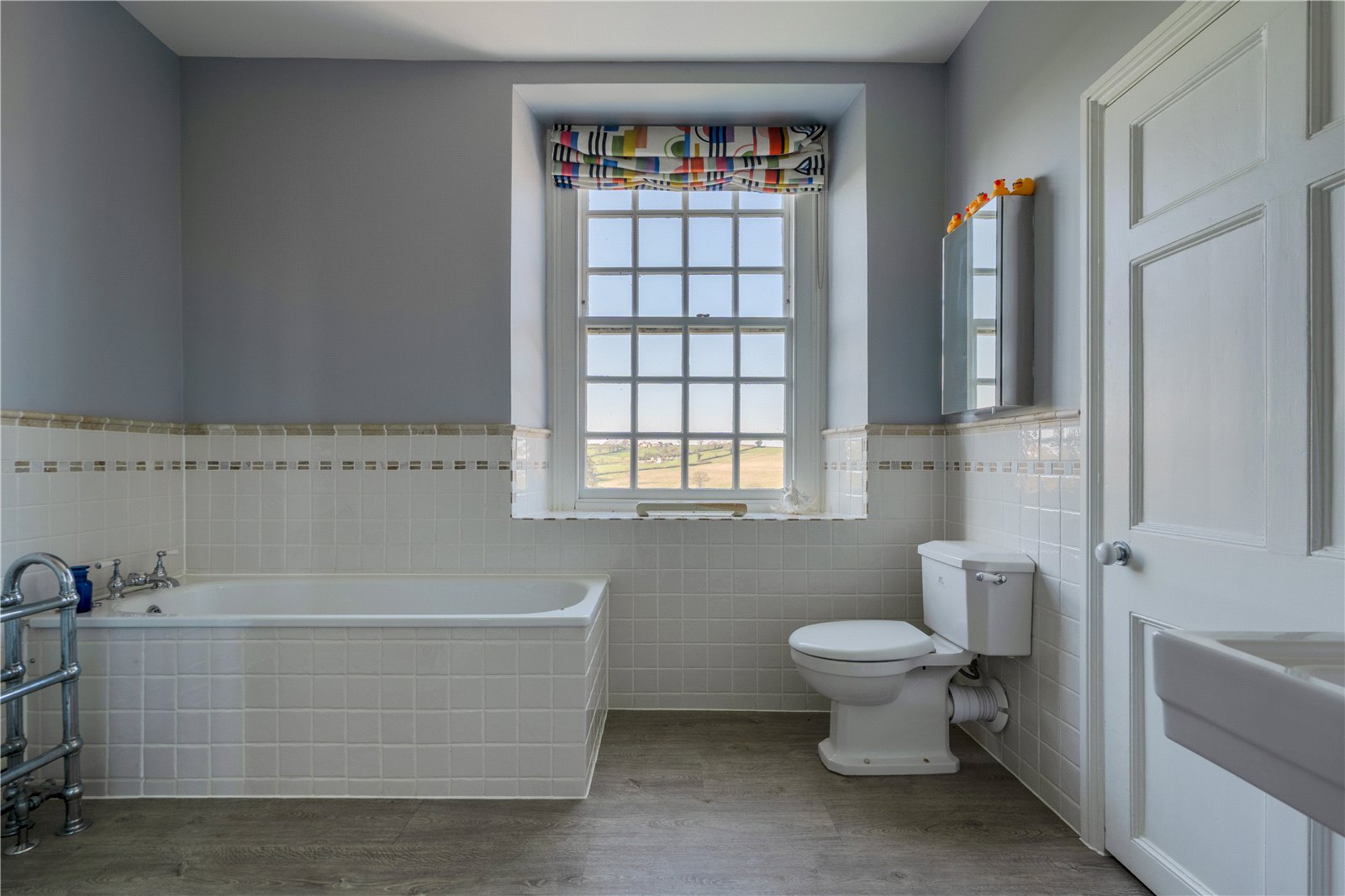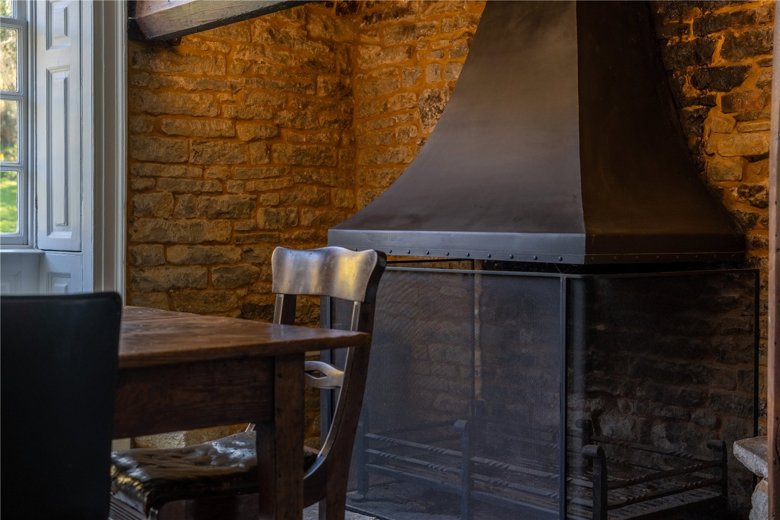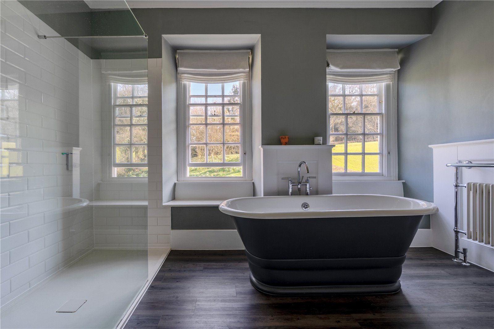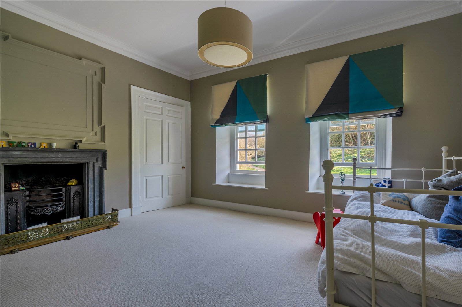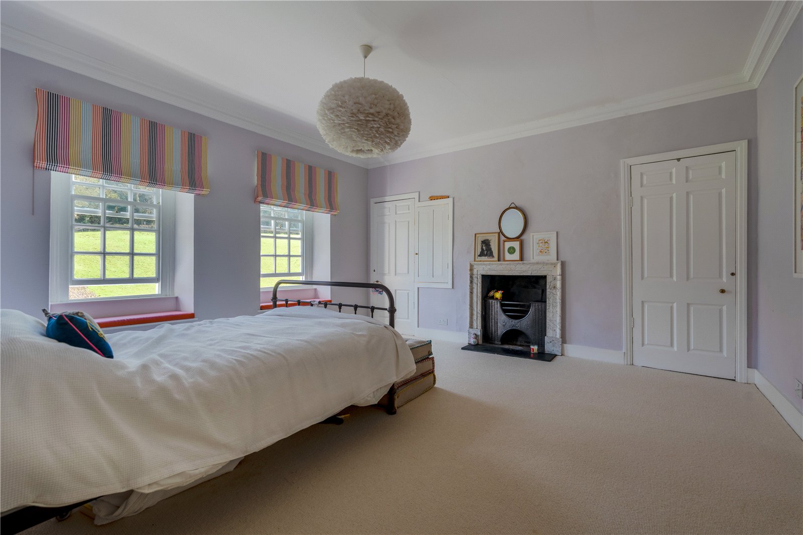 The internal accommodation flows naturally from a central entrance hall, which runs the full depth of the house and draws the eye through to the countryside beyond. To one side, two elegant reception rooms connect via double doors, allowing for both formal separation and open-plan entertaining. These rooms are rich in period detail, with high ceilings, sash windows with shutters, and characterful fireplaces.