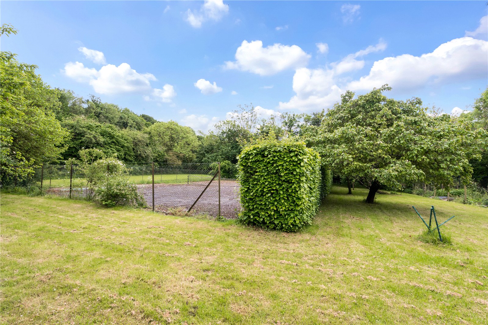 Beyond, the garden continues to include a fruit orchard, kitchen garden, and a tennis court in need of refurbishment. A range of outbuildings, including a barn, extensive garaging, and a coach house with conversion potential, further enhance the versatility of the property.