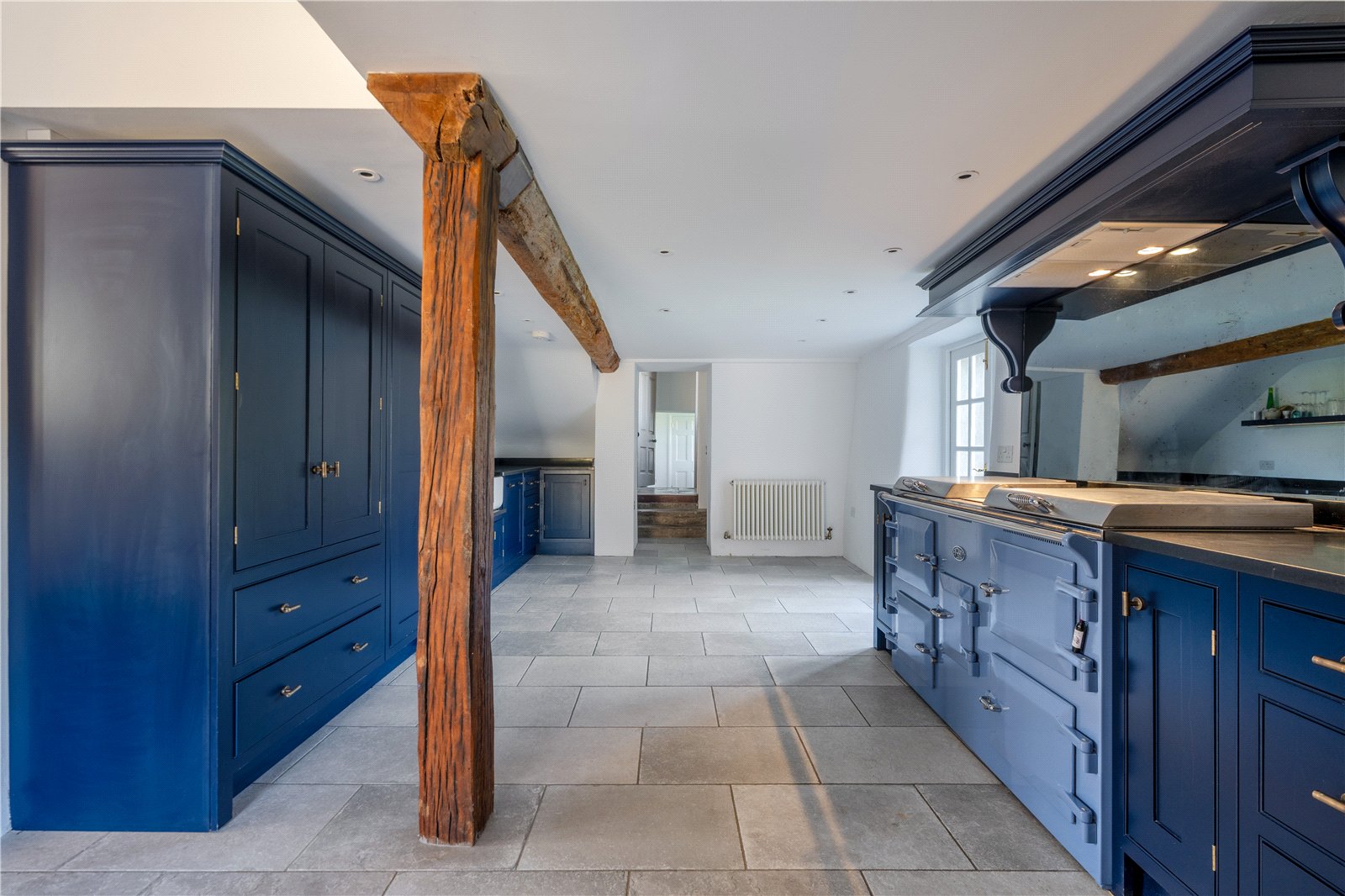 The kitchen sits just beyond, thoughtfully designed with bespoke cabinetry, granite work surfaces, and an Everhot range, complemented by integrated appliances and original features such as a bread oven and water pump. This space connects well to a practical utility and laundry area, with direct access outside. A converted cellar below provides additional versatility, currently used as a games or media room.